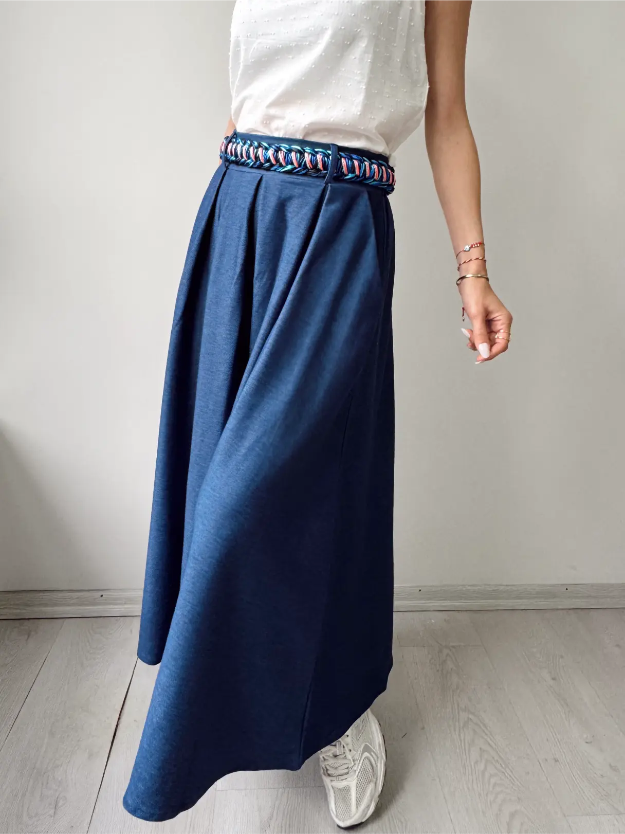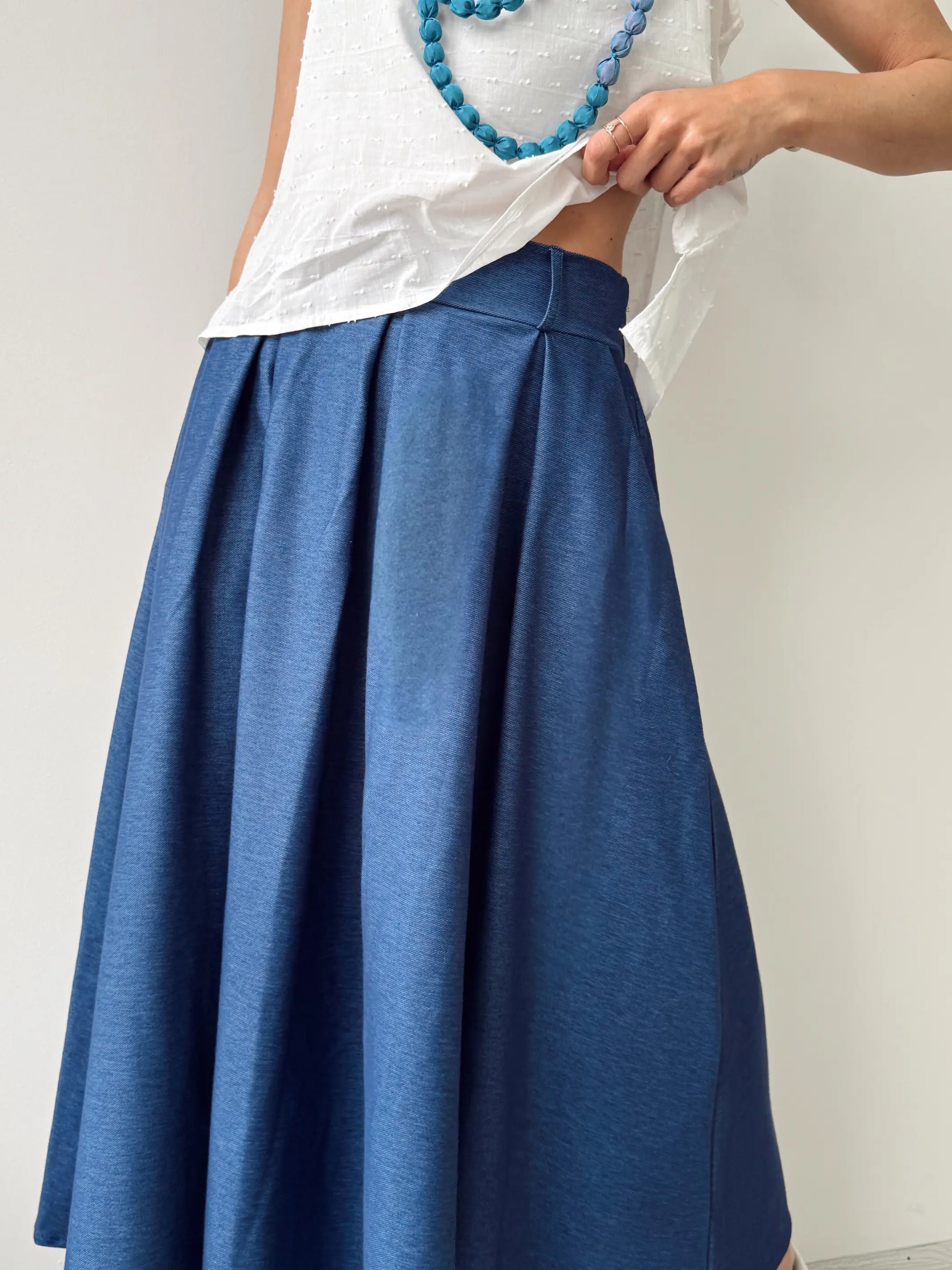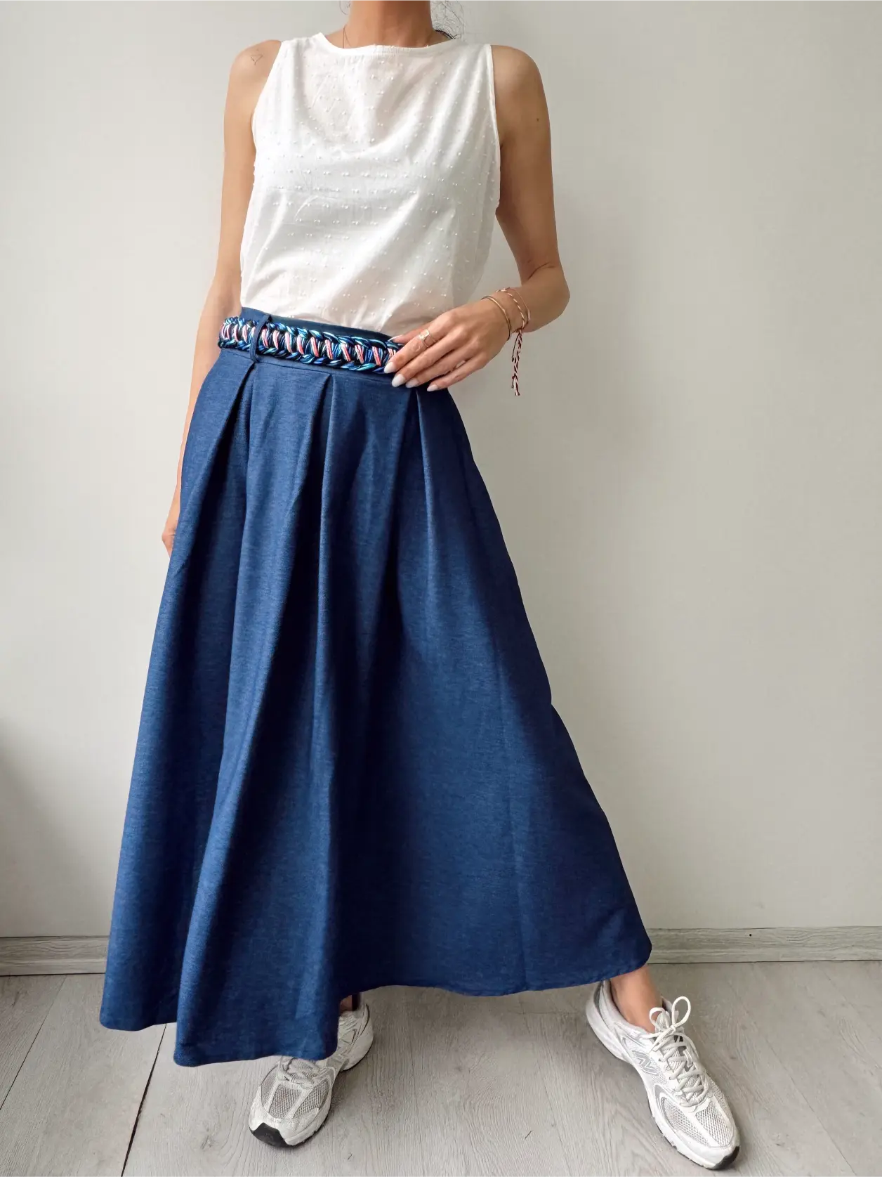 Beli lastikli, Kalýn bel detaylý, pileli, uzun, denim görünümlü, lycralý mavi koton etek