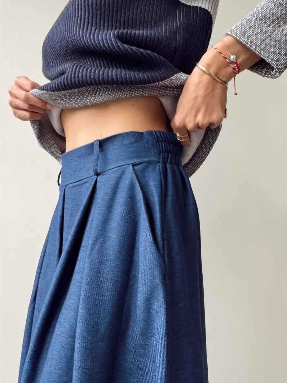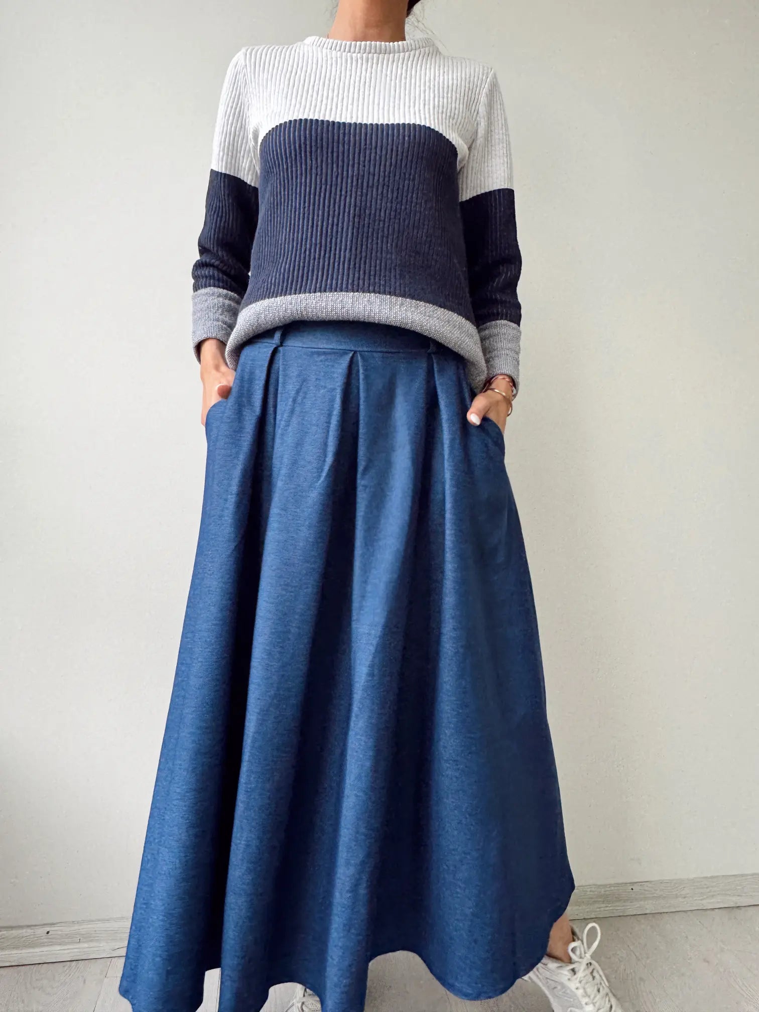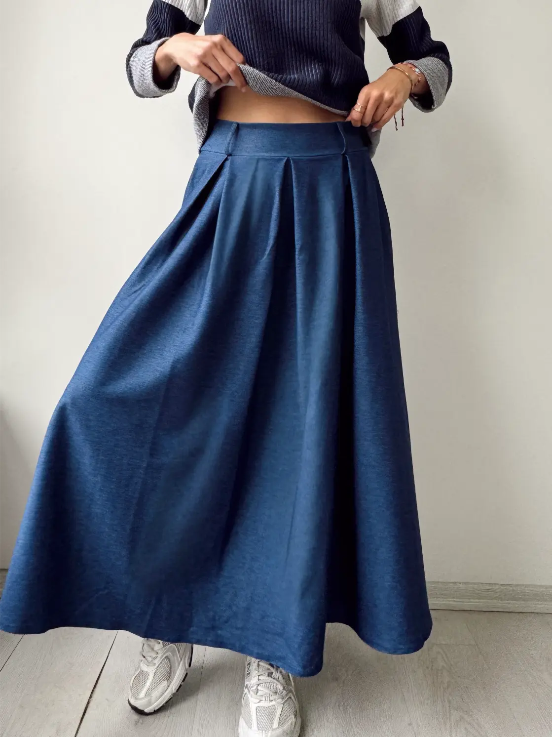 Beli lastikli, Kalýn bel detaylý, pileli, uzun, denim görünümlü, lycralý mavi koton etek