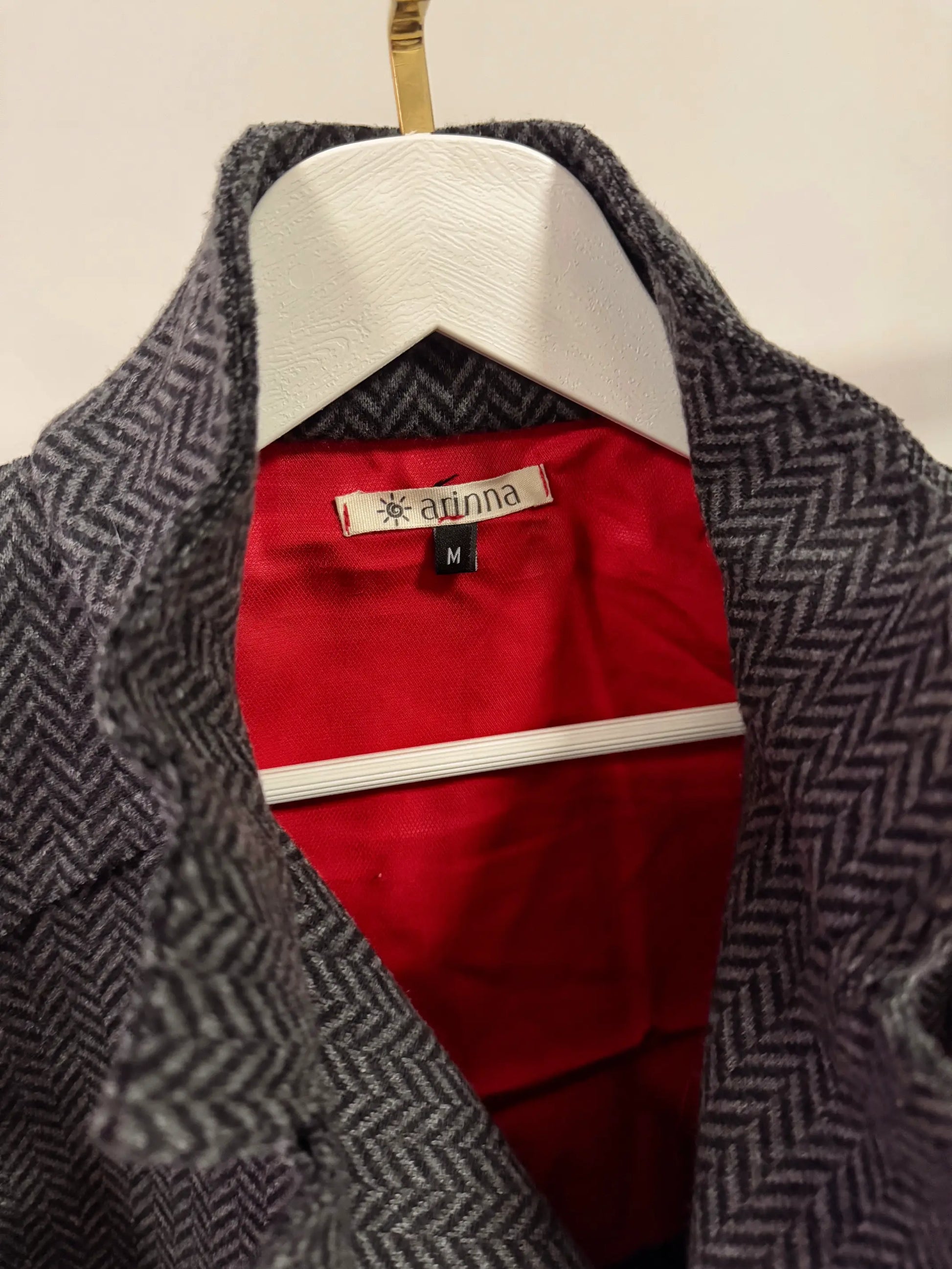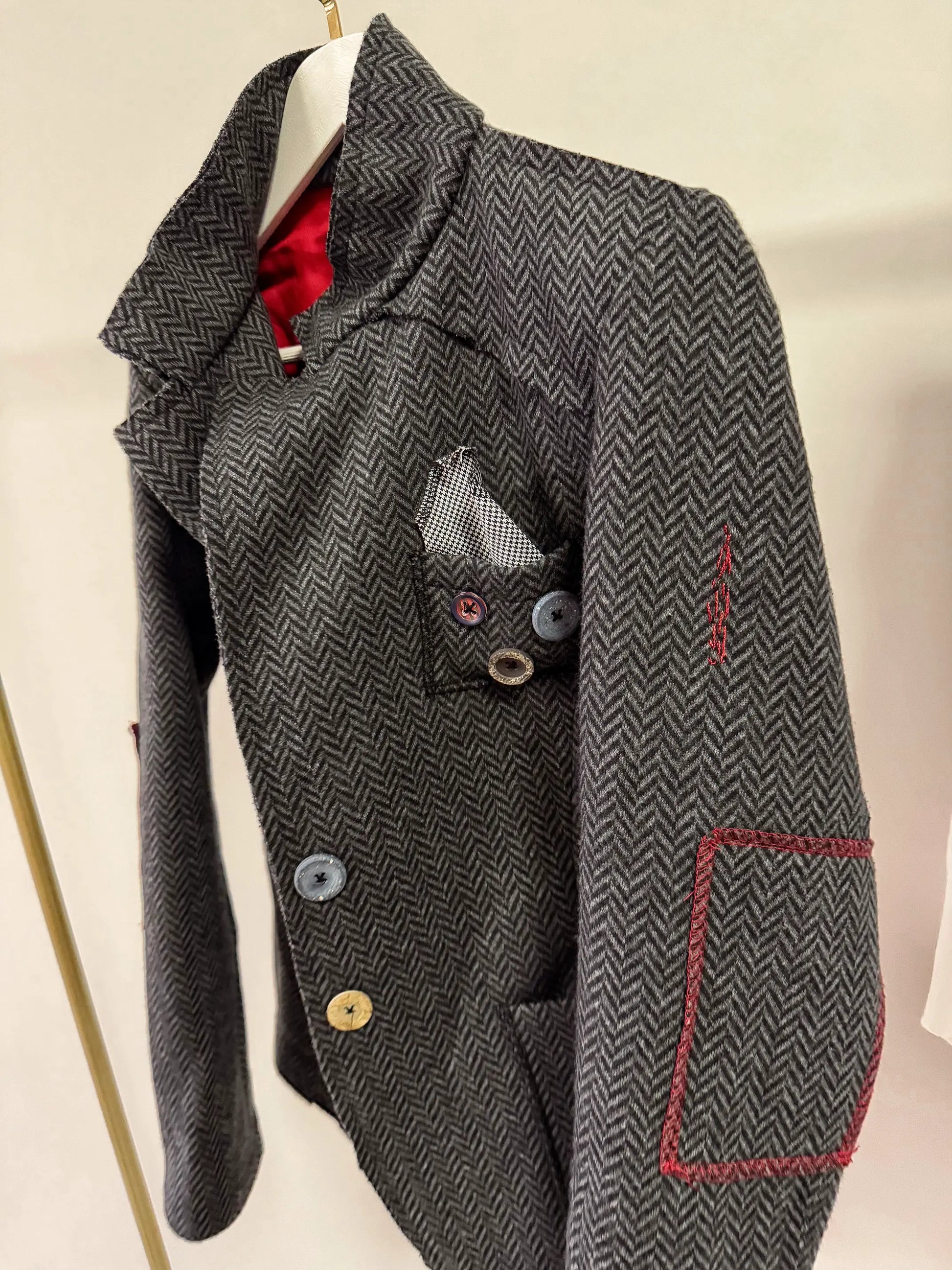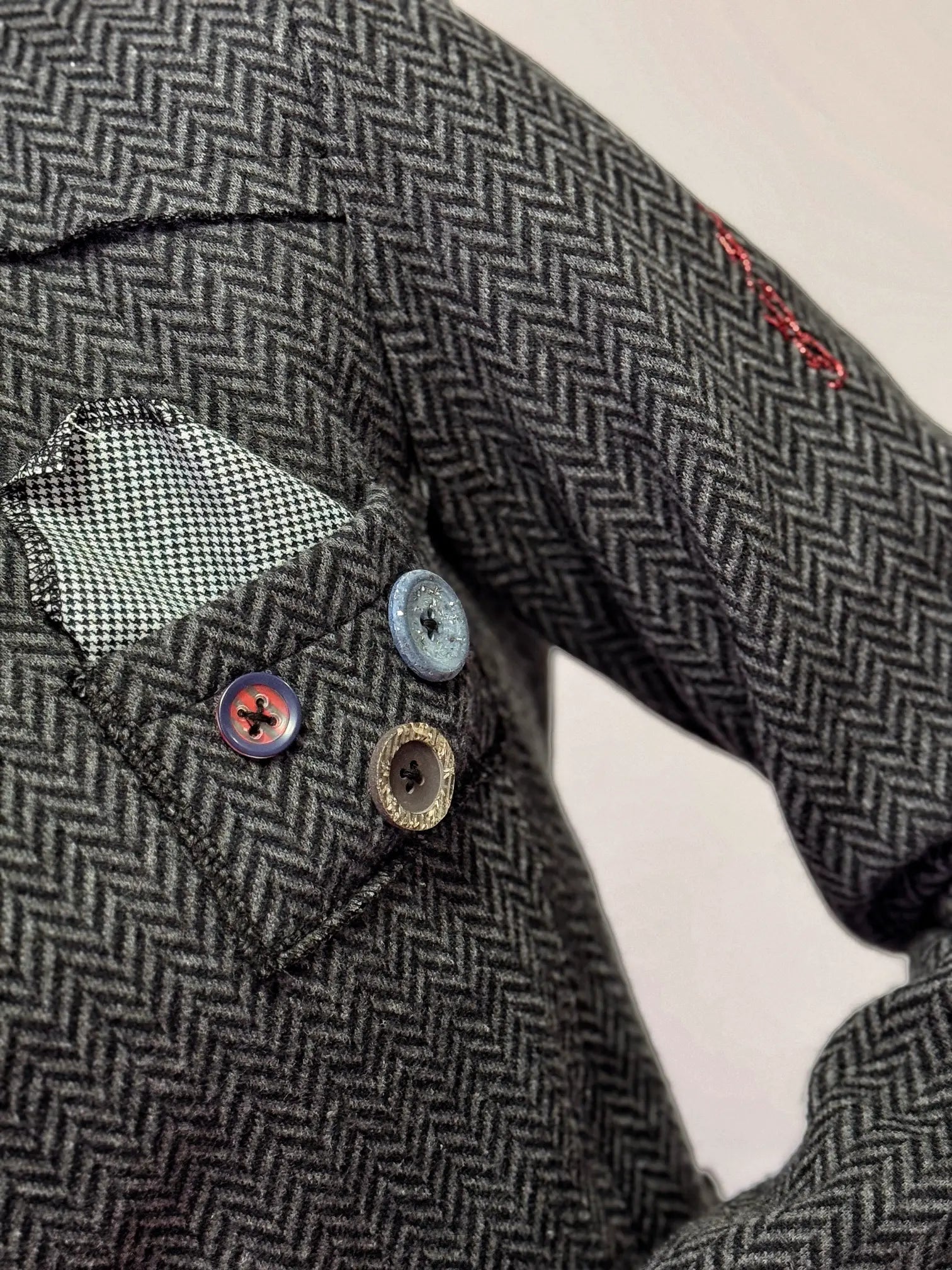 Fit kesim, yaka cebi düğme detaylı, dirsek kısmı kendi kumaşından patchli, sırt iç astarı kırmızı renk kumaş.