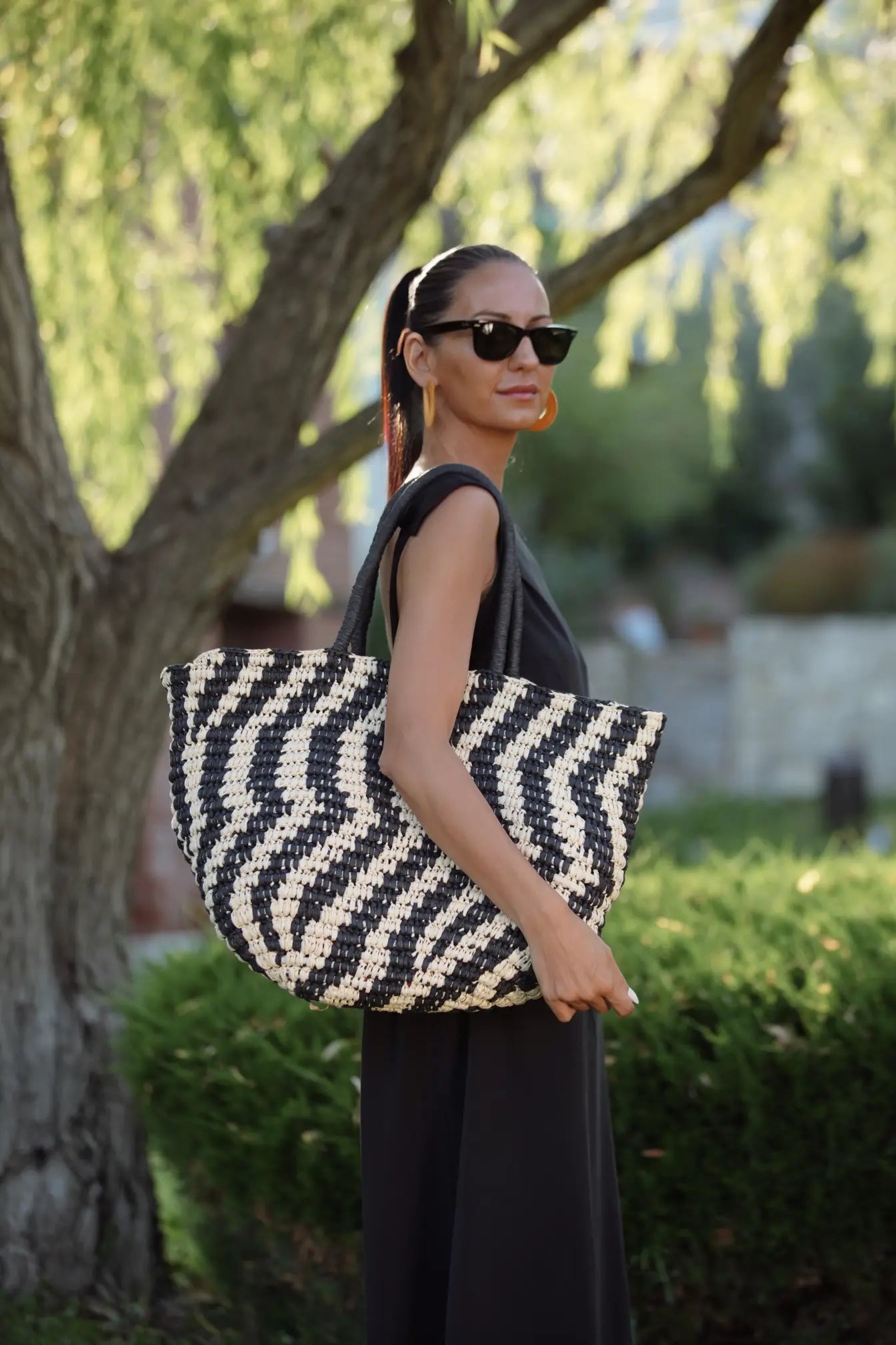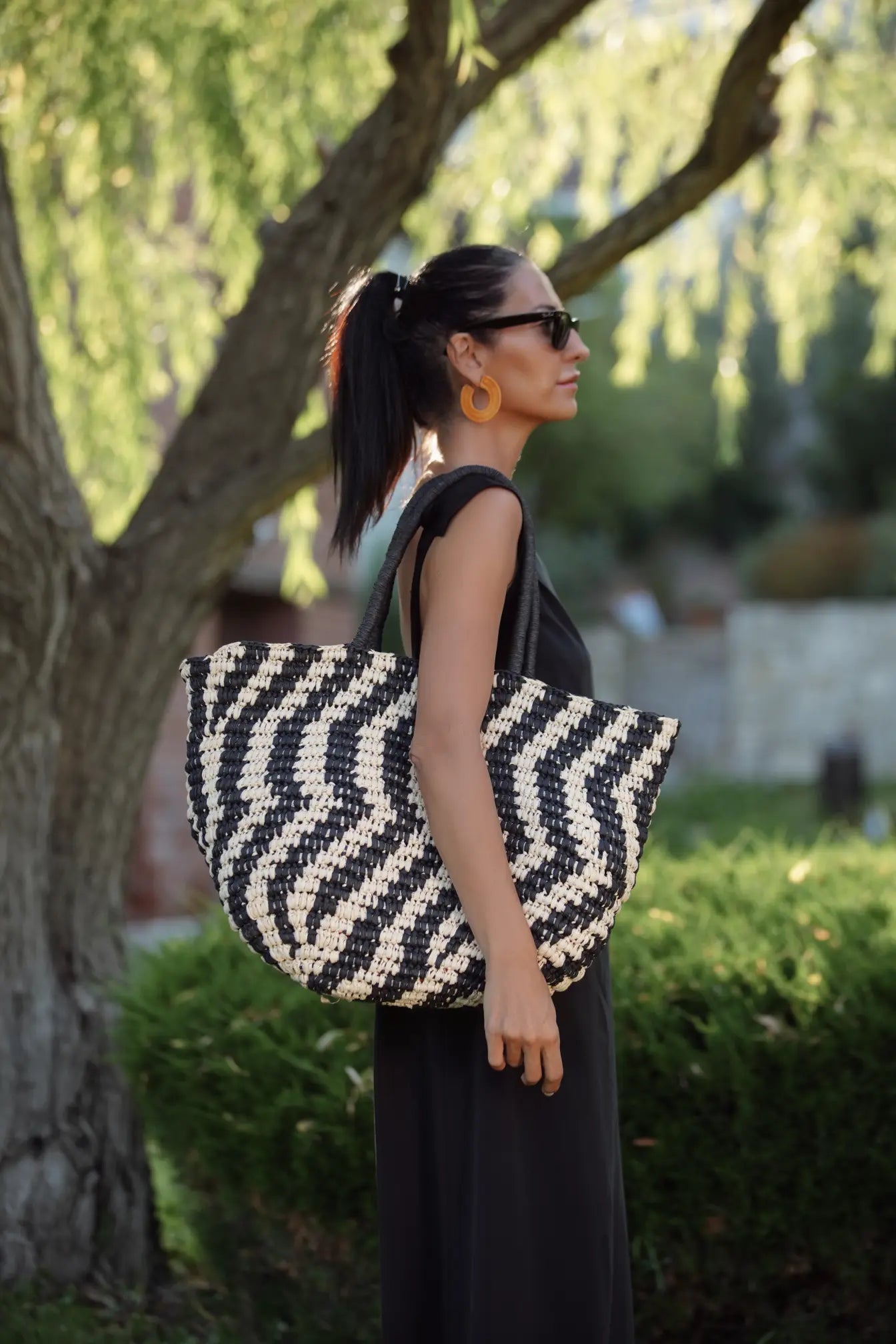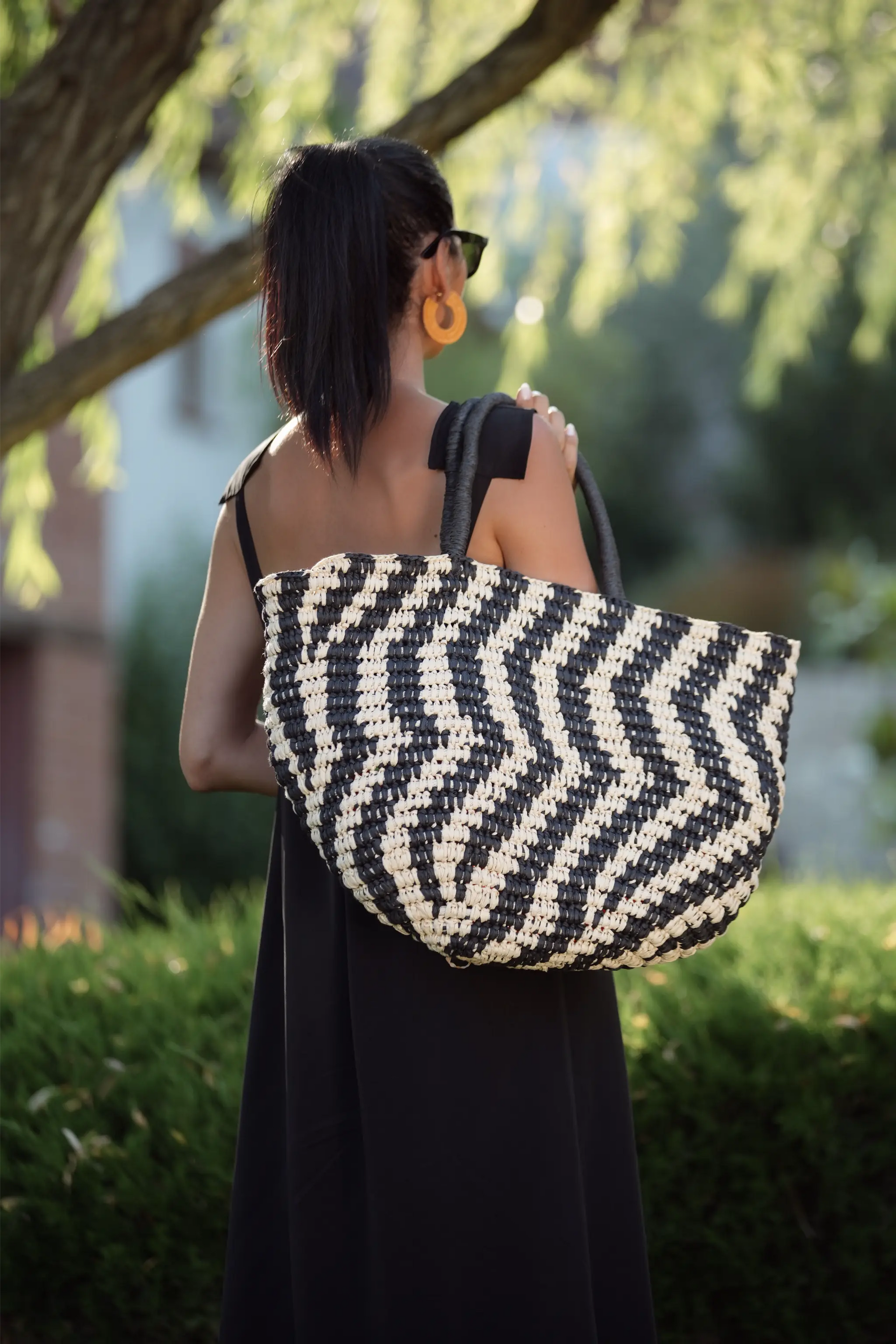 Ýki renkli diagonal, tres ip ve rafya karýþtýrýlarak elde örülmüþ plaj çantasý