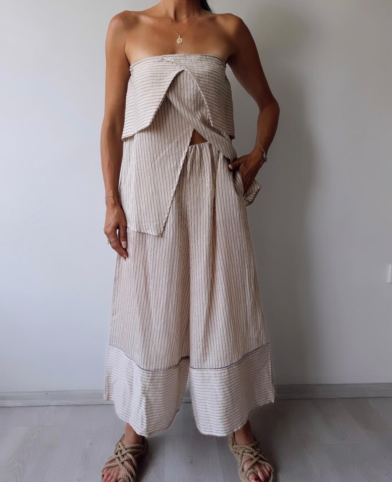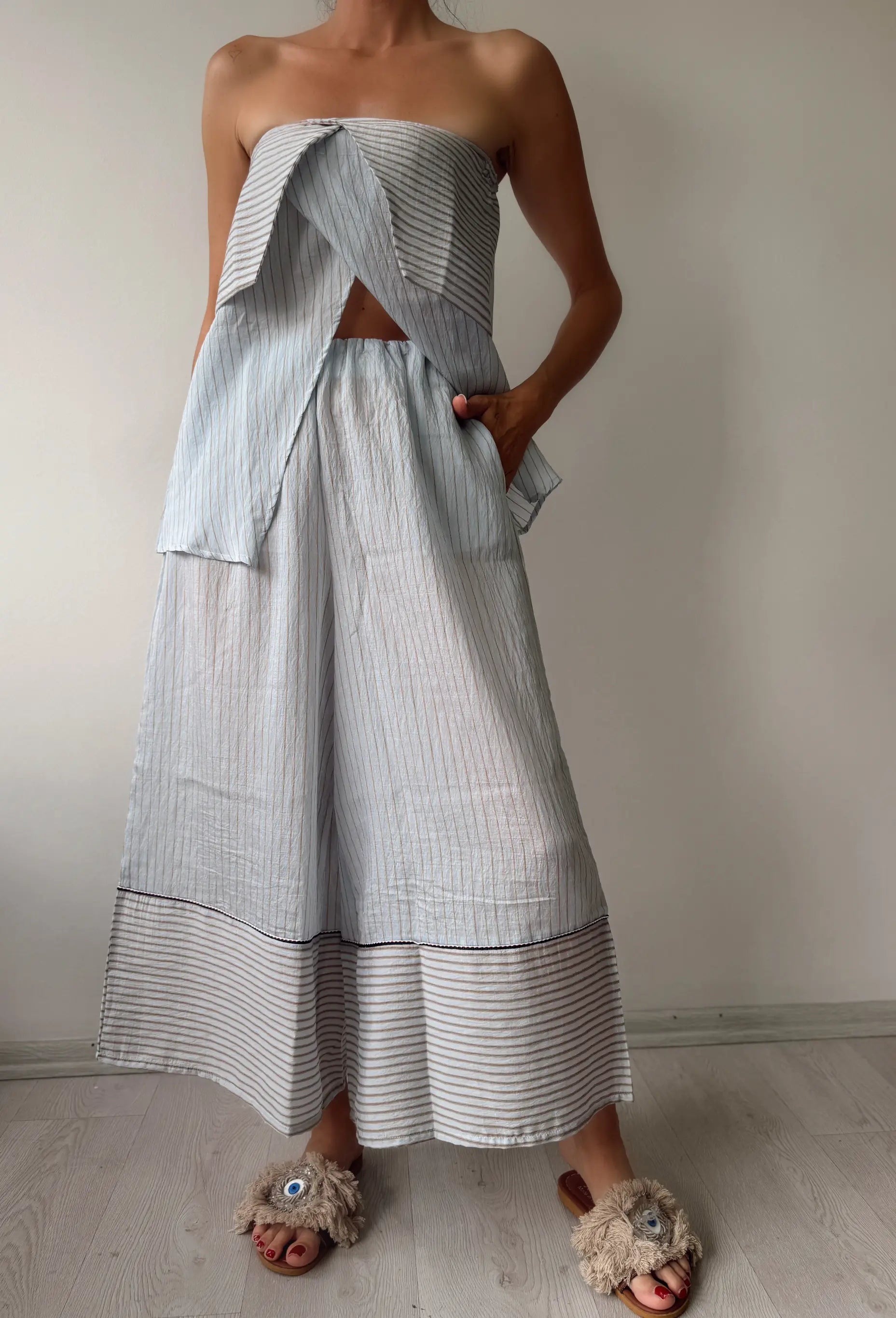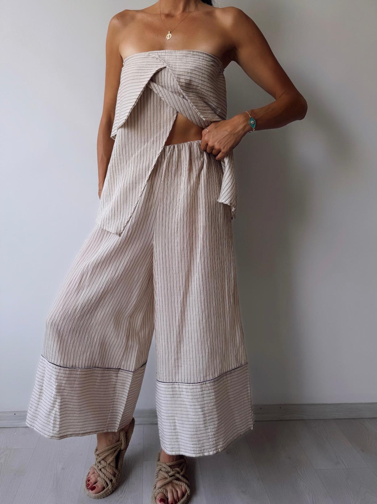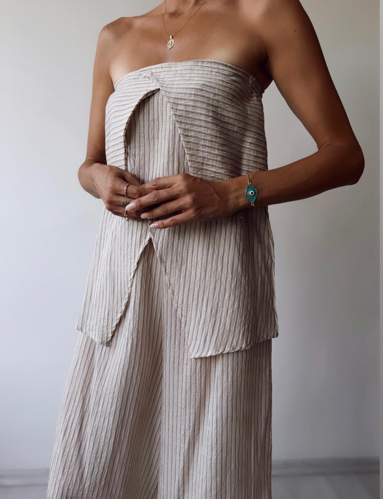 Straplez, önü patlı ince modal bluz ve geniş paça,biyeli,ara boy, beli lastikli rahat kesim pantolon.