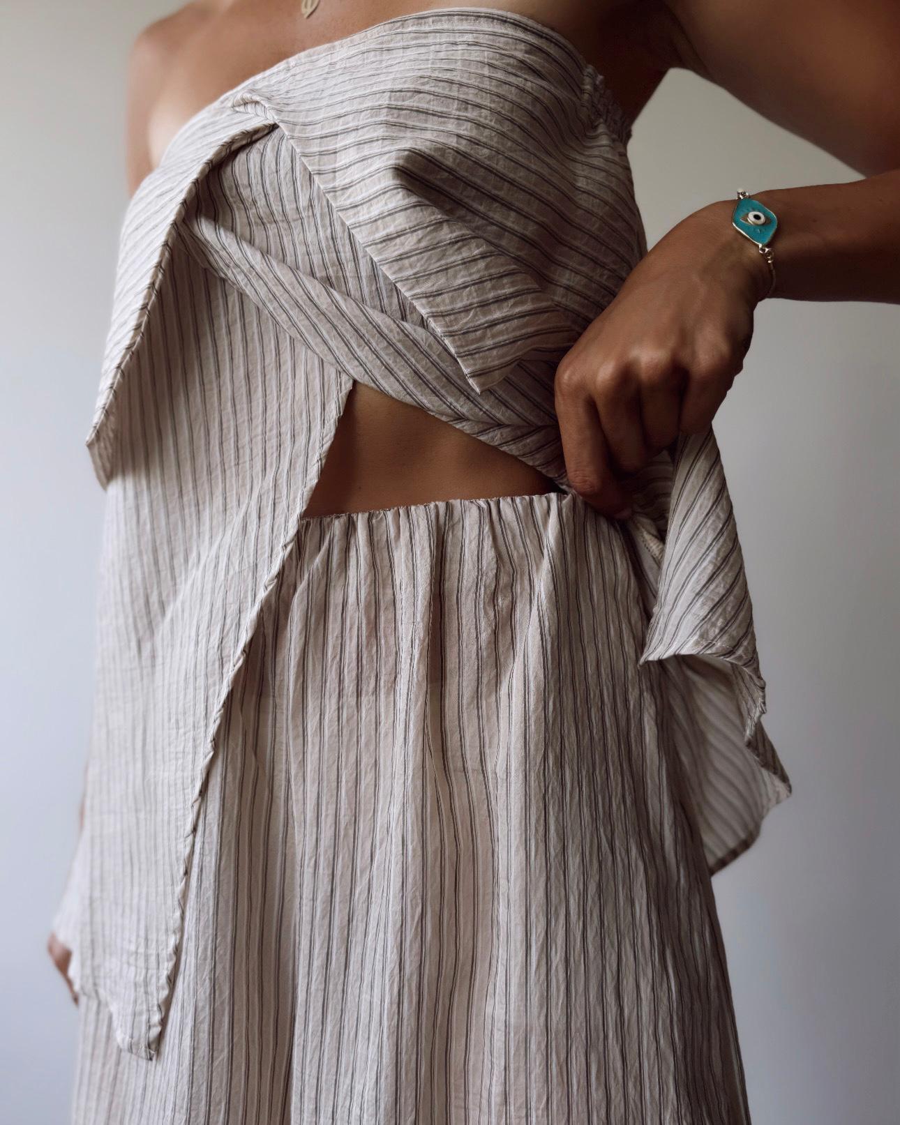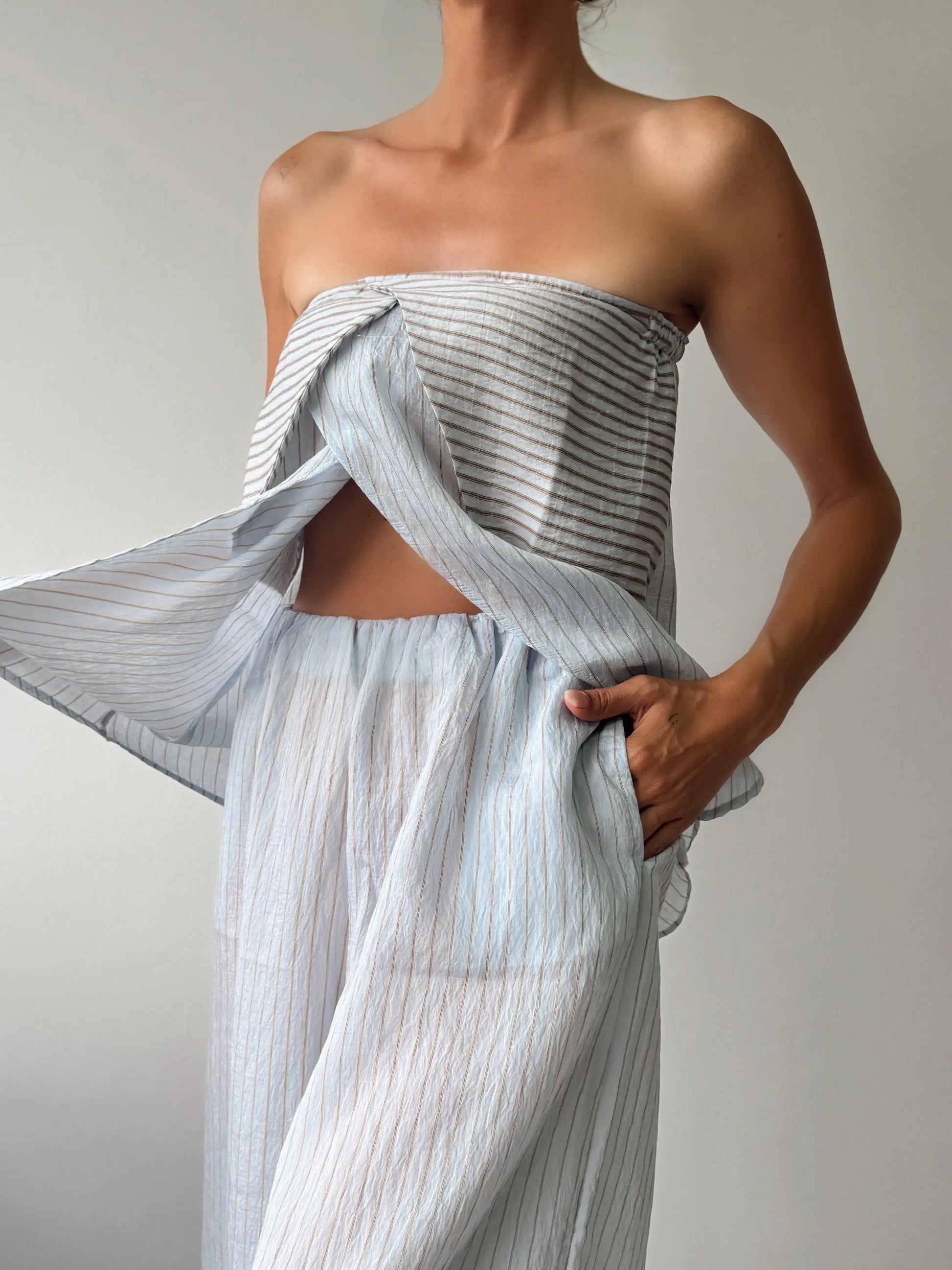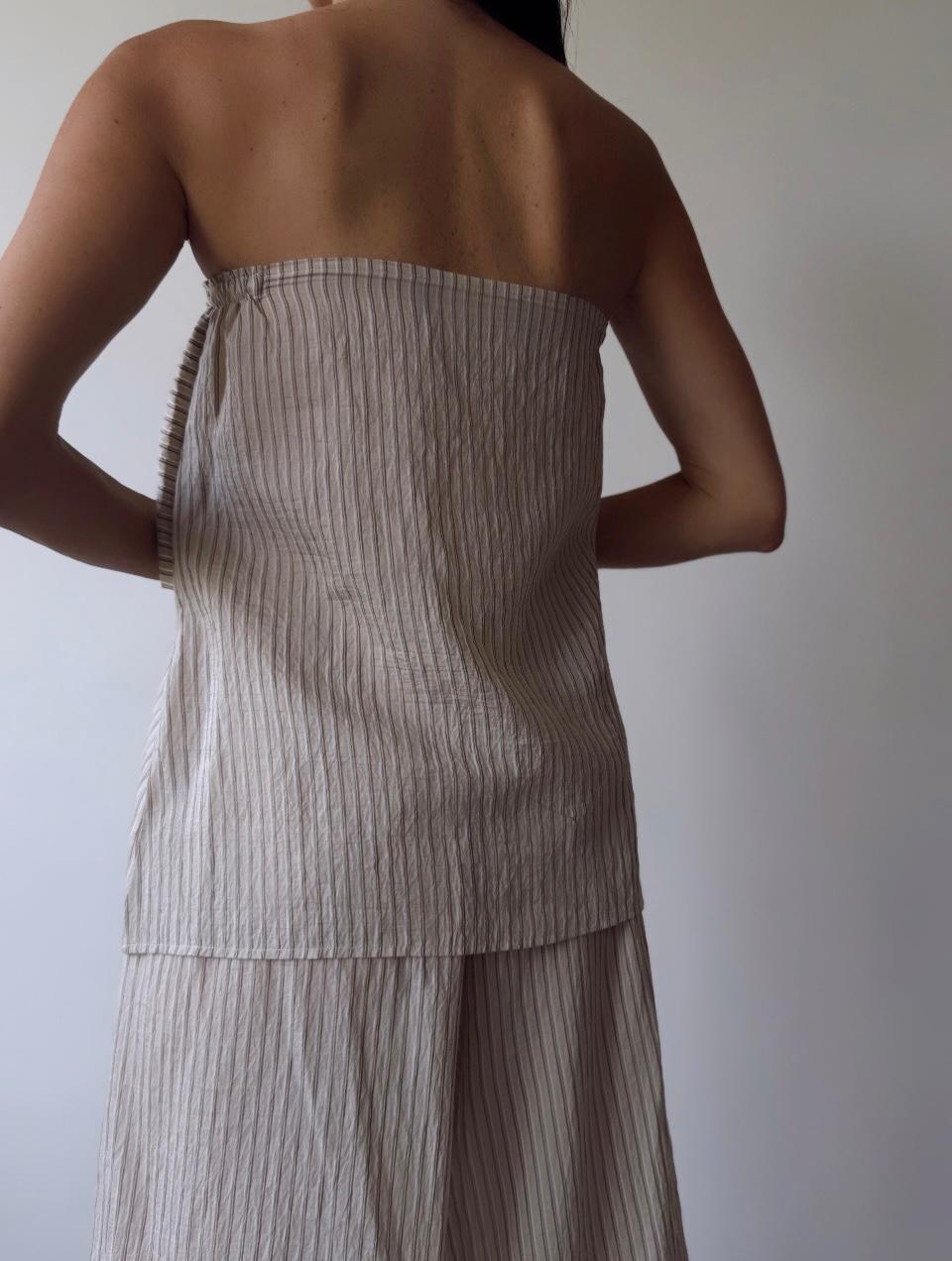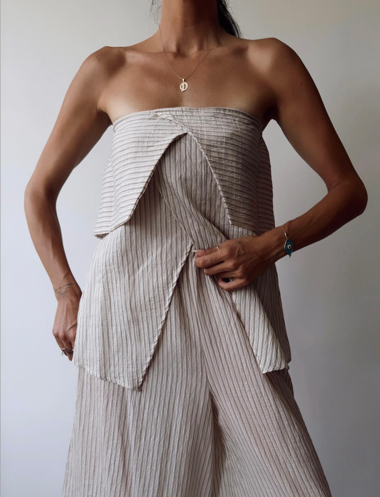 Straplez, önü patlı ince modal bluz ve geniş paça,biyeli,ara boy, beli lastikli rahat kesim pantolon.