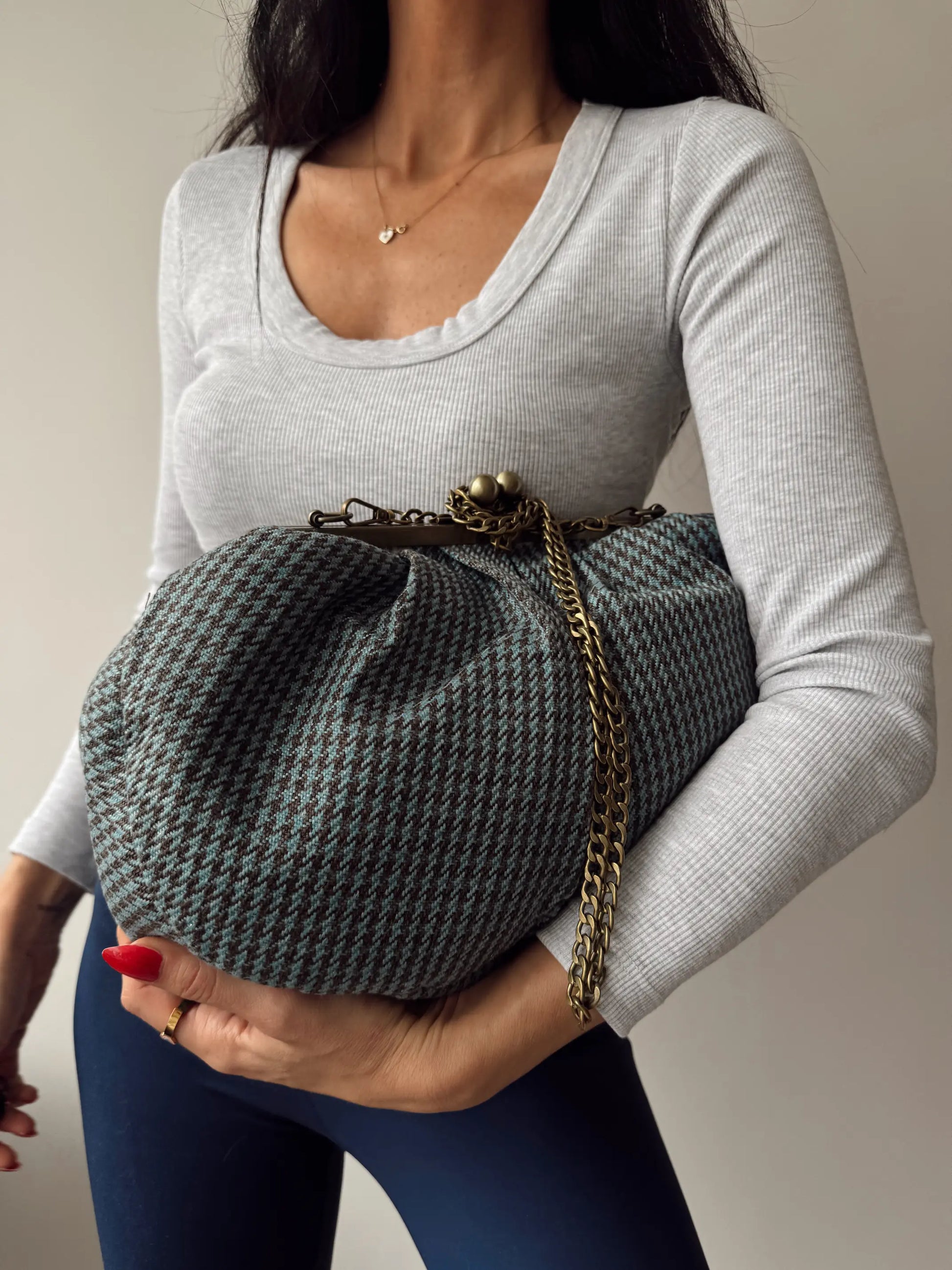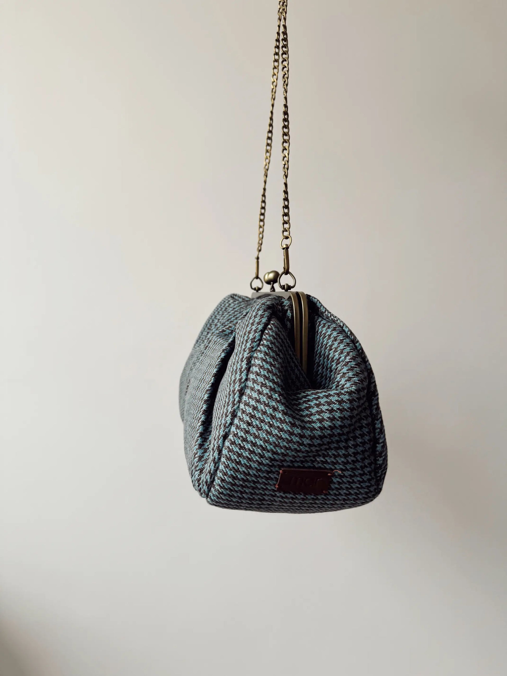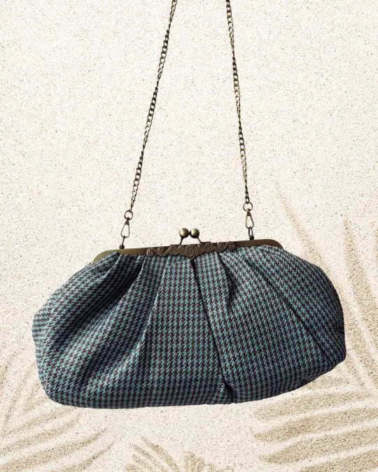 Kazayağı desenli kumaş ile tasarlanmış, antik metal burslu, zincir askı detaylı, el işçiliği tasarım çanta.