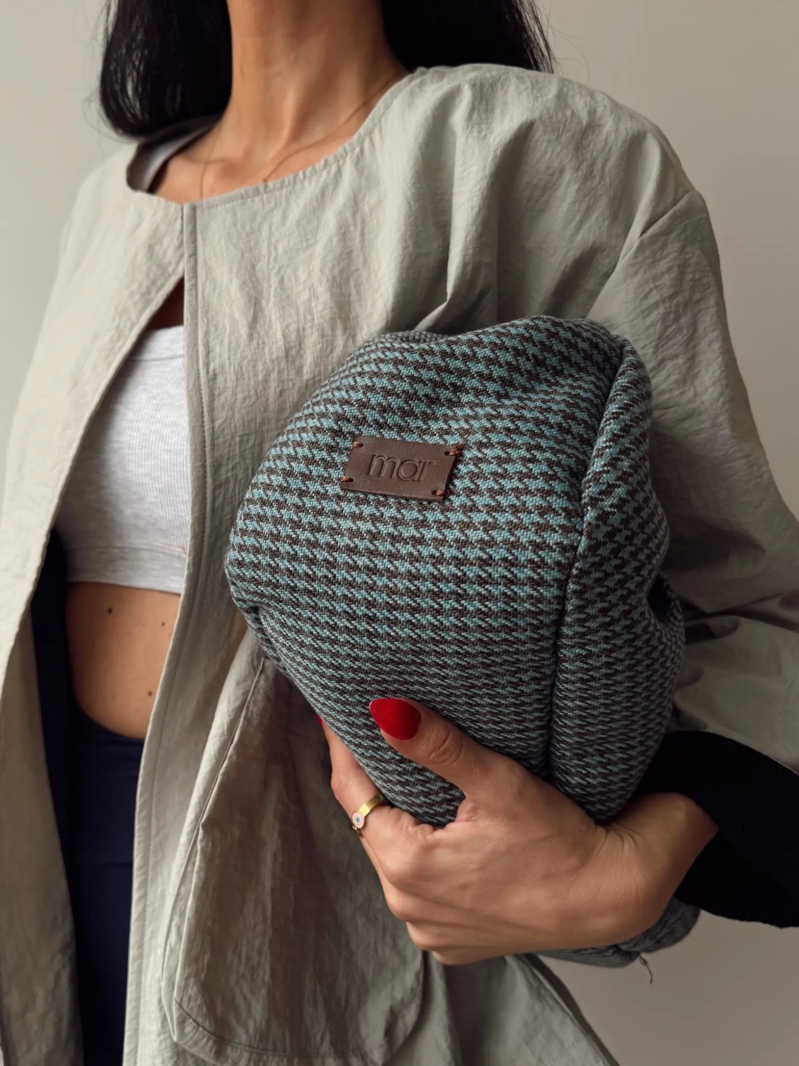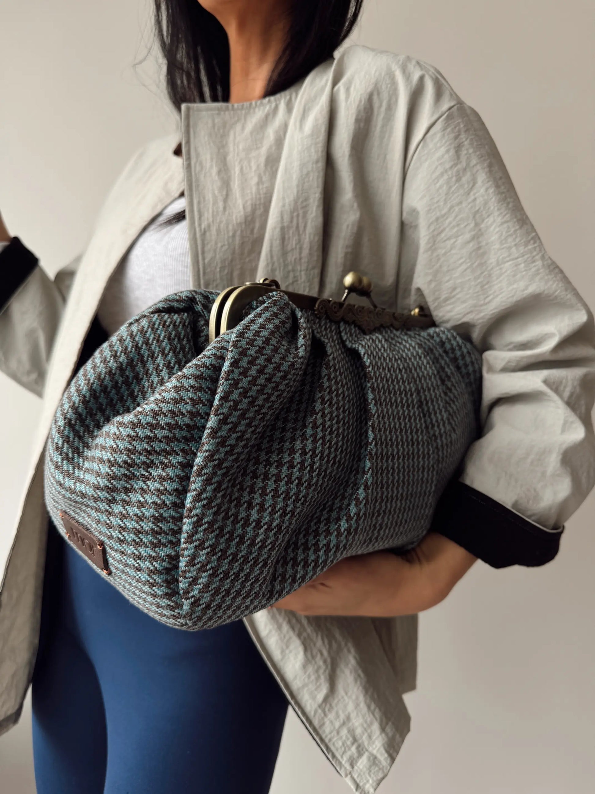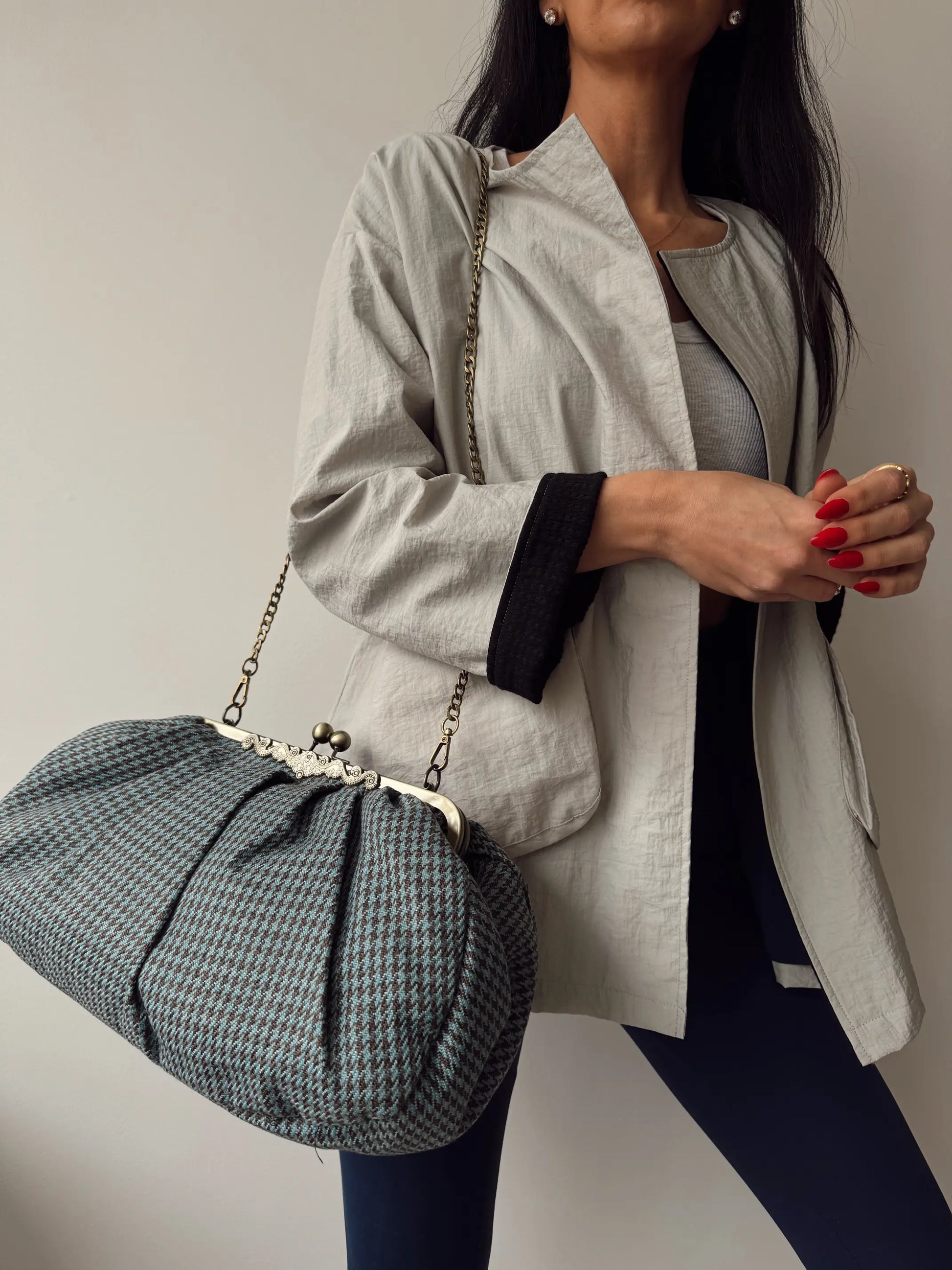 Kazayağı desenli kumaş ile tasarlanmış, antik metal burslu, zincir askı detaylı, el işçiliği tasarım çanta.
