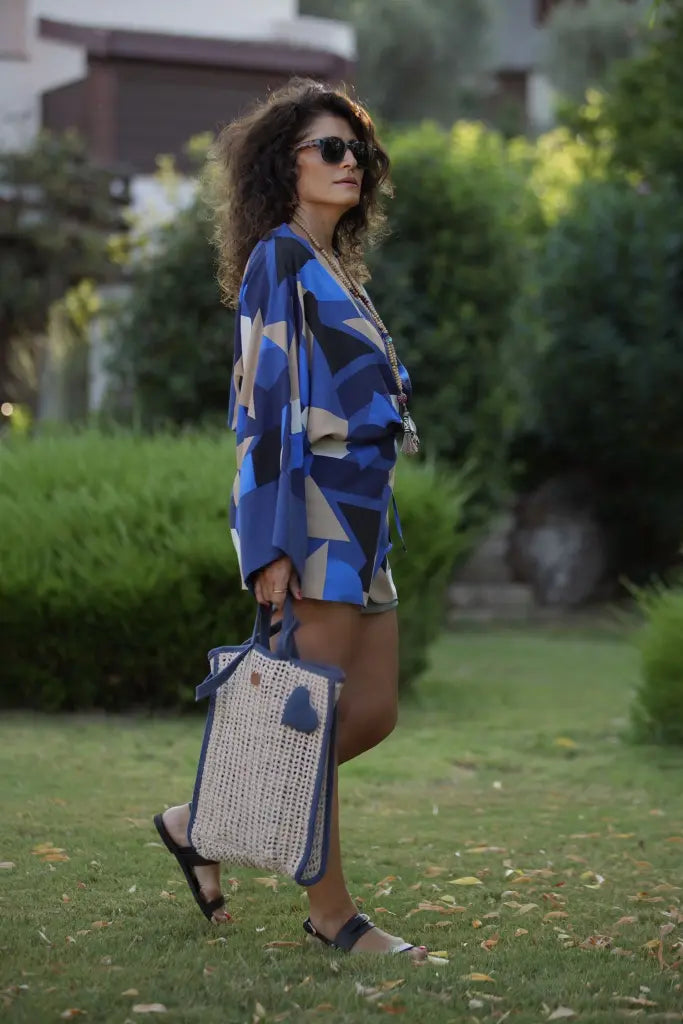 Lacivert-krem geometrik desenli, kalça hizasında, yandan bağlamalı, geniş kol ağzı detaylı viskon kimono.
