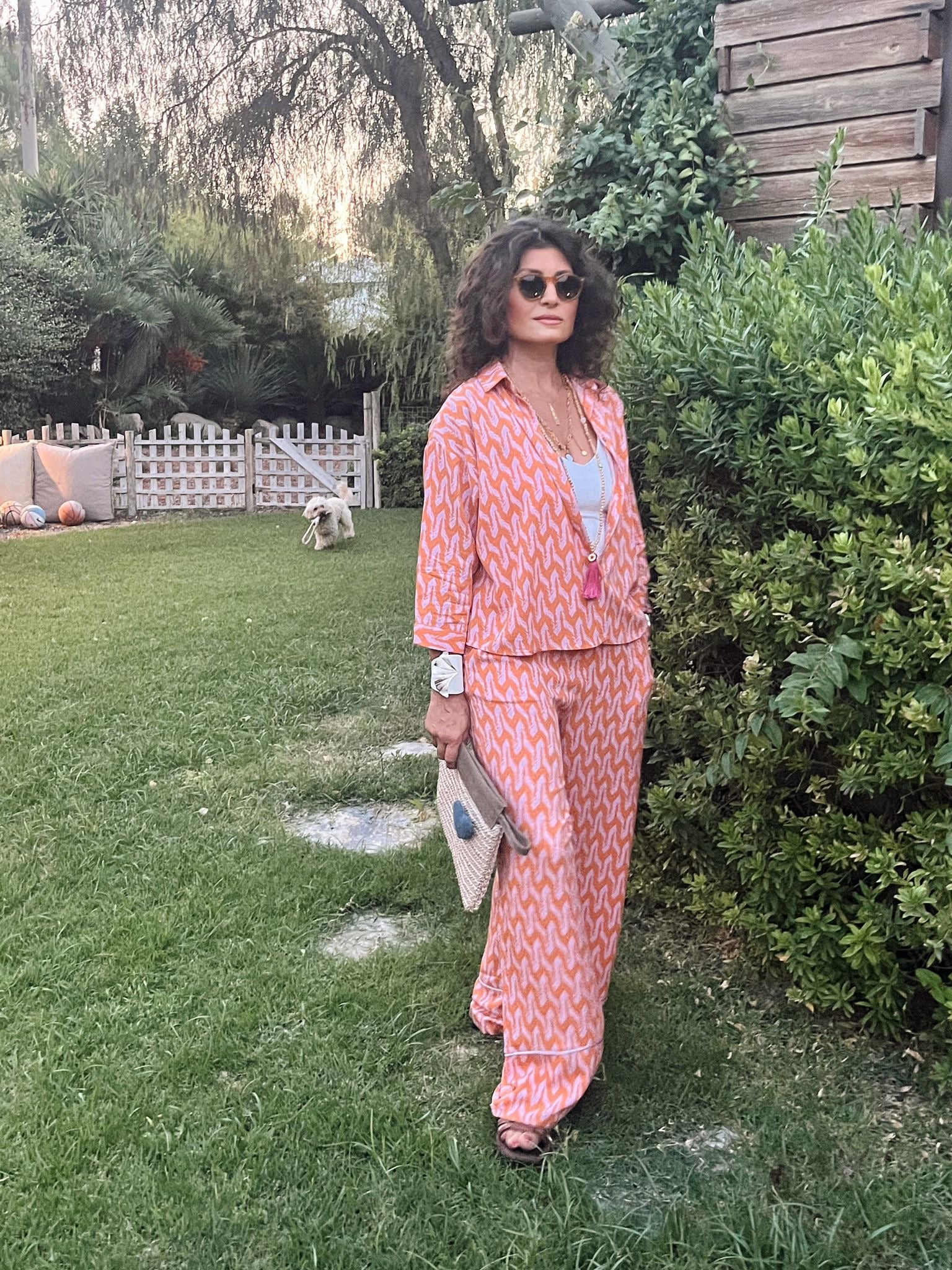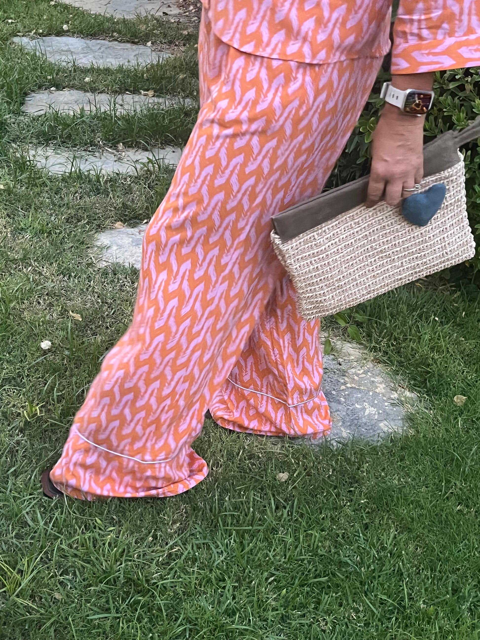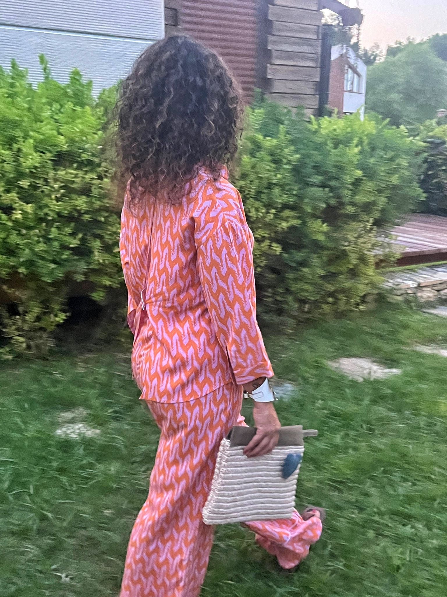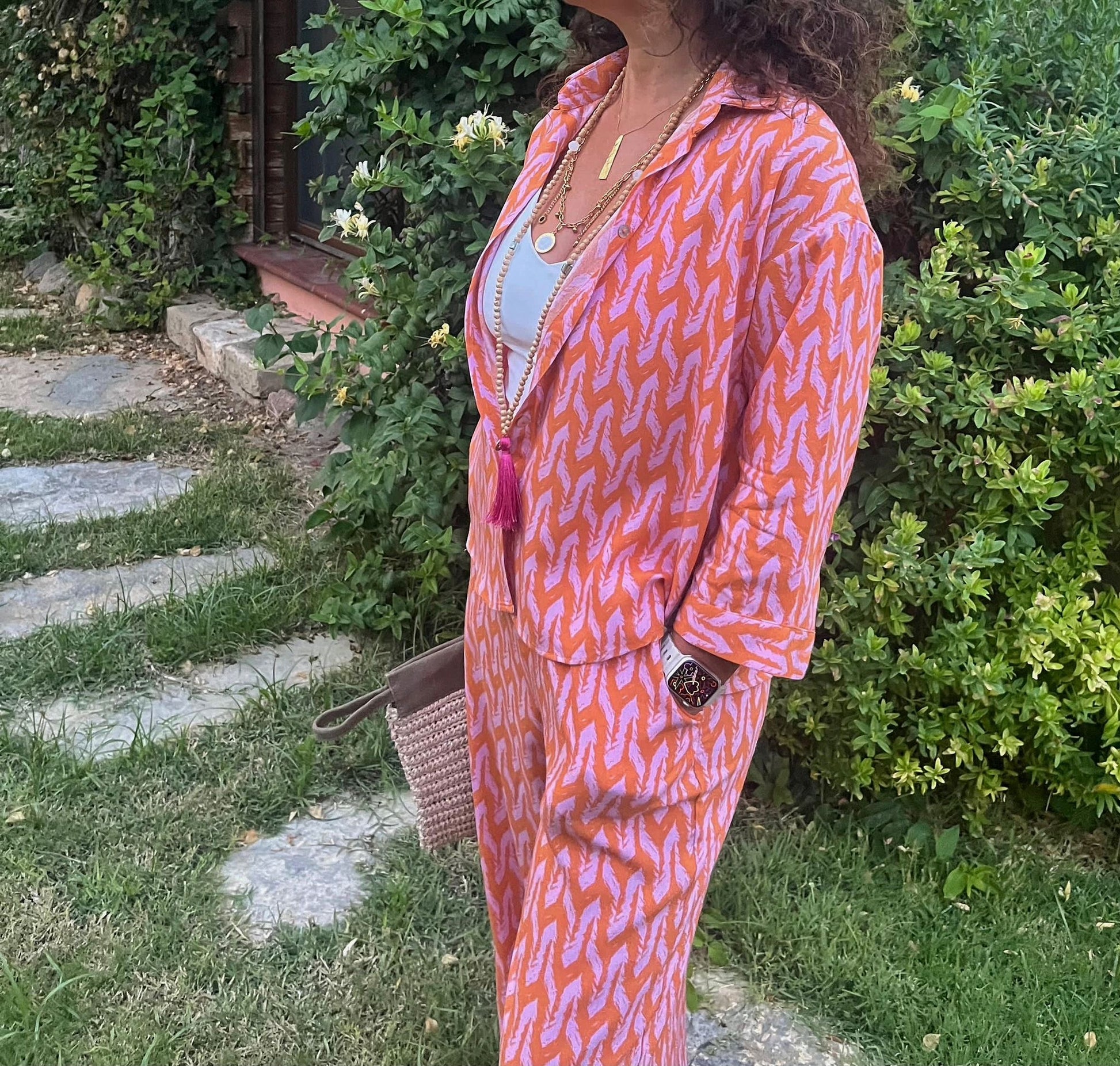 Bol kesim paçası biye detaylı, desenli viskon kumaş, pantalon ve gömlek takım