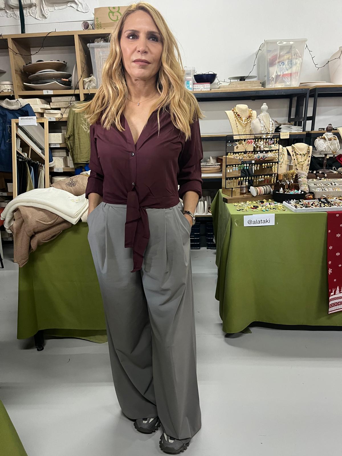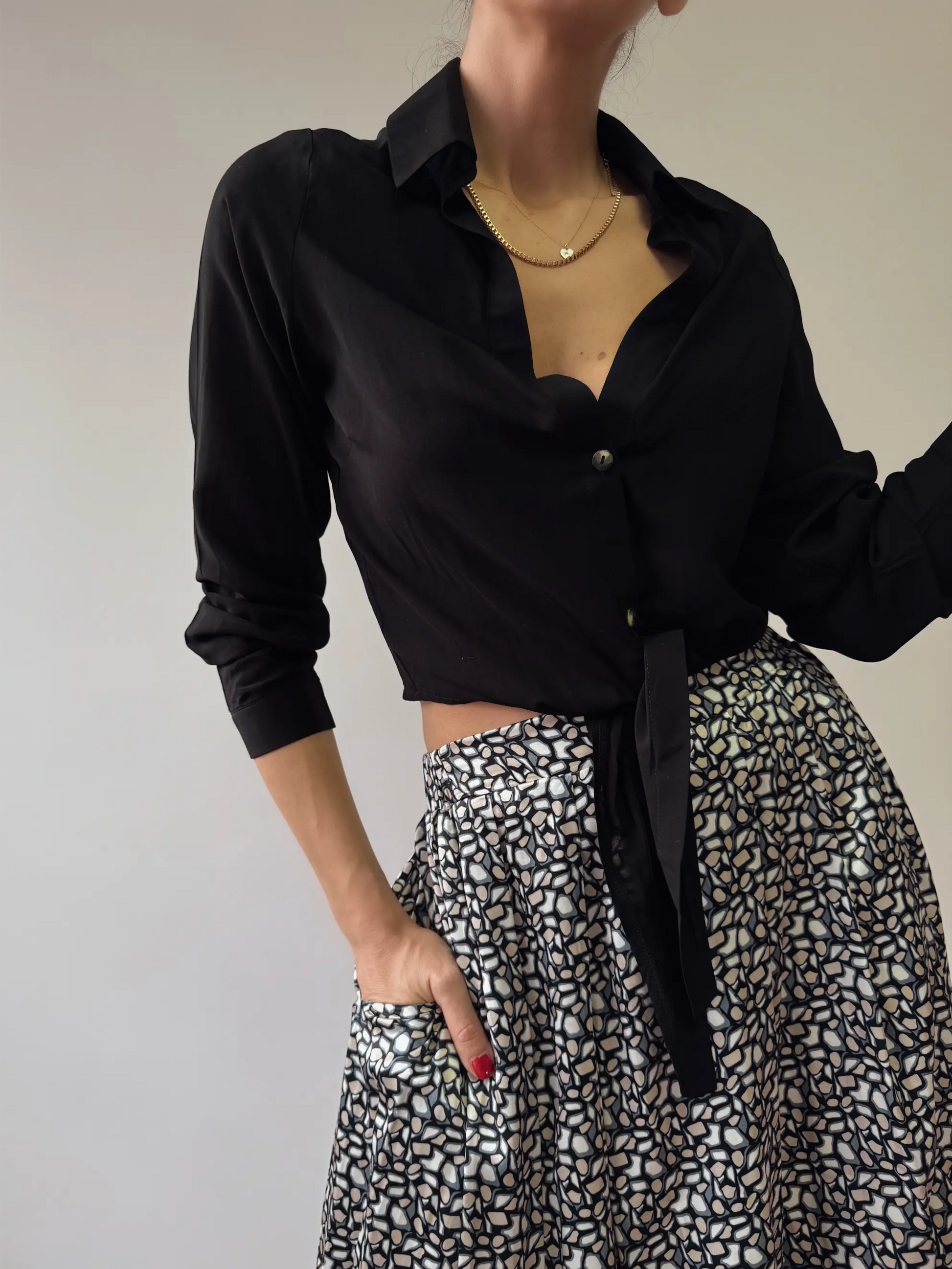 Bel hizasında, önden bağlamalı düğmeli viskon gömlek