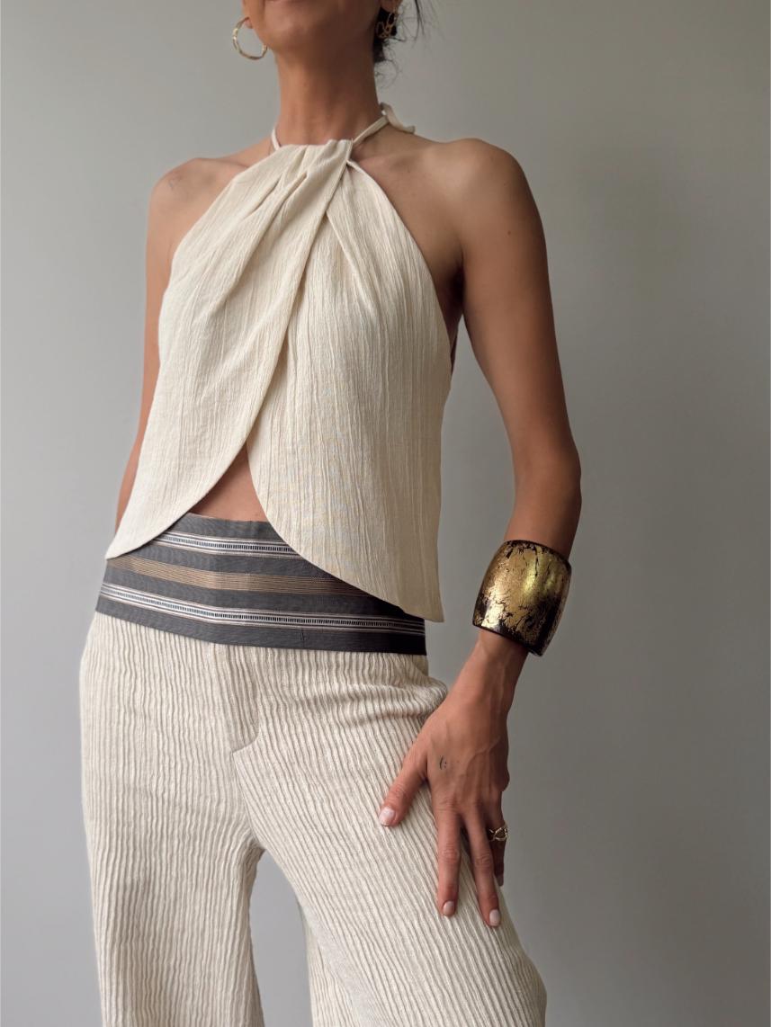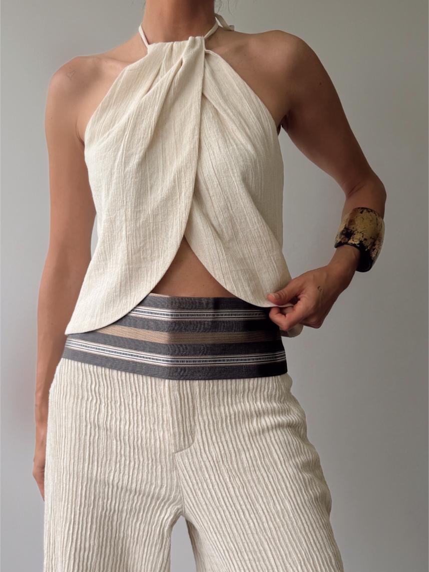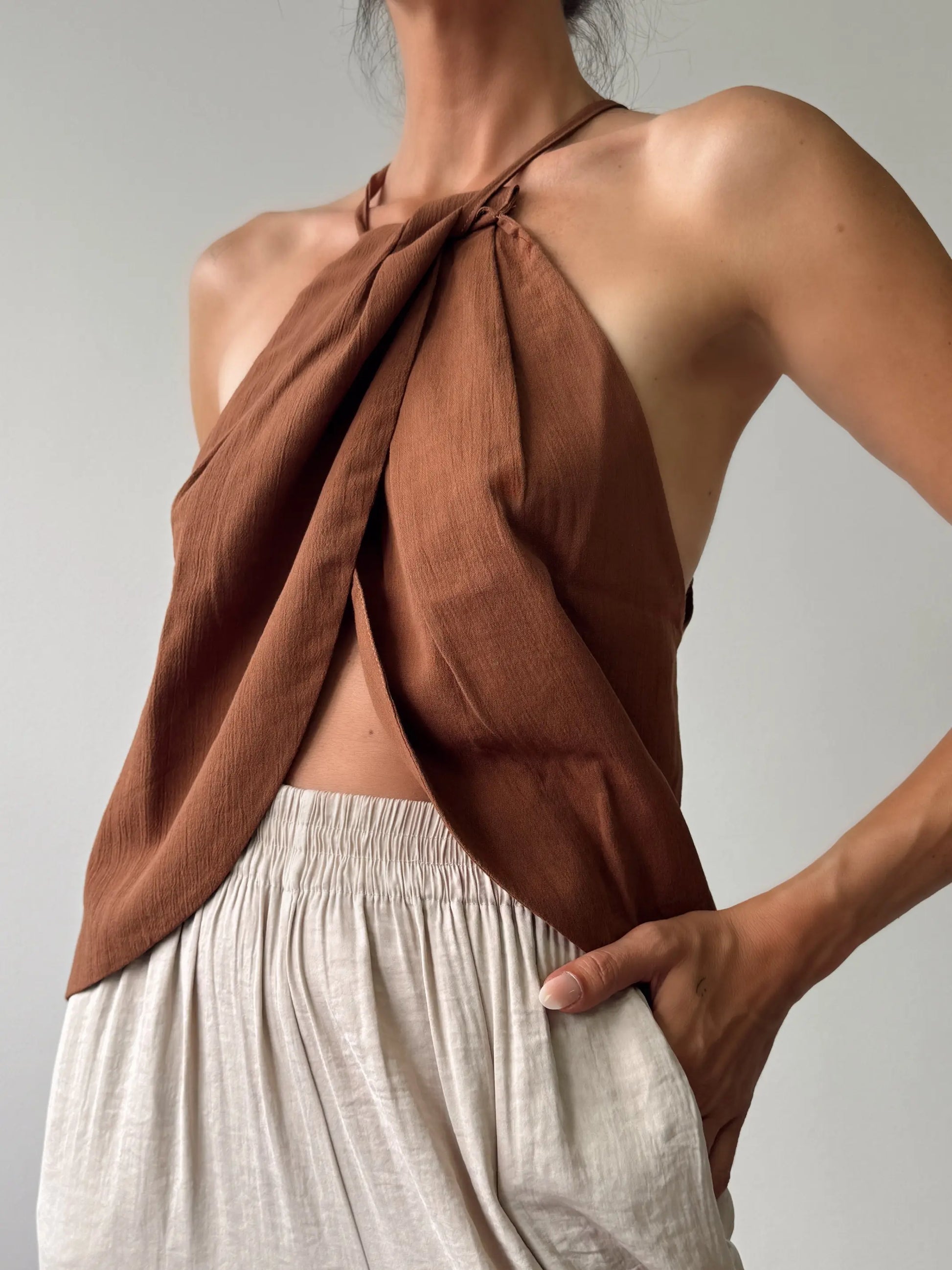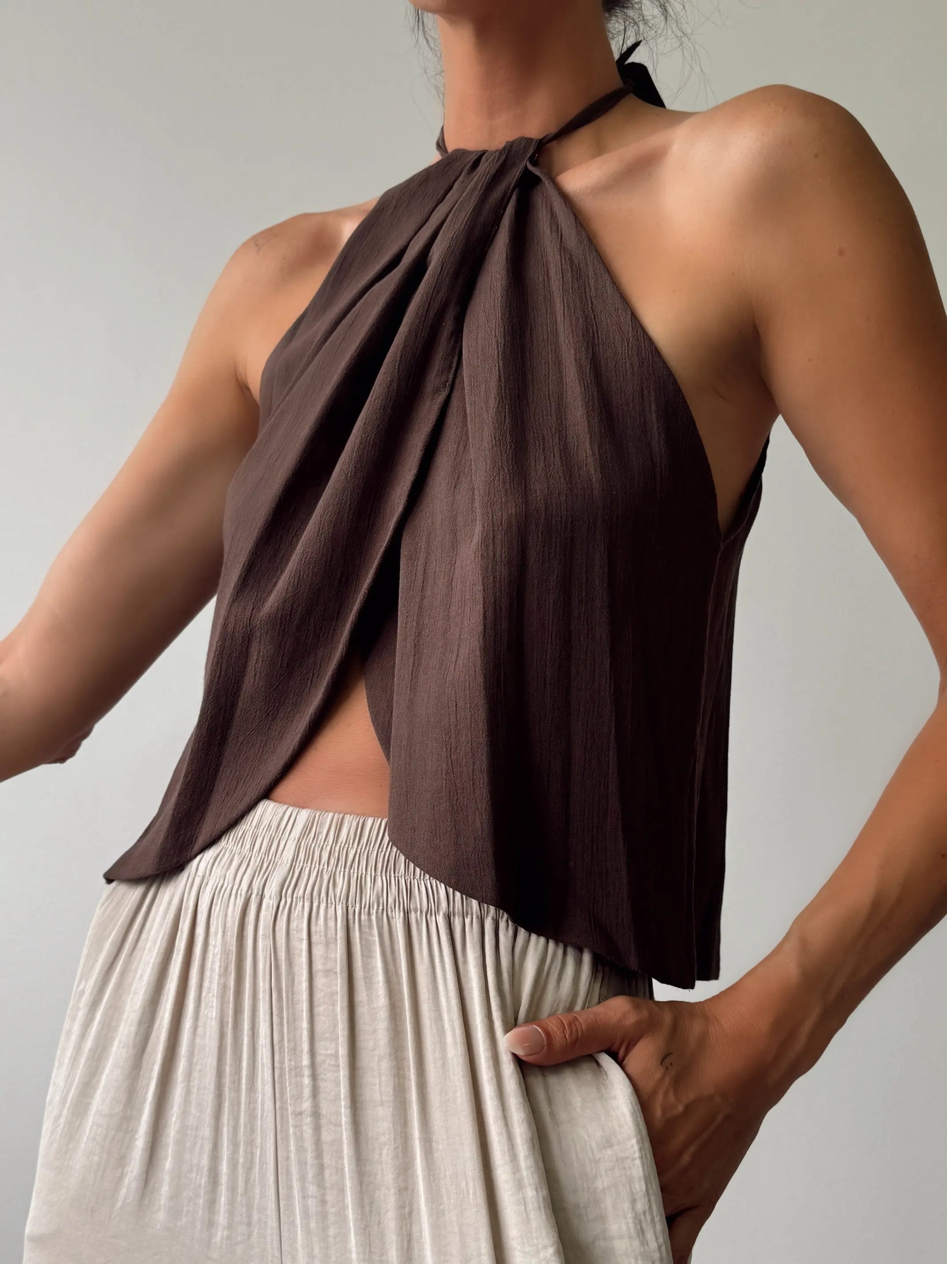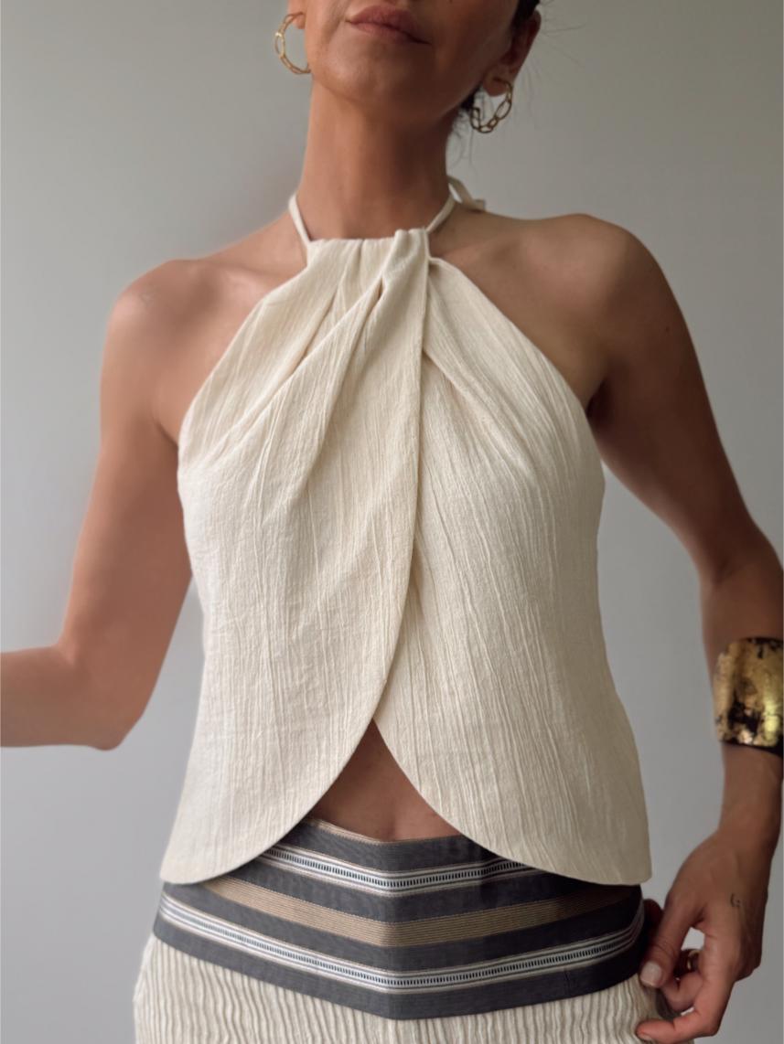Önden bindirmeli, boyundan bağlı, aerobin kumaş ile tasarlanmış bluz