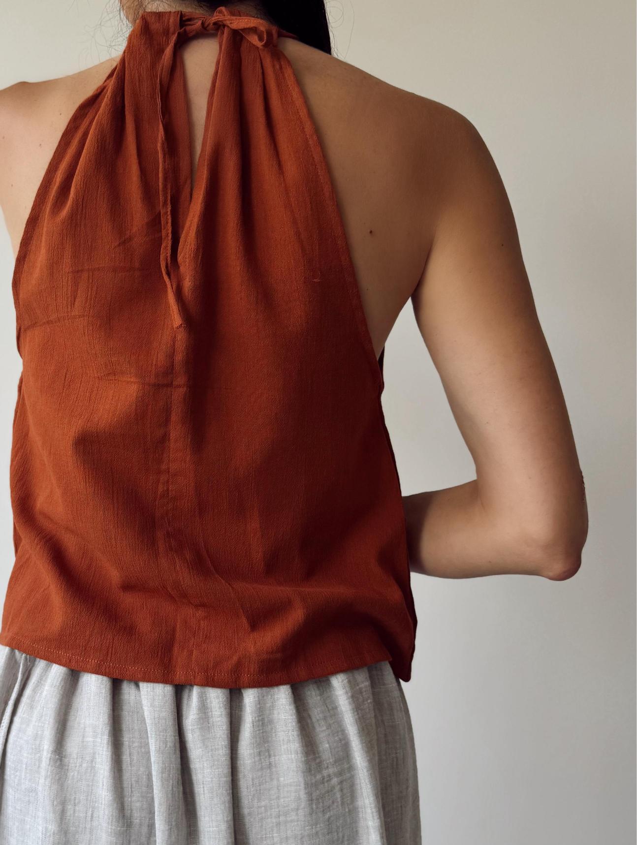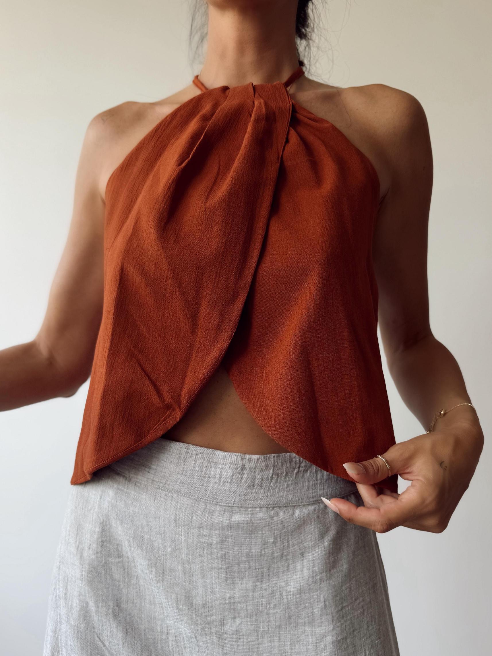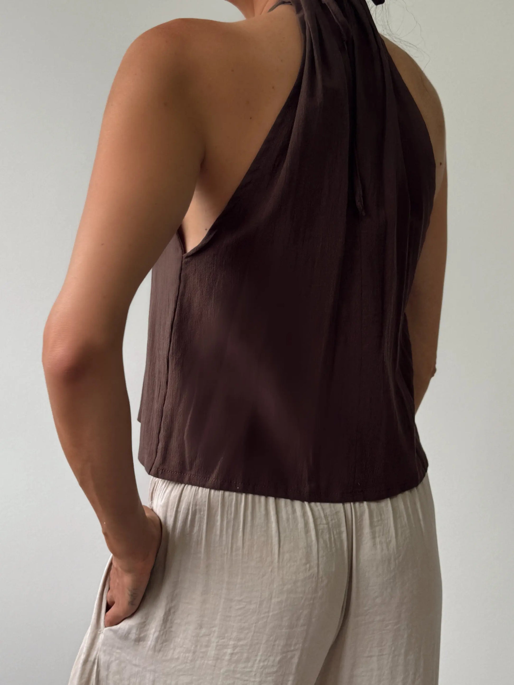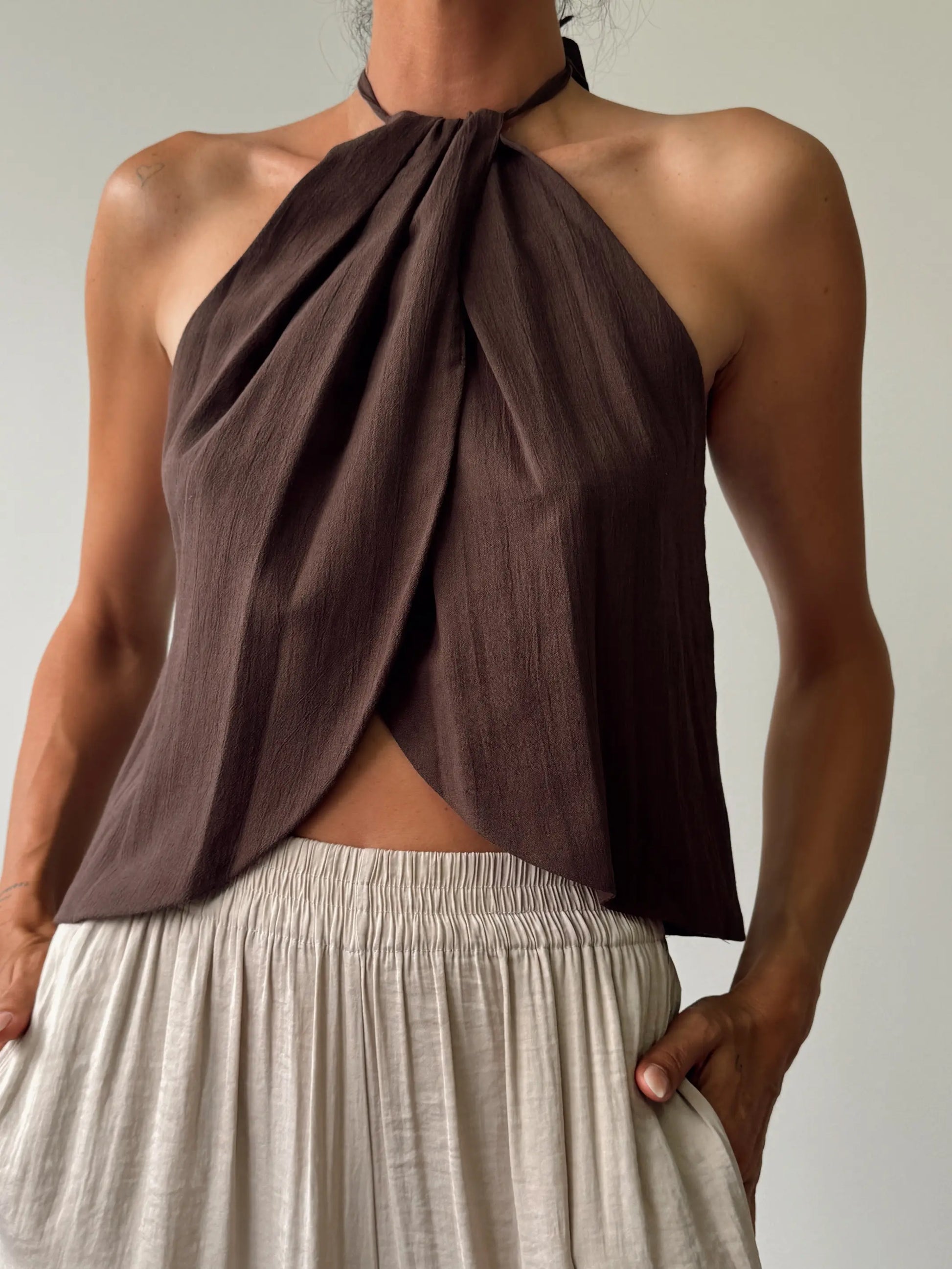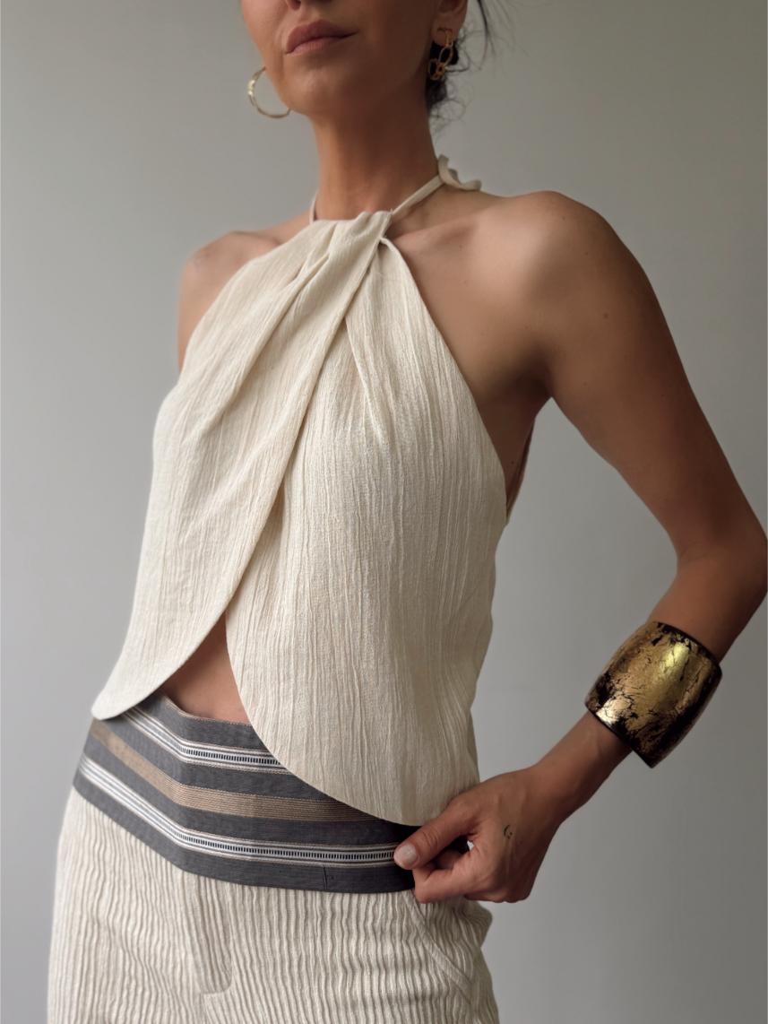 Önden bindirmeli, boyundan bağlı, aerobin kumaş ile tasarlanmış bluz