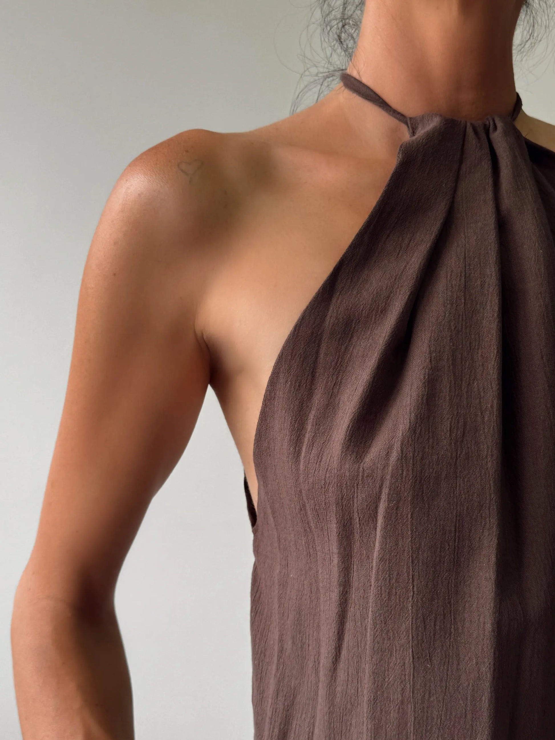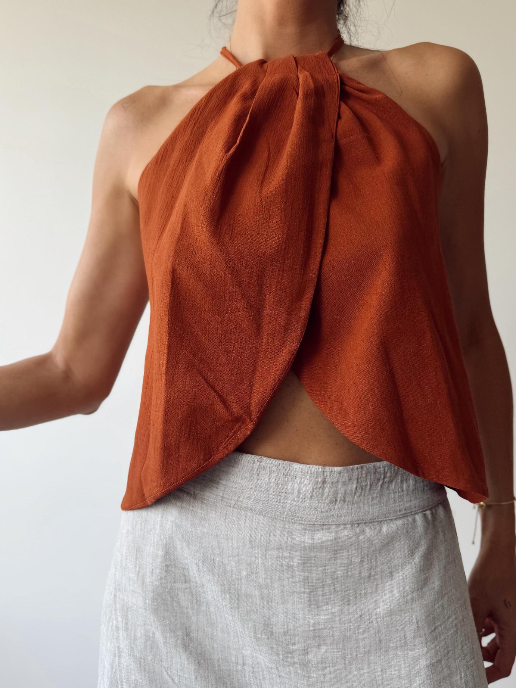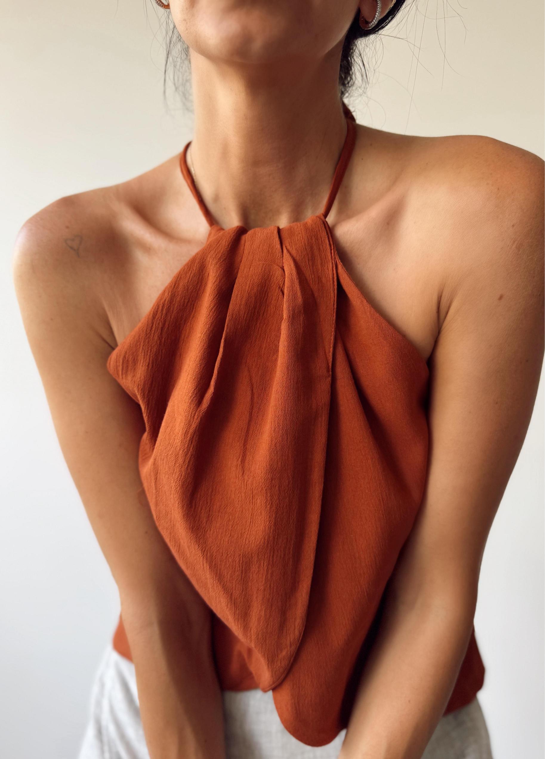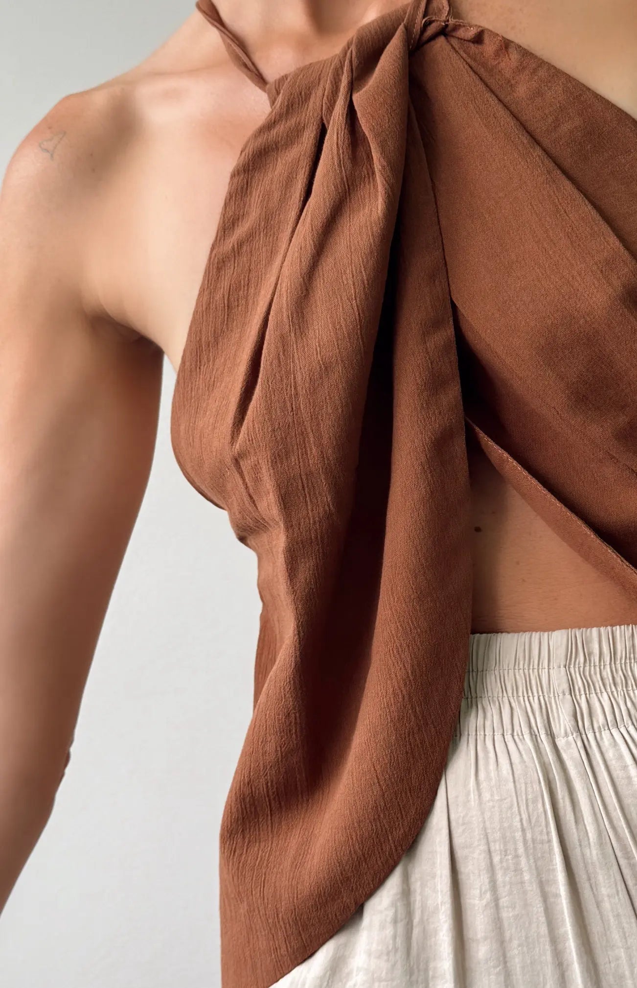 Önden bindirmeli, boyundan bağlı, aerobin kumaş ile tasarlanmış bluz