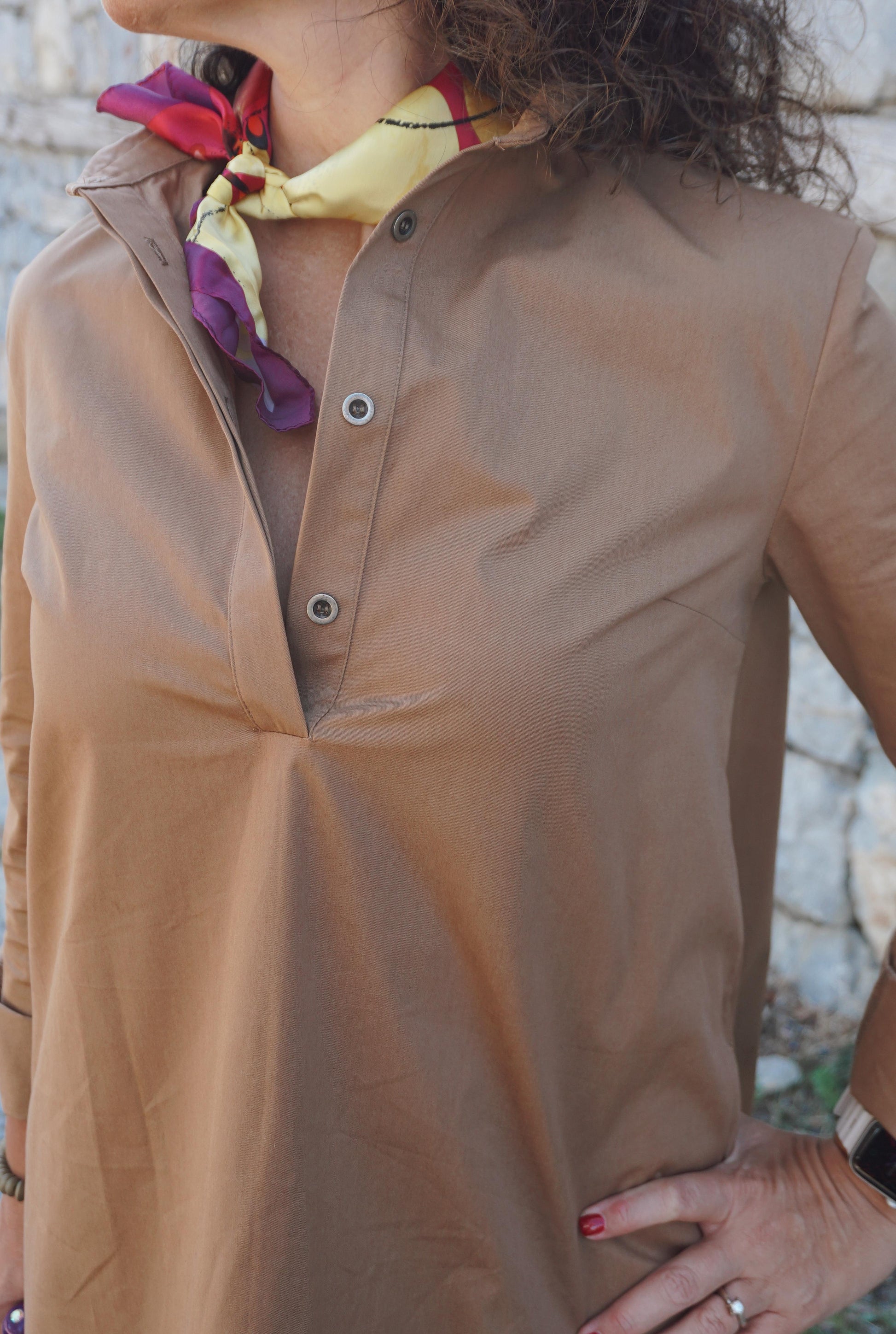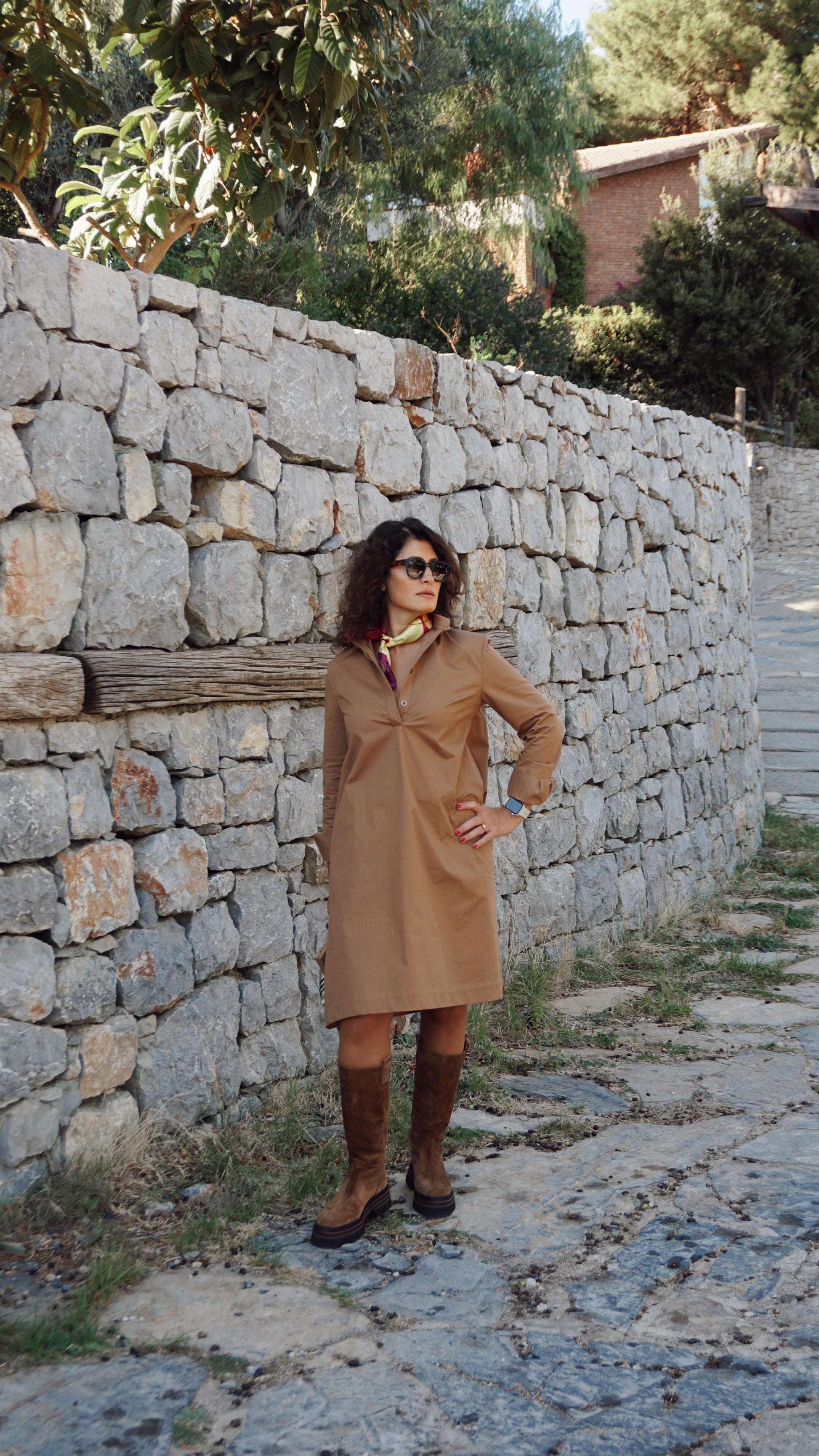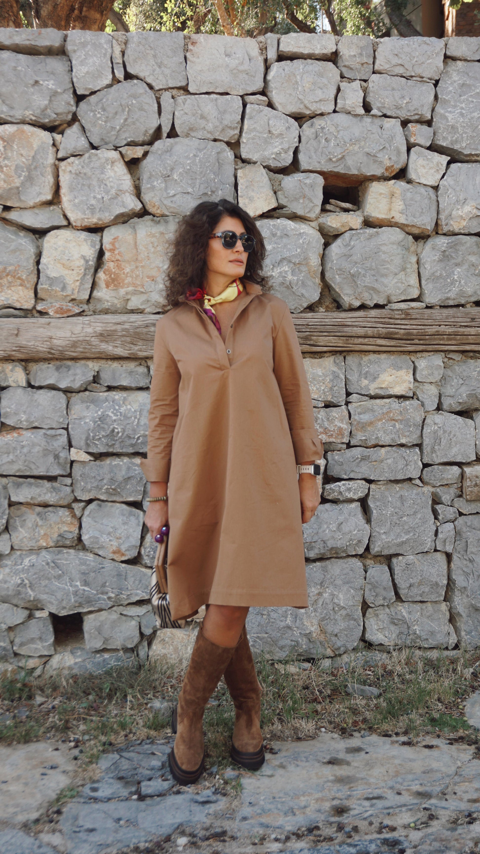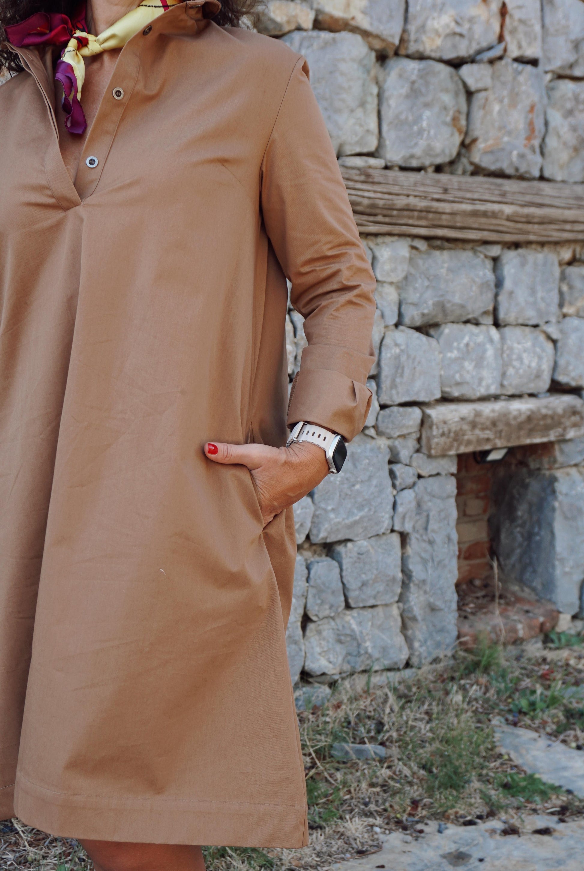 Diz boyu, iki yanı cepli, kanvas kumaş elbise.