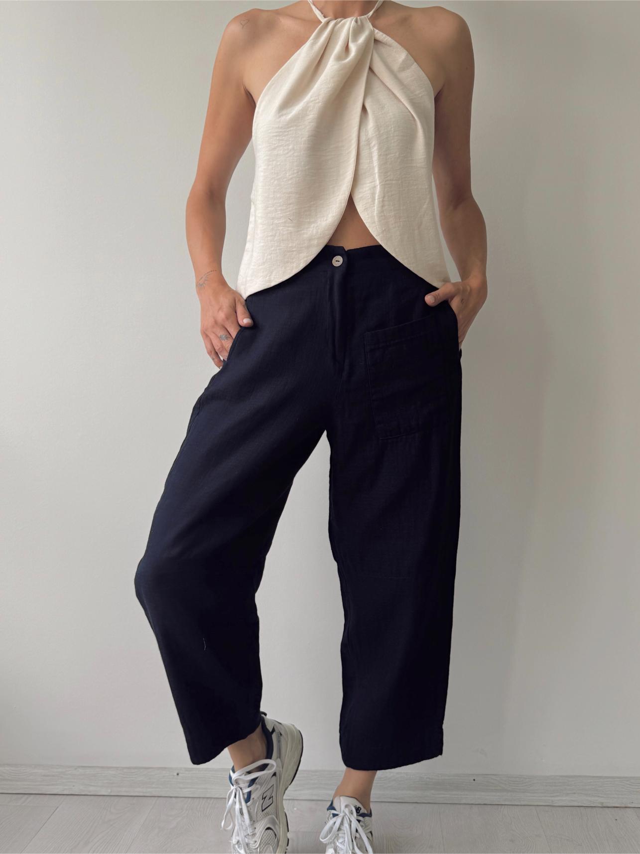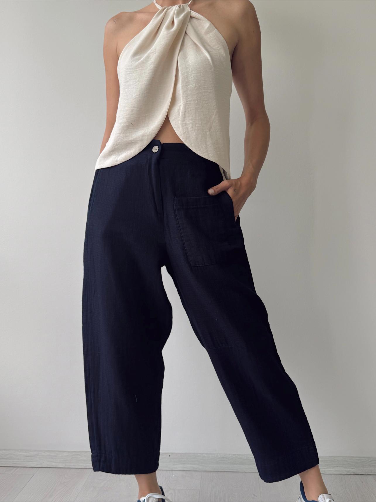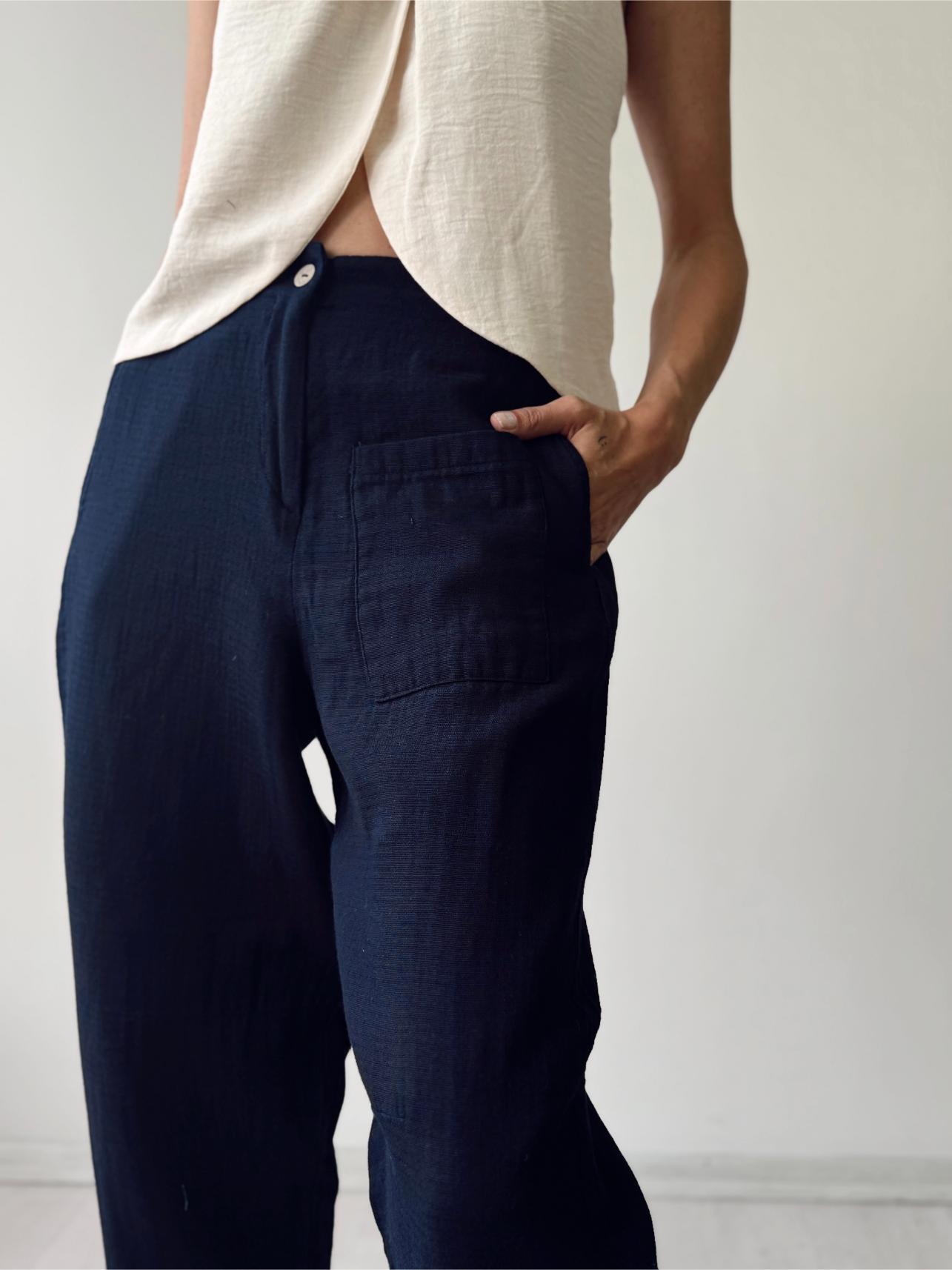 Rahat bol kesim, paçaya doğru hafif daralan pamuklu lacivert denim pantolon