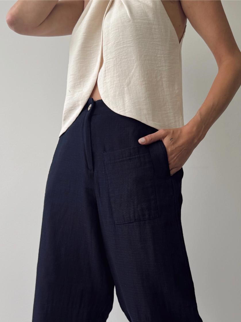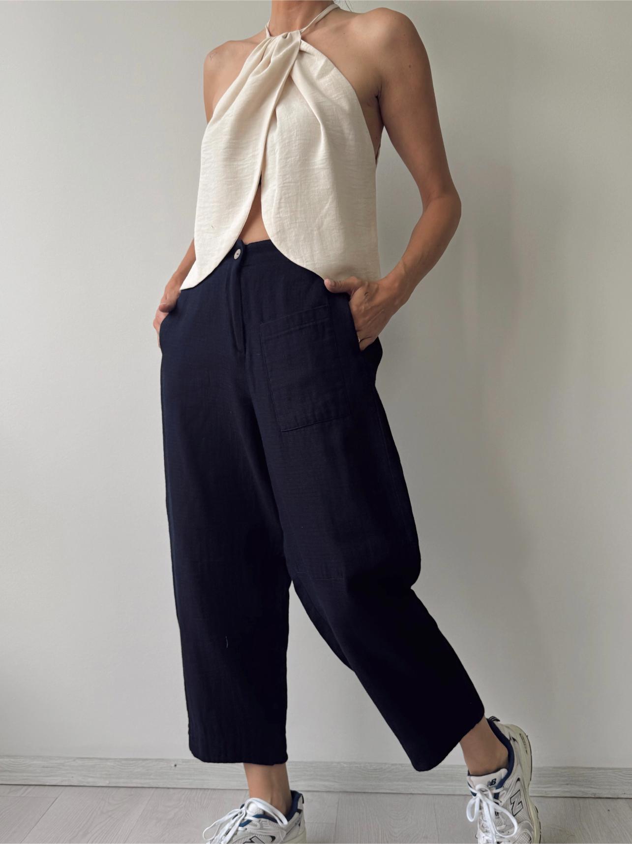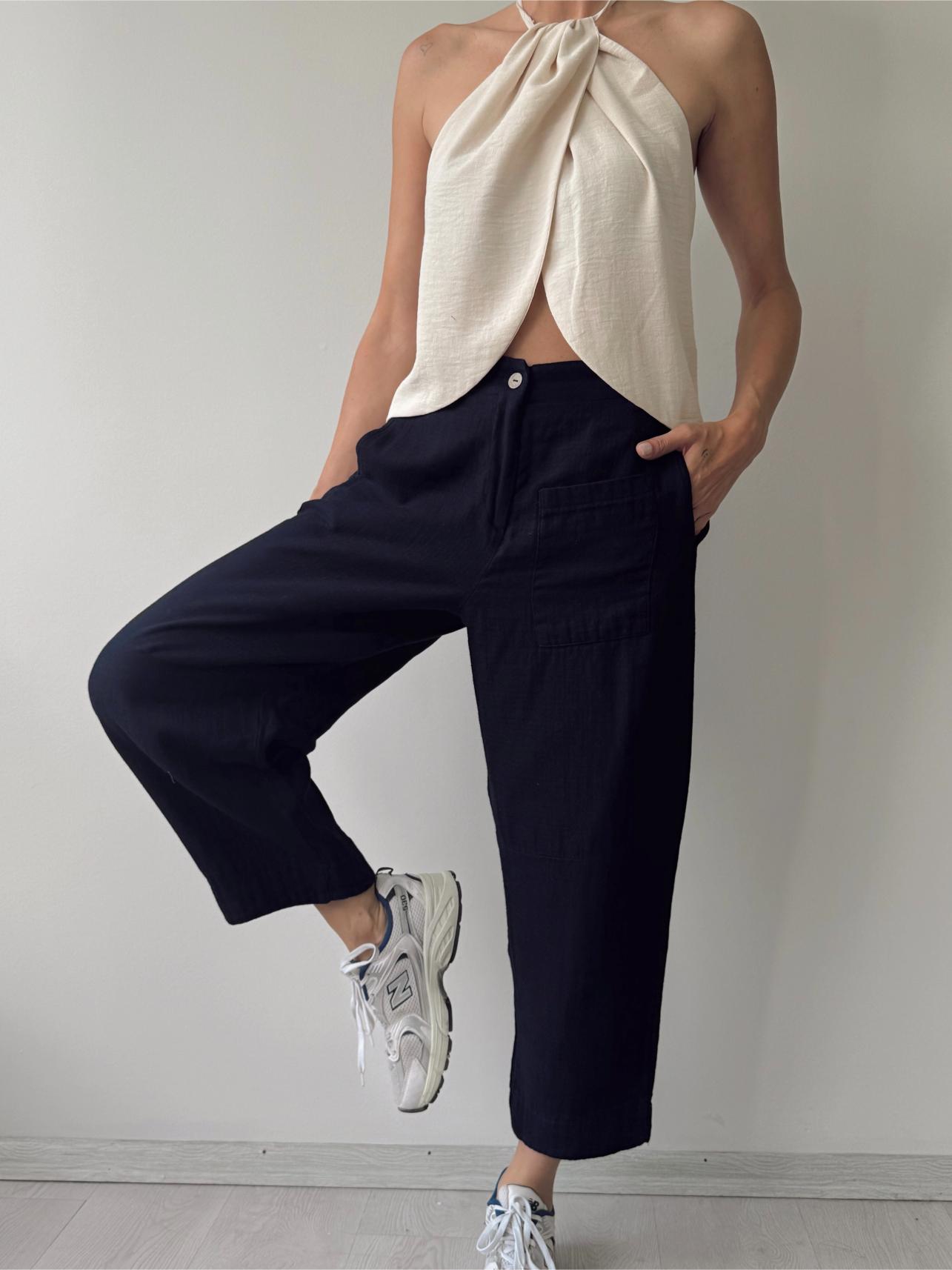 Rahat bol kesim, paçaya doğru hafif daralan pamuklu lacivert denim pantolon