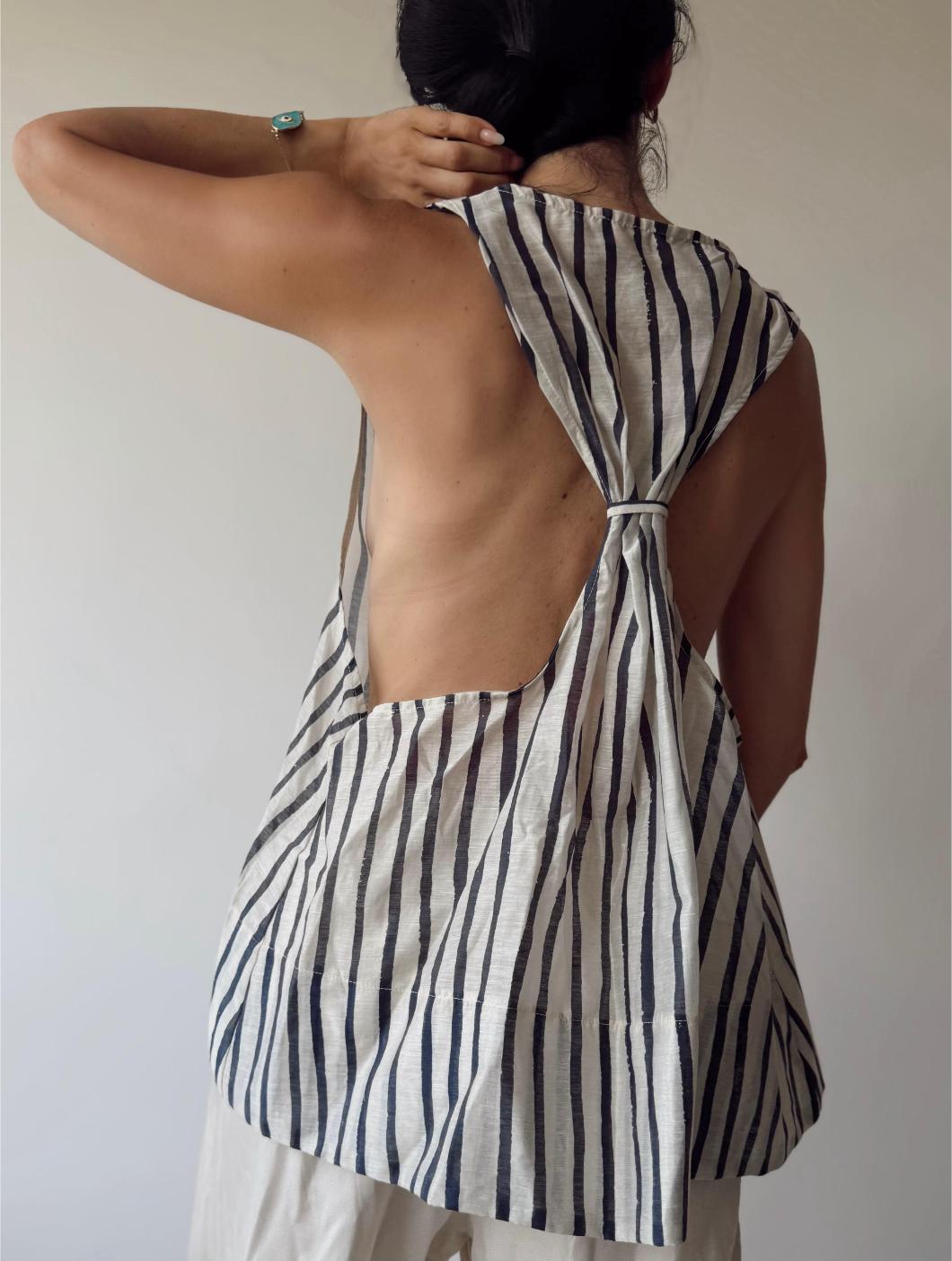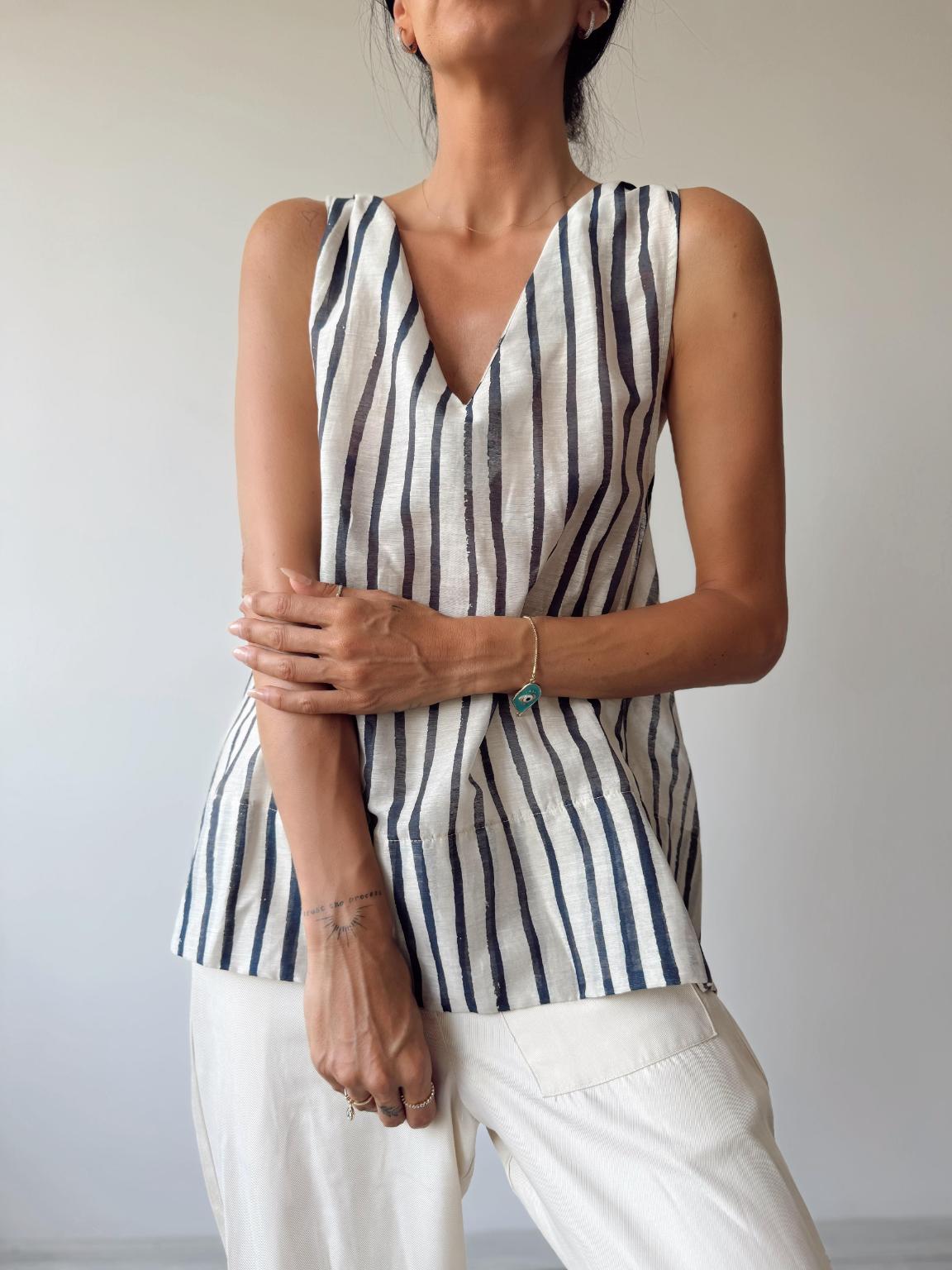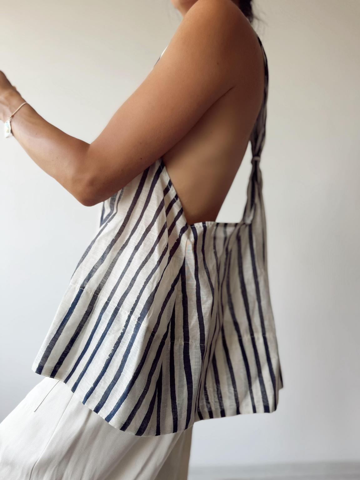 Keten liyosel kumaş ile tasarlanmış, geniş kesim arka sırt detaylı, lacivert çizgi desenli bluz