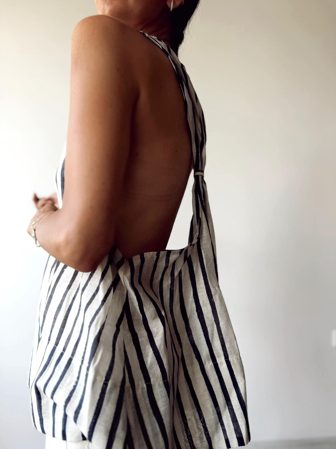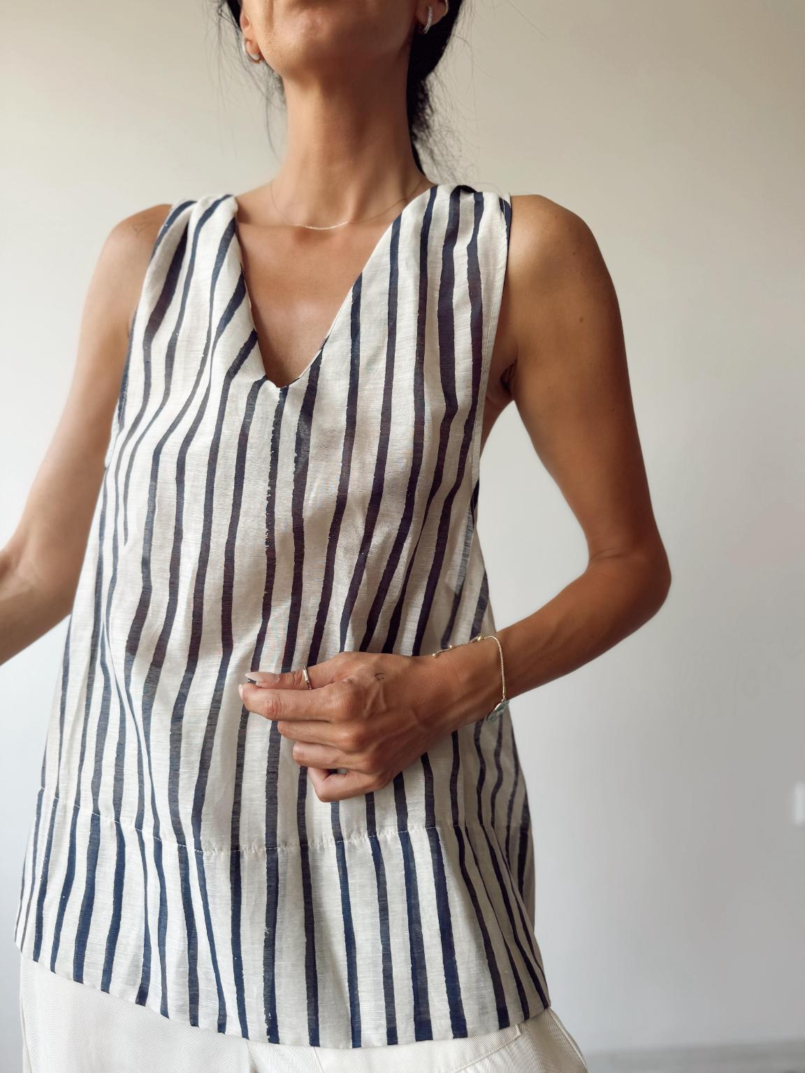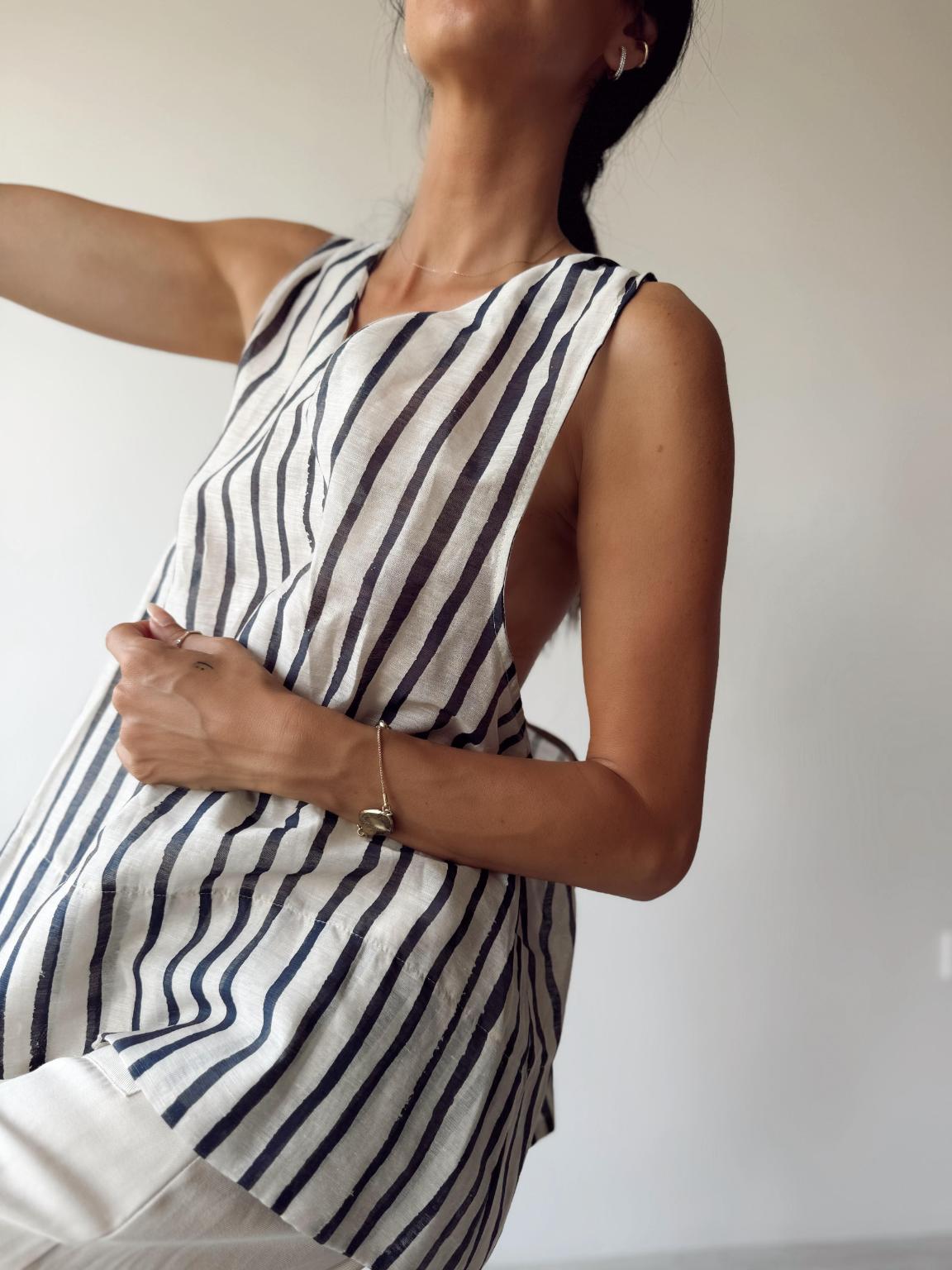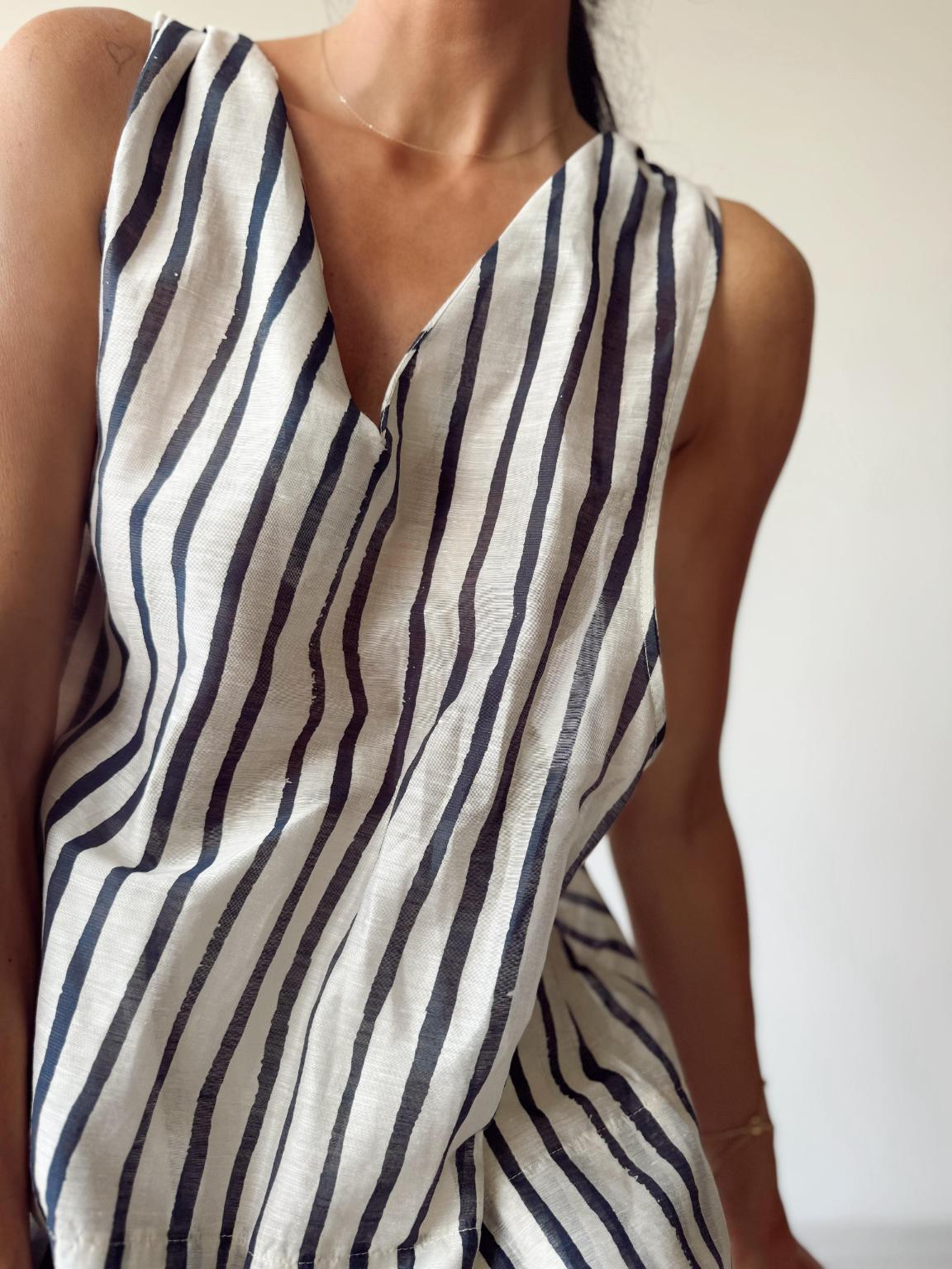Keten liyosel kumaş ile tasarlanmış, geniş kesim arka sırt detaylı, lacivert çizgi desenli bluz