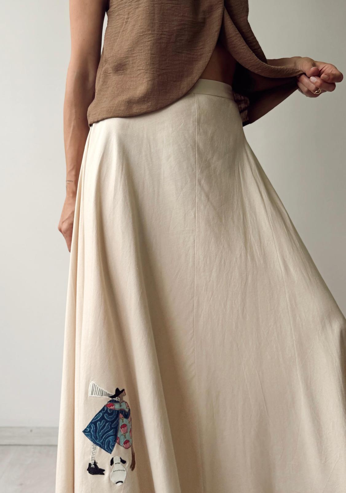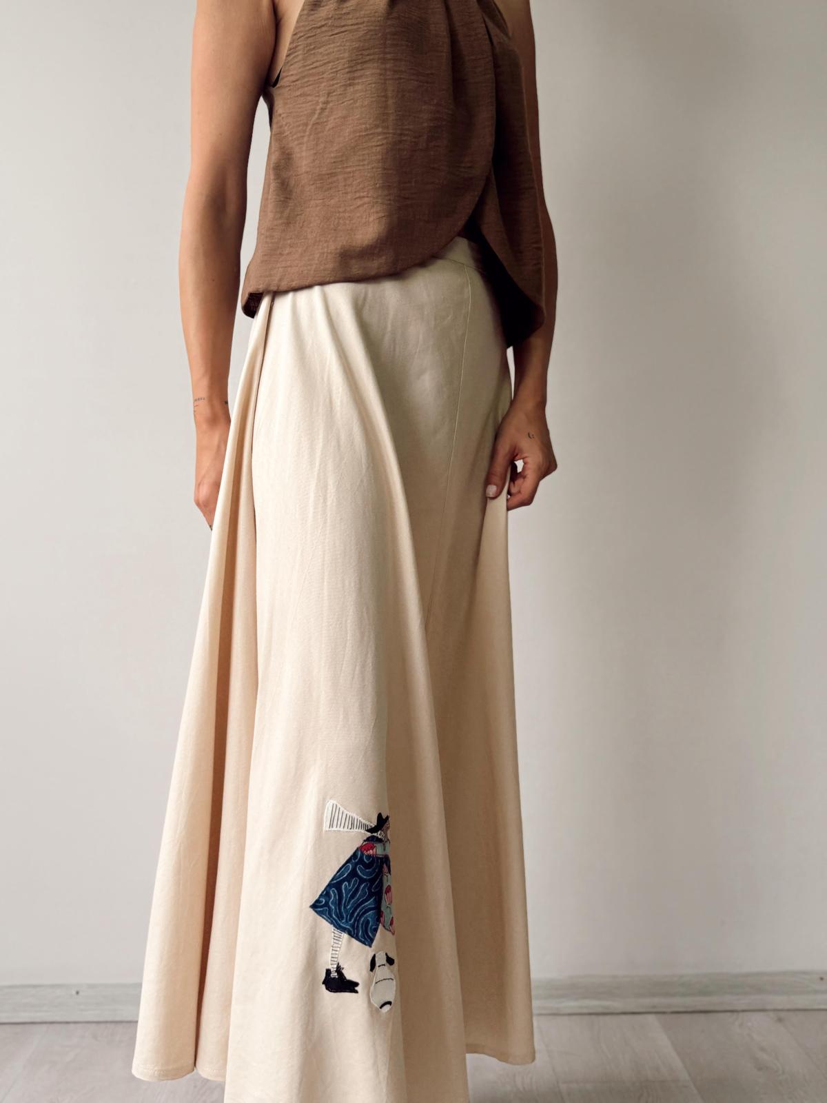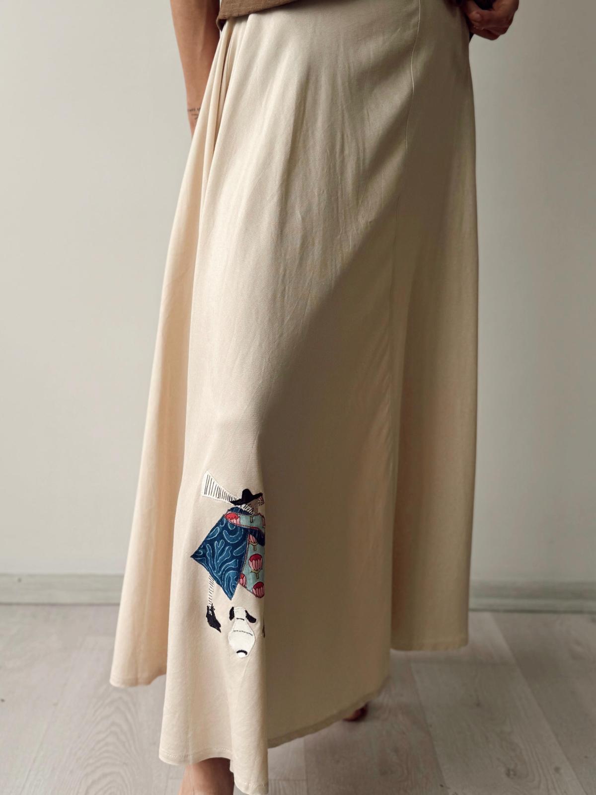 Viskon keten, etek ucu aplike nakış detaylı, kloş etek