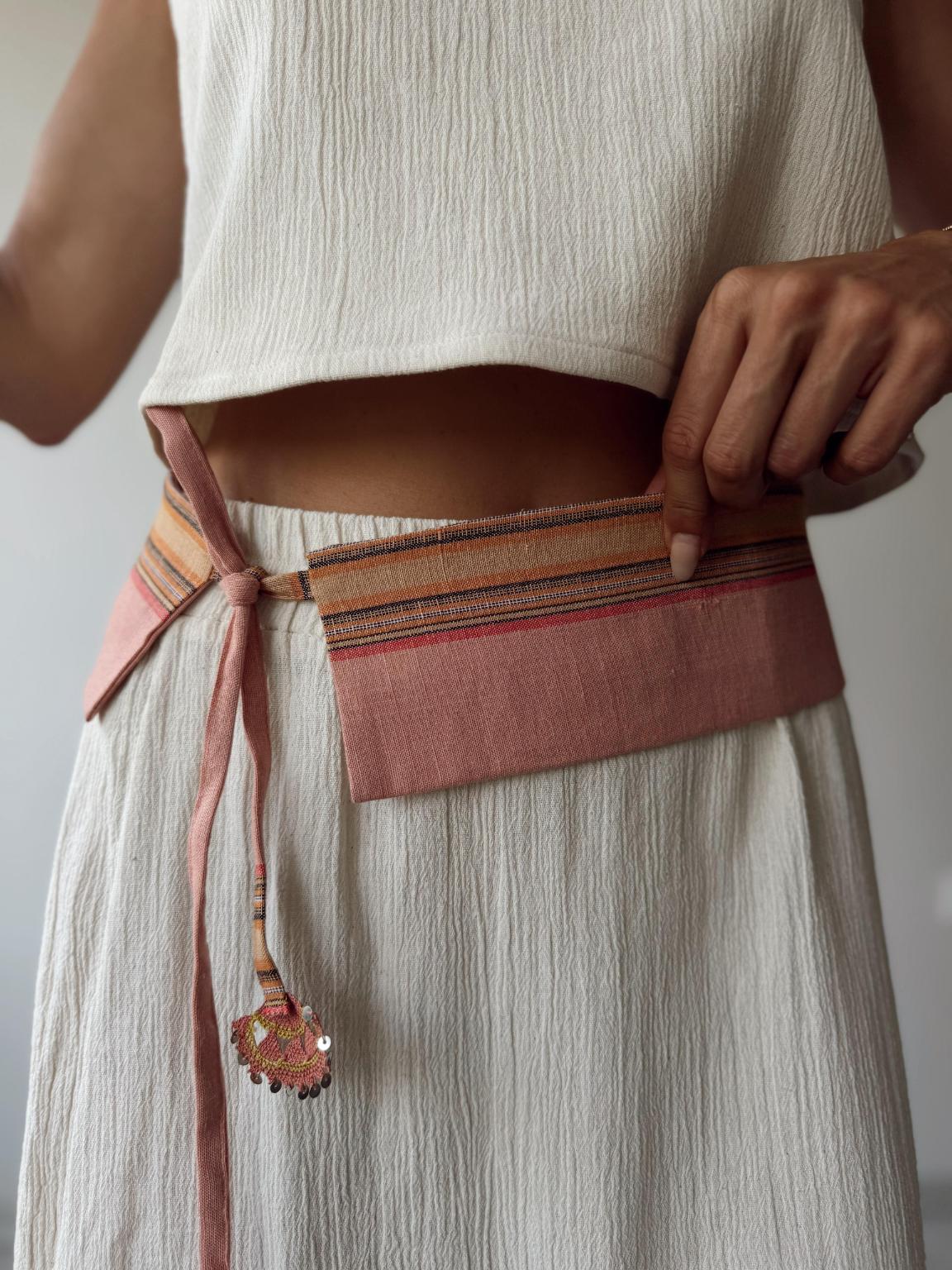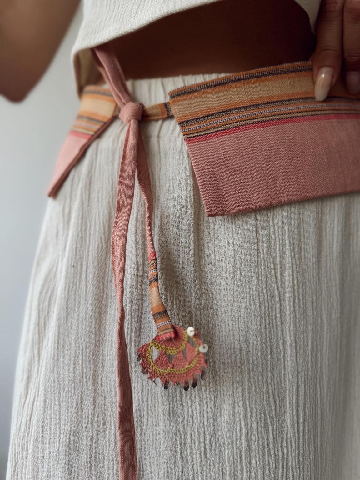 Pamuk kutnu kumaş ile tasarlanmış iğne oyası detaylı tasarım kemer