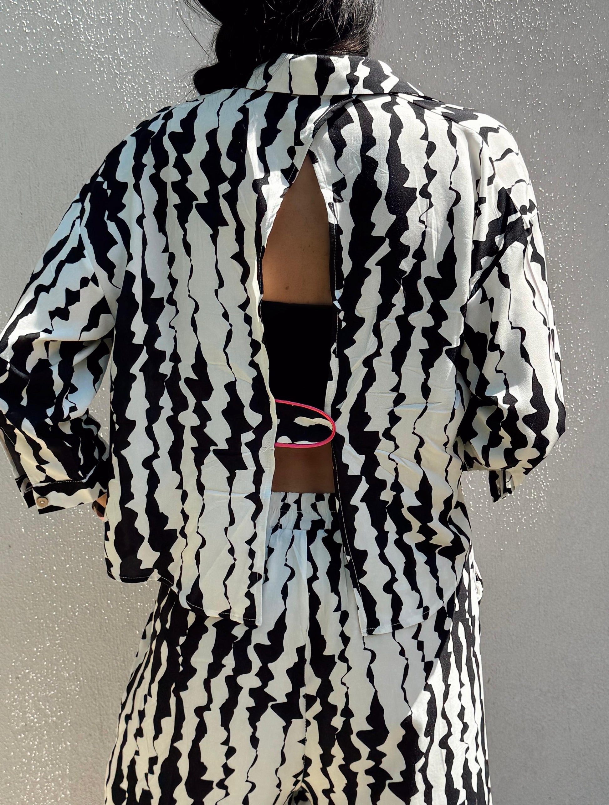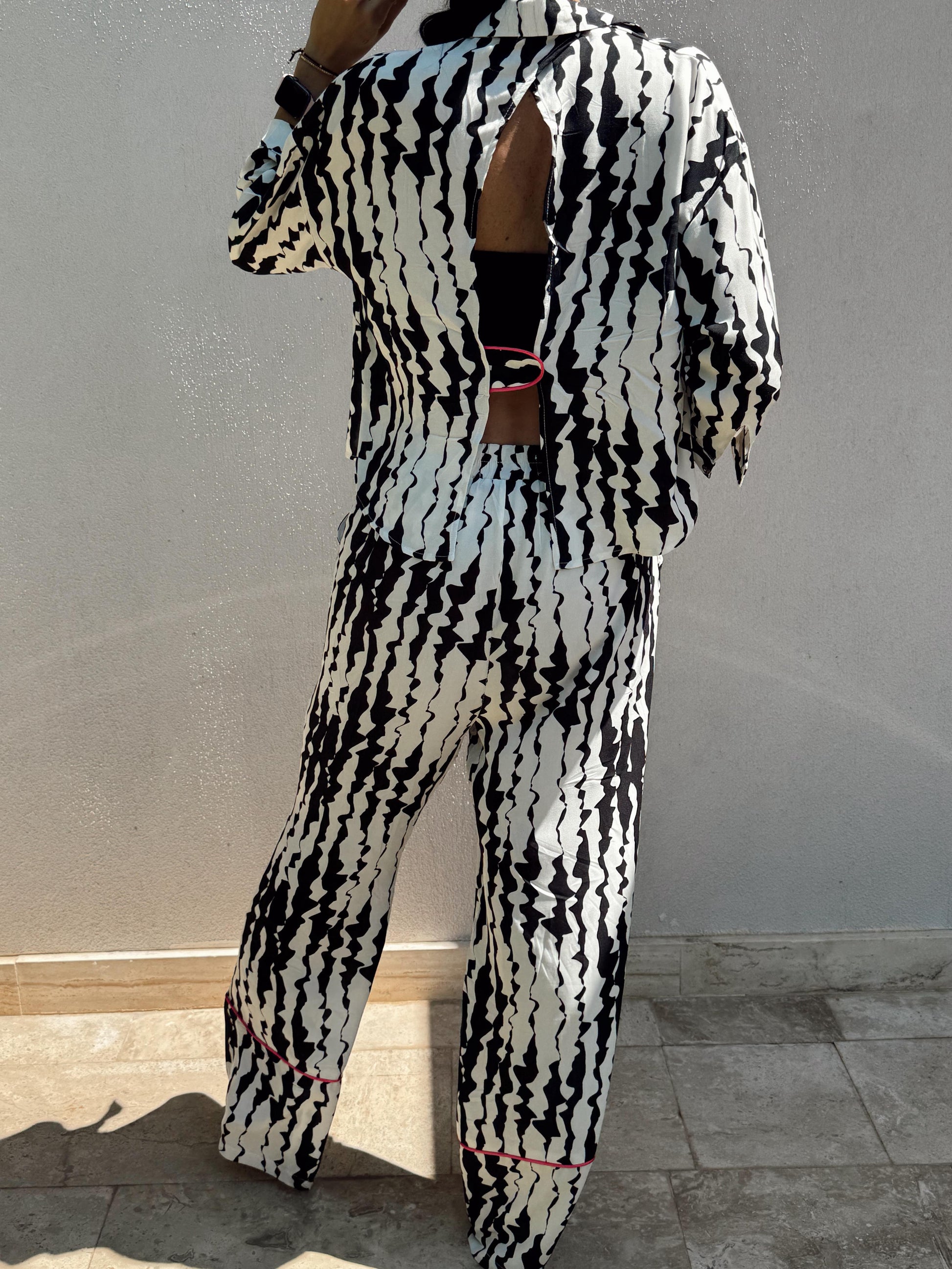 Gömlek arka kısmındaki bağlama detay ve pantolonun paçasındaki biyeler, sade tasarımı şık bir forma dönüştürür.