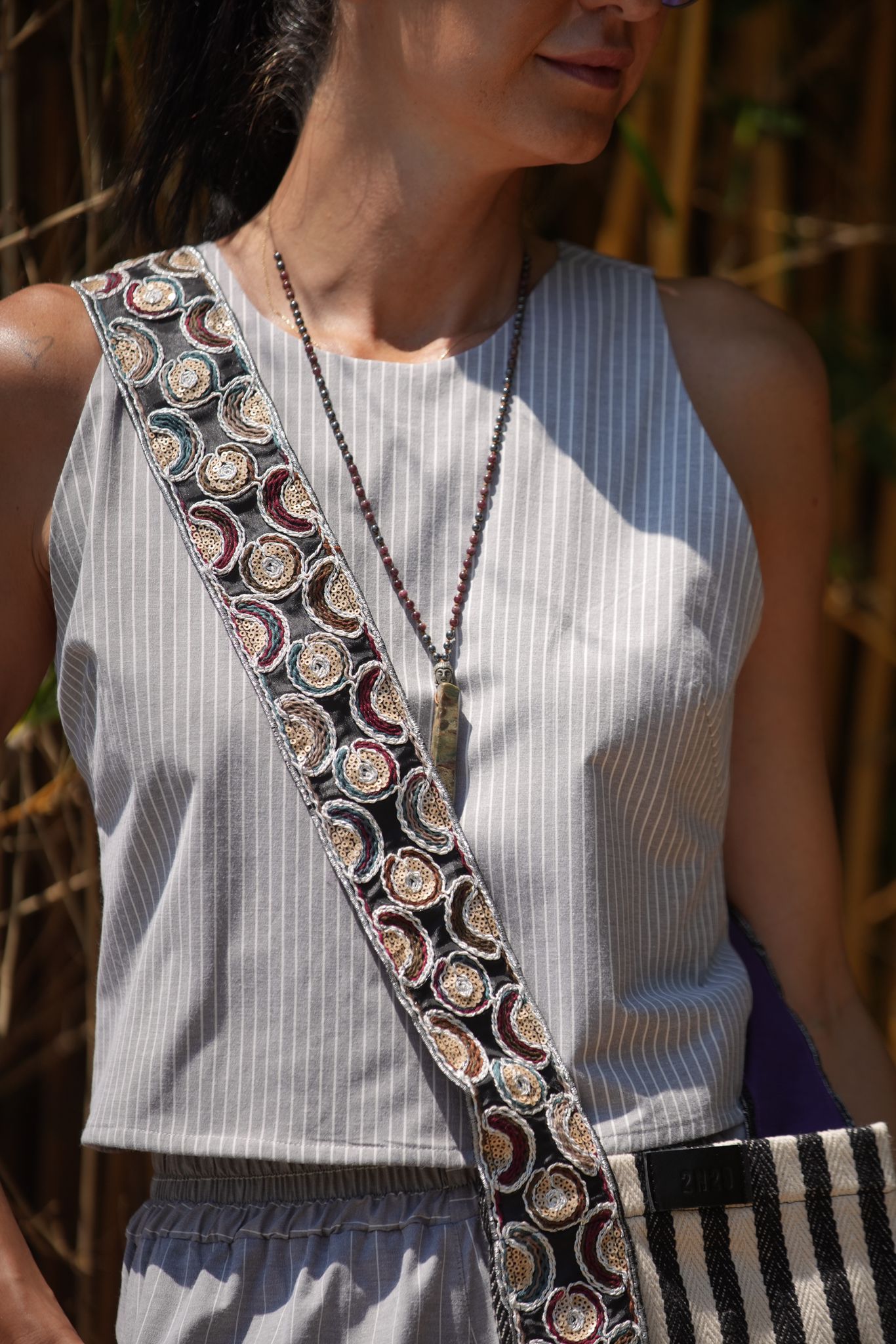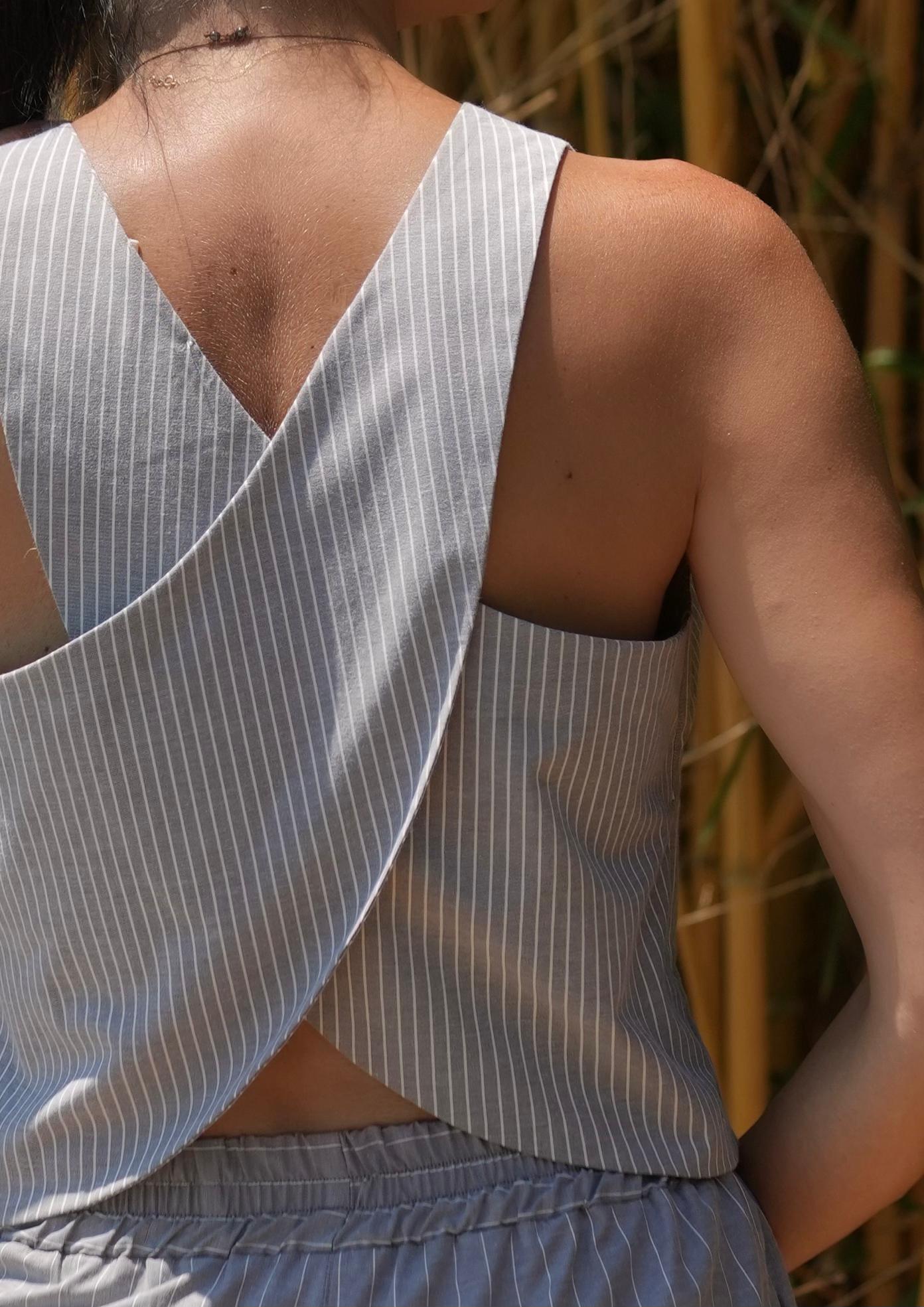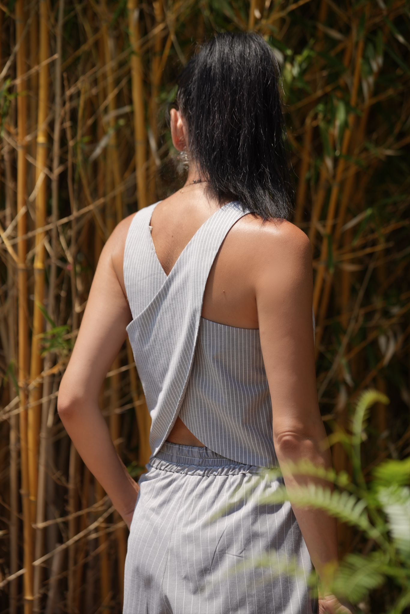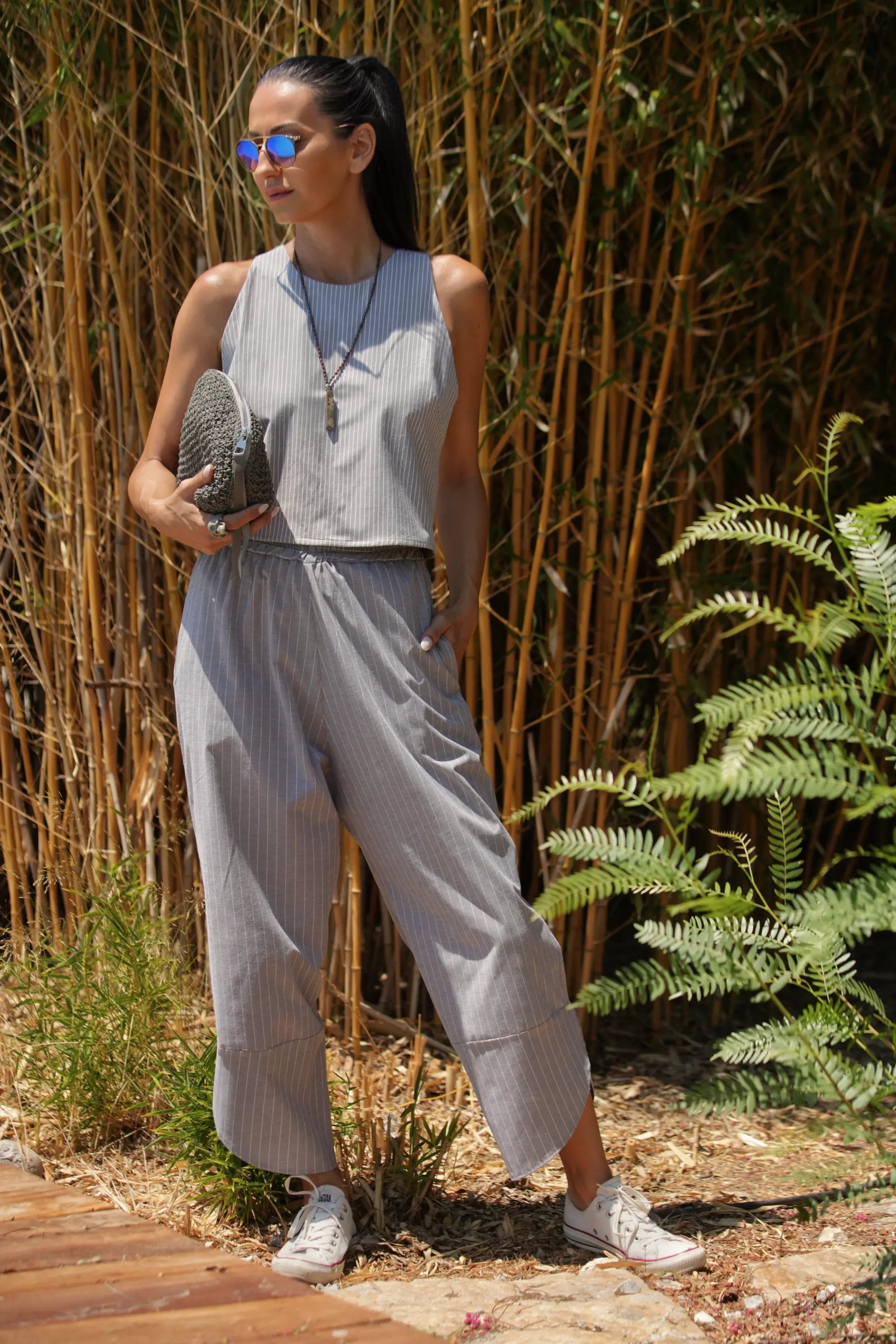 Geniş rahat kesim, paça detaylı, bel lastikli pantalon ve arkası çapraz model kısa gri renk çizgili bluz