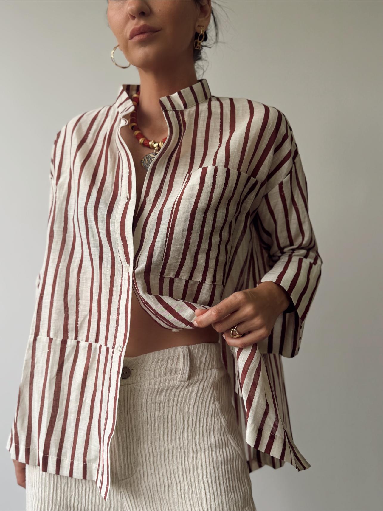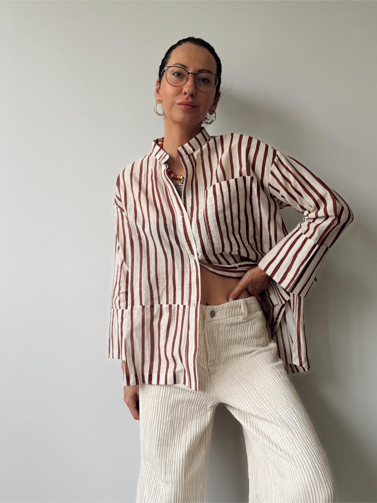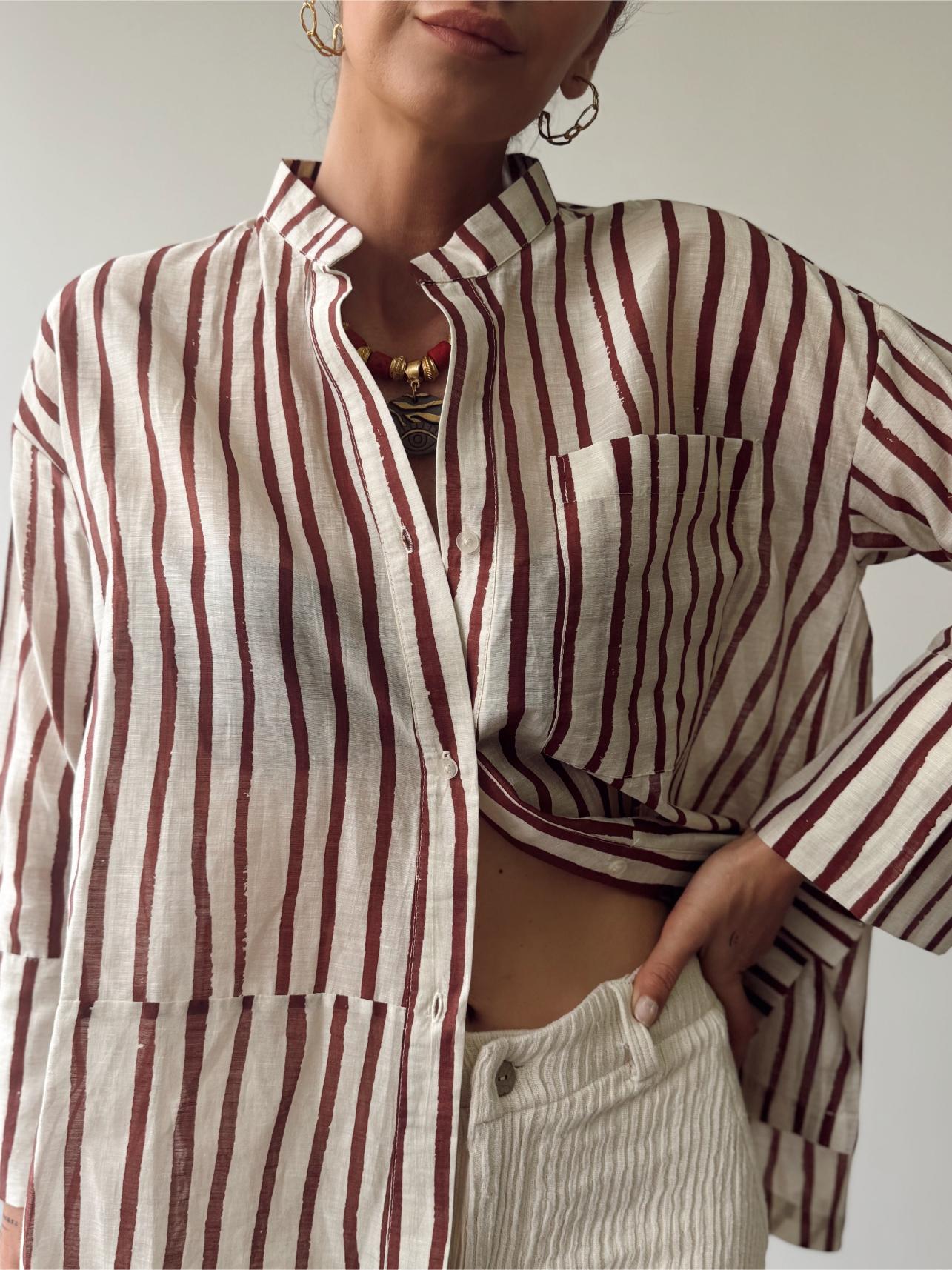 Bordo çizgi desenli, rahat bol kesim, geniş kol ağızlı, hakim yaka pamuklu gömlek