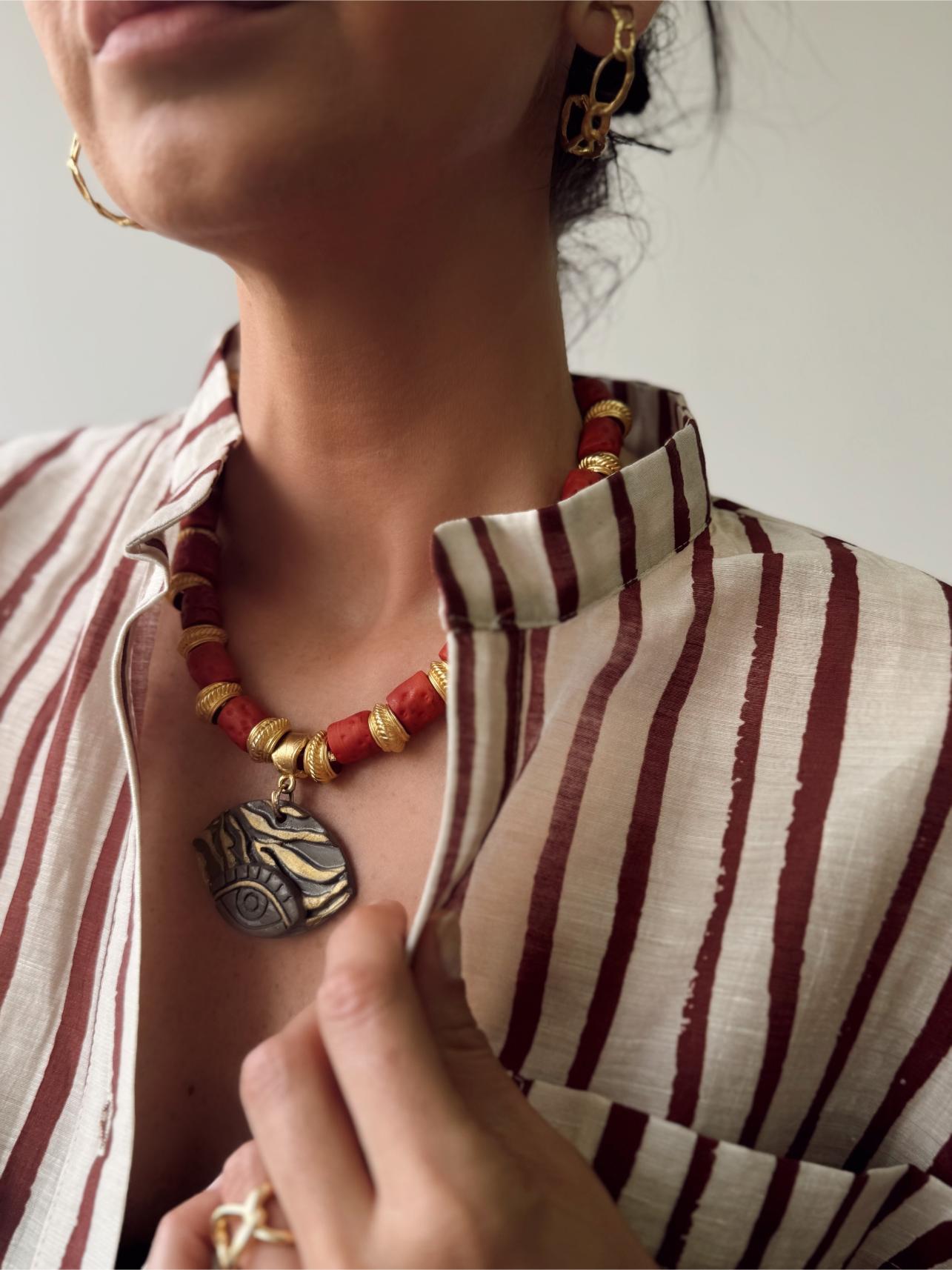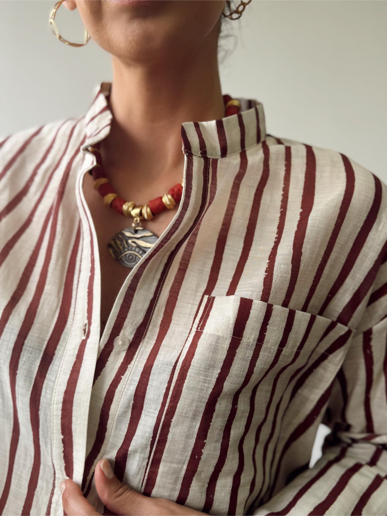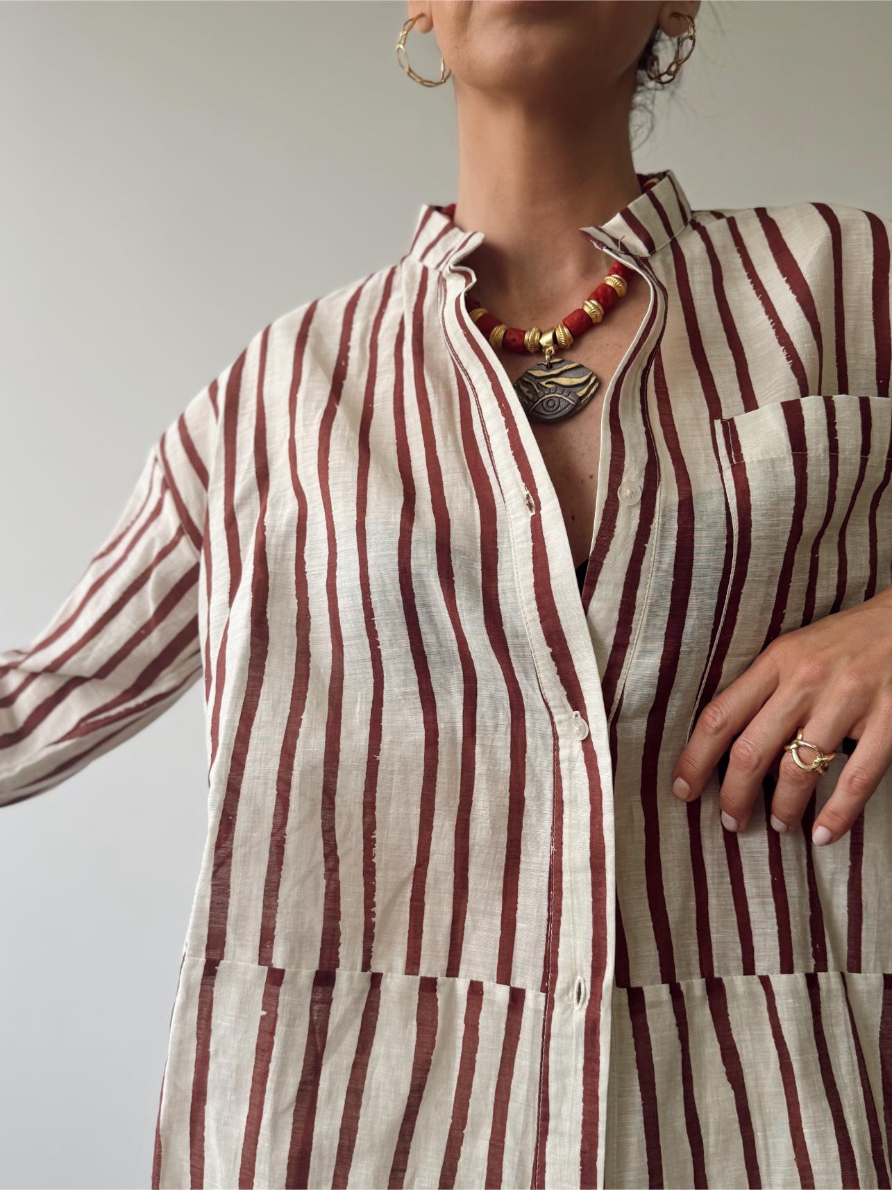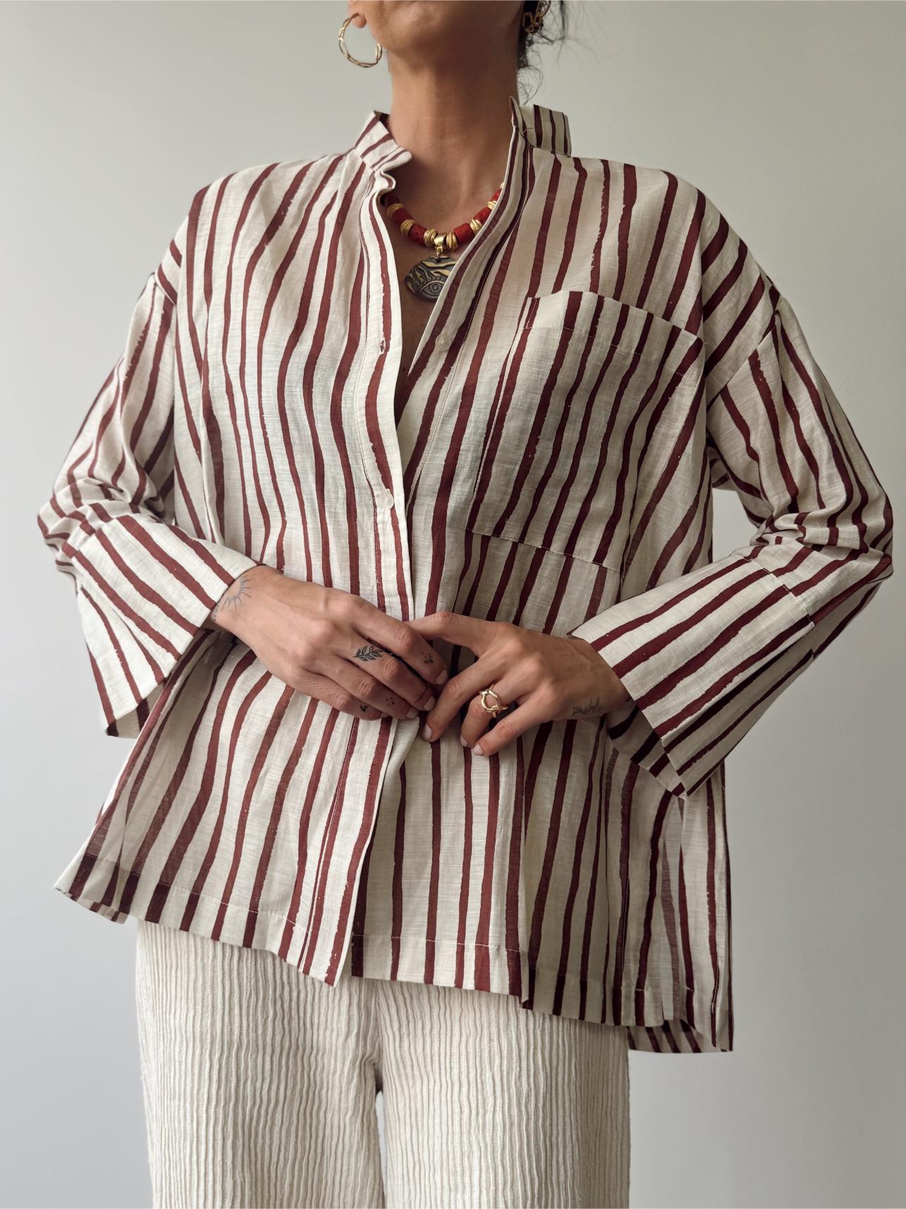 Bordo çizgi desenli, rahat bol kesim, geniş kol ağızlı, hakim yaka pamuklu gömlek