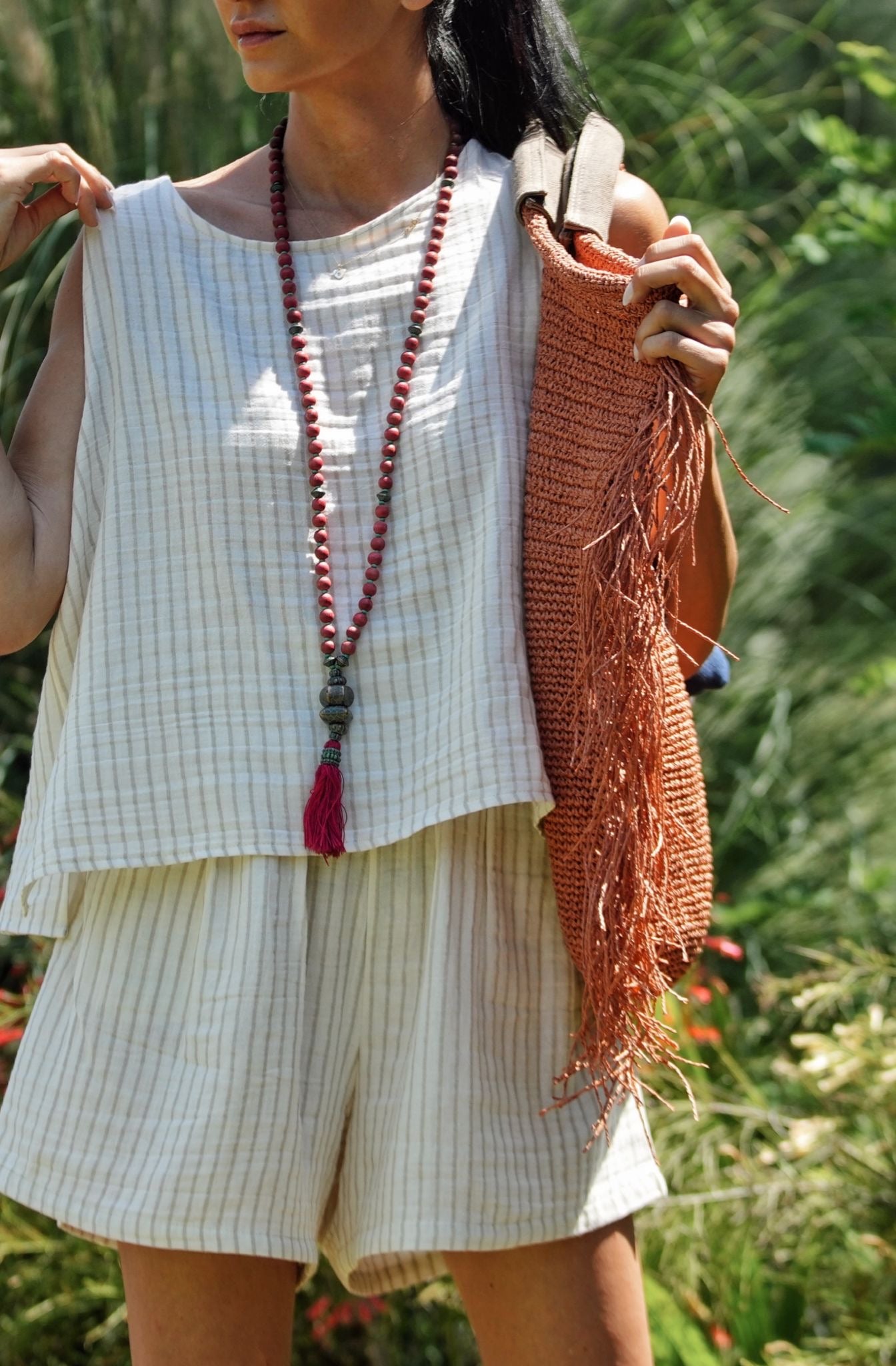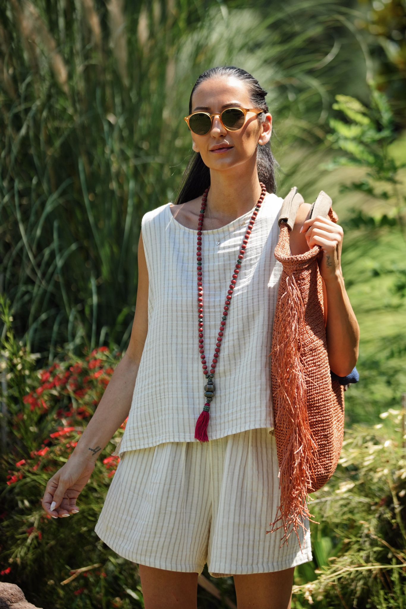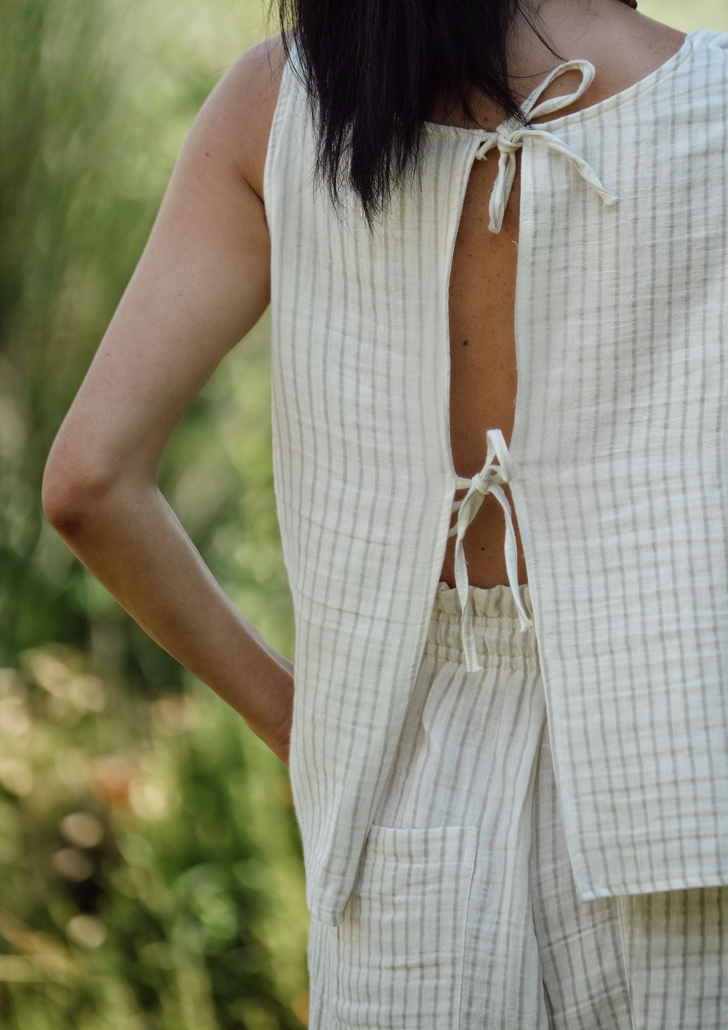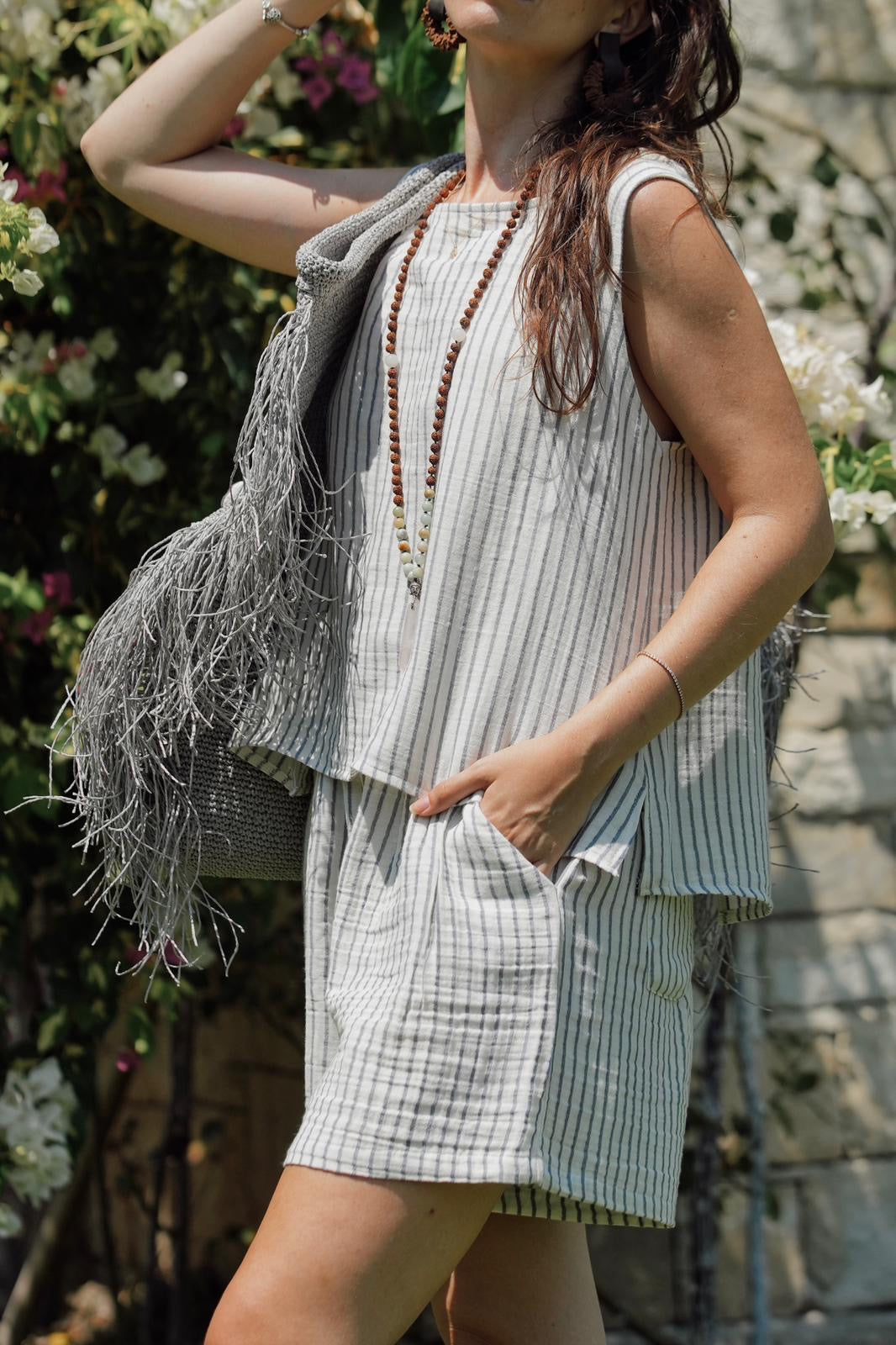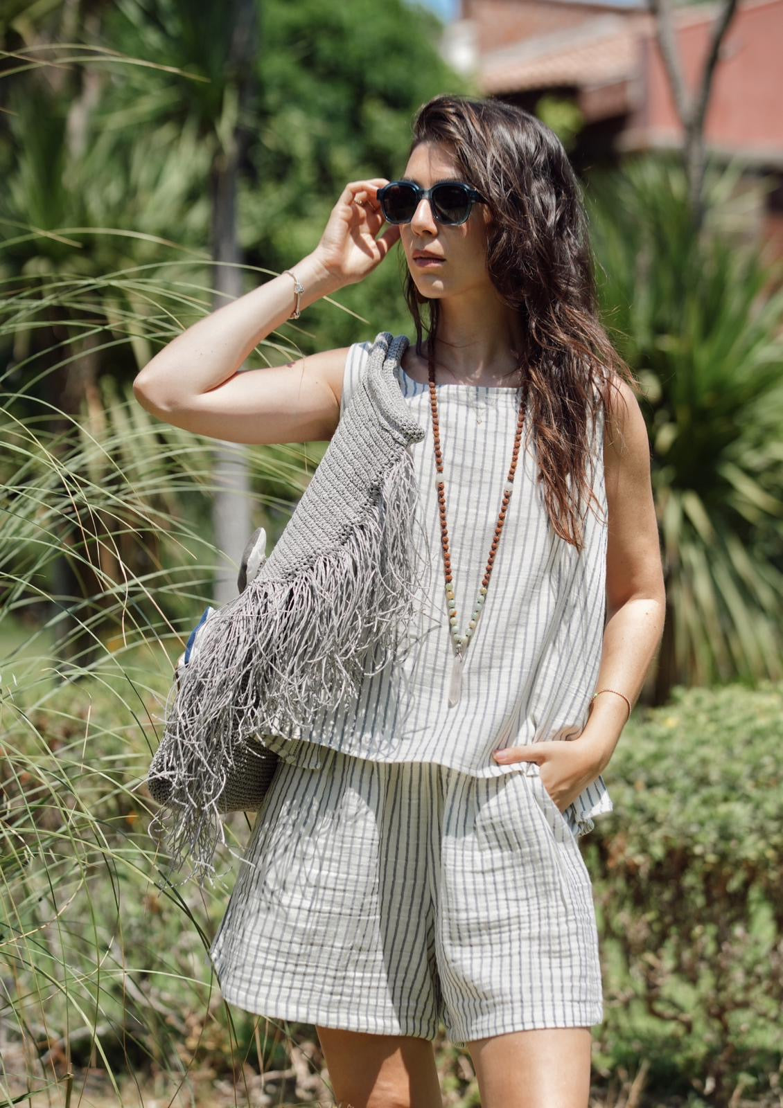 Beli lastikli rahat kesim şort ve arka detayı ip bağlamalı çizgili müslin bluz.