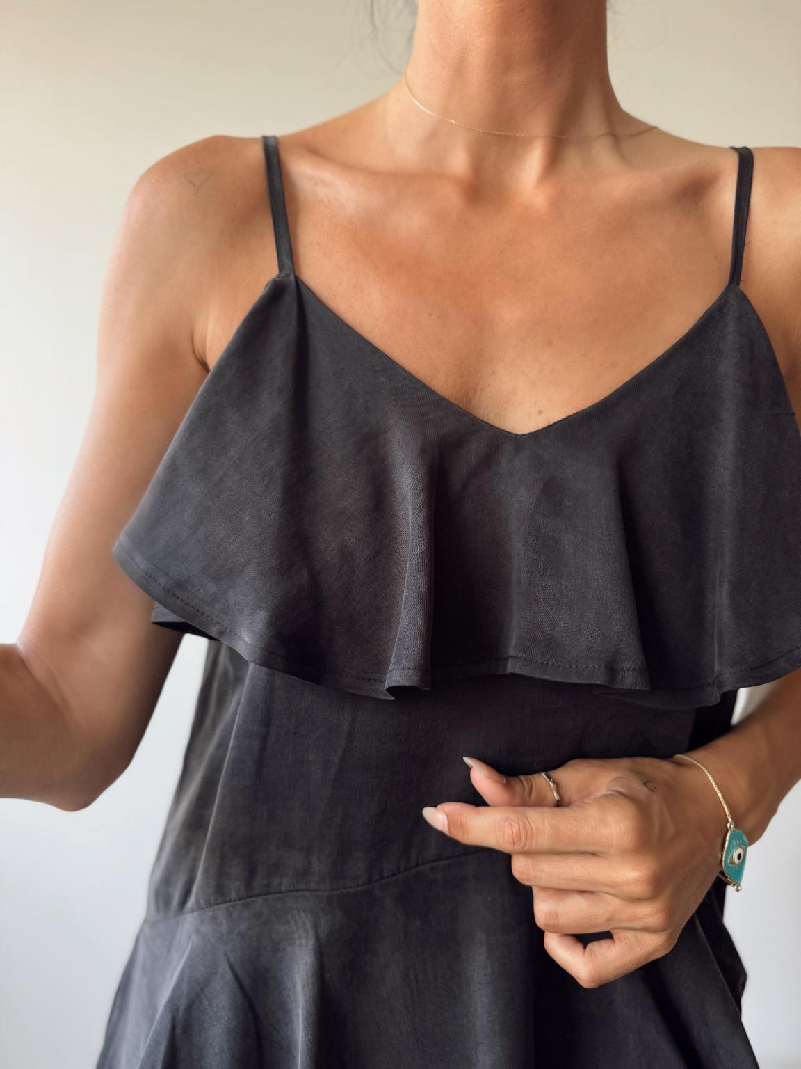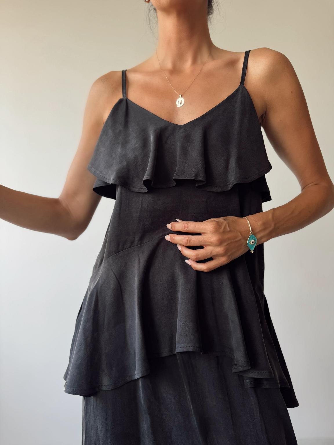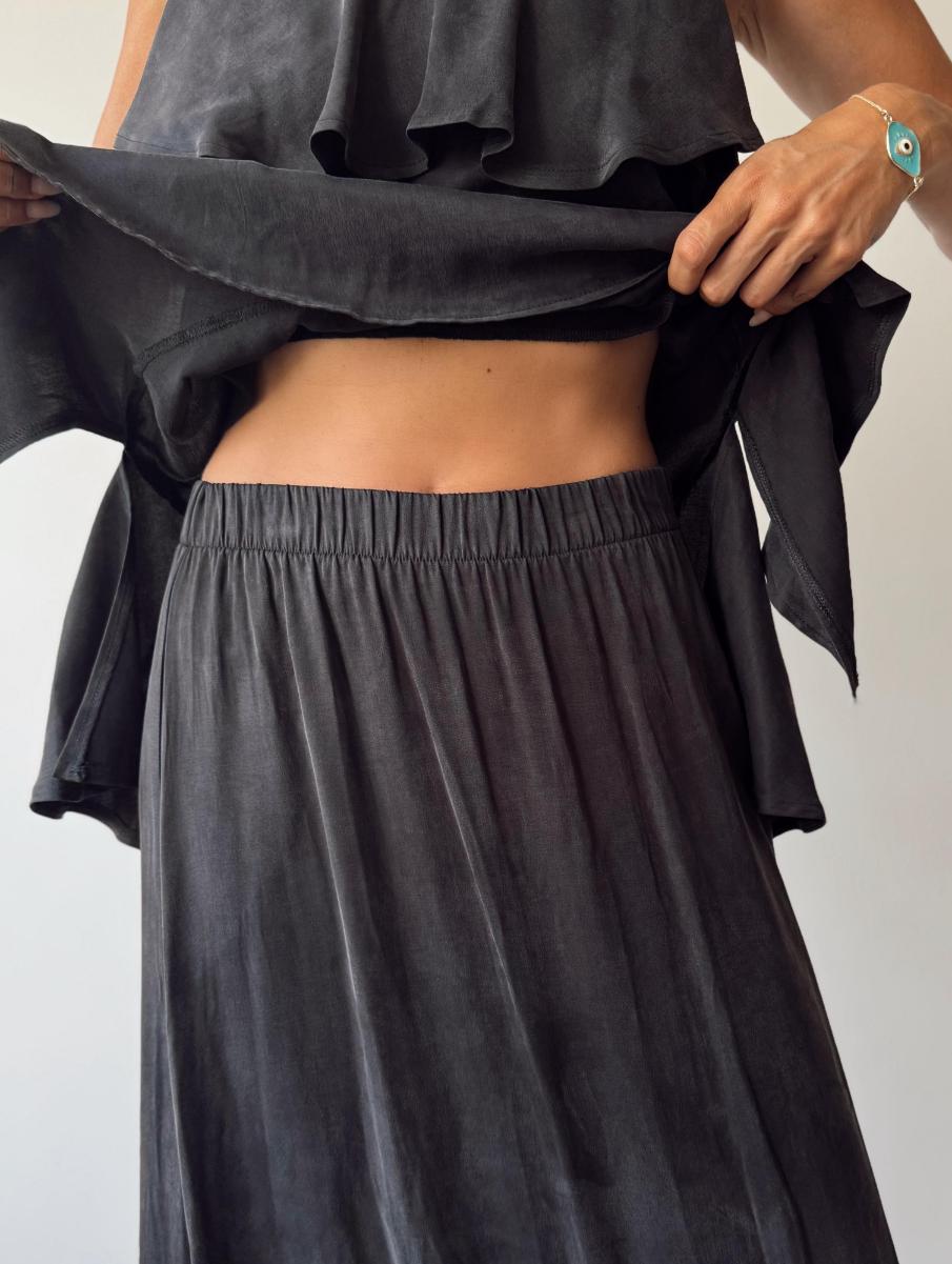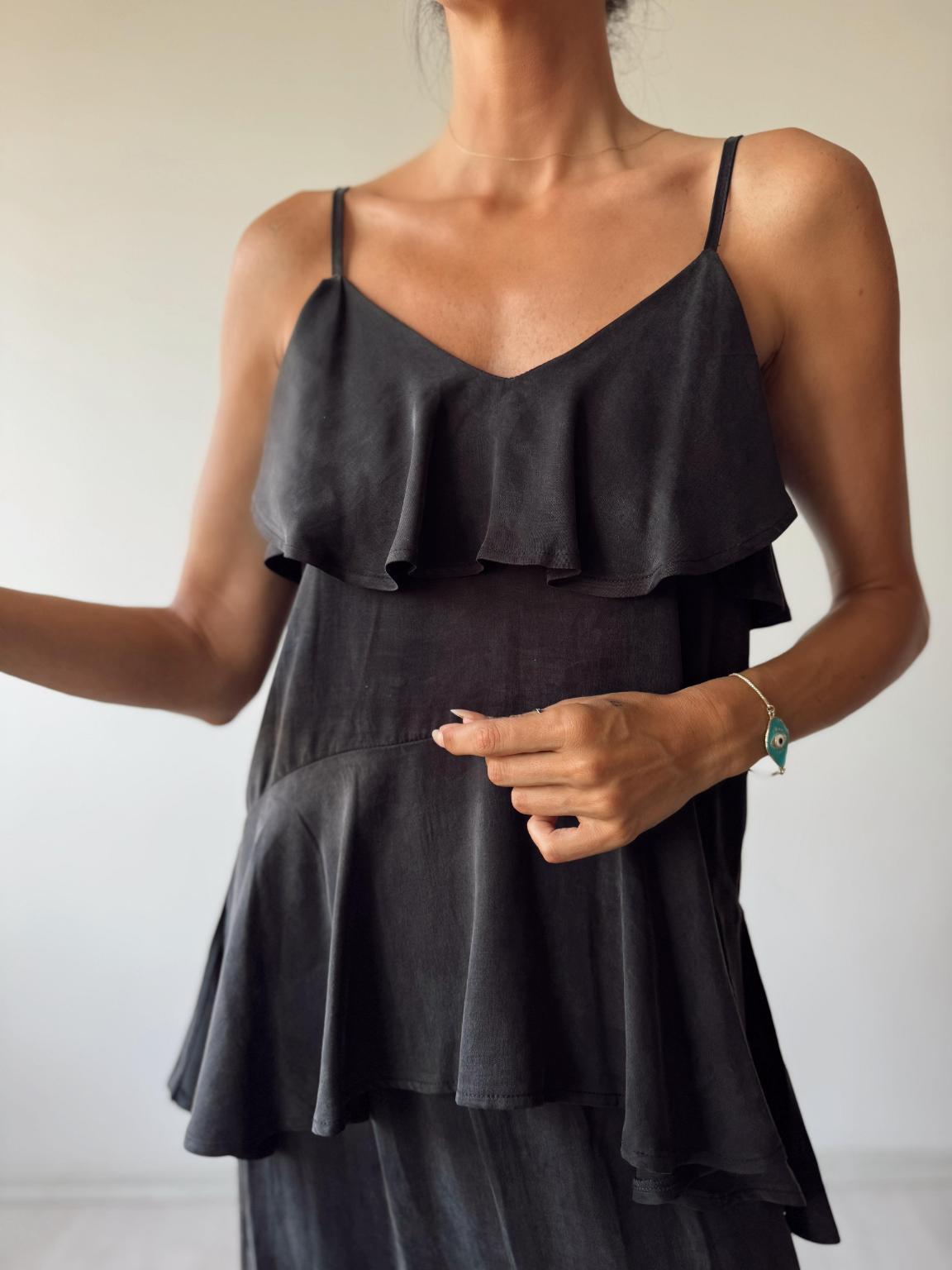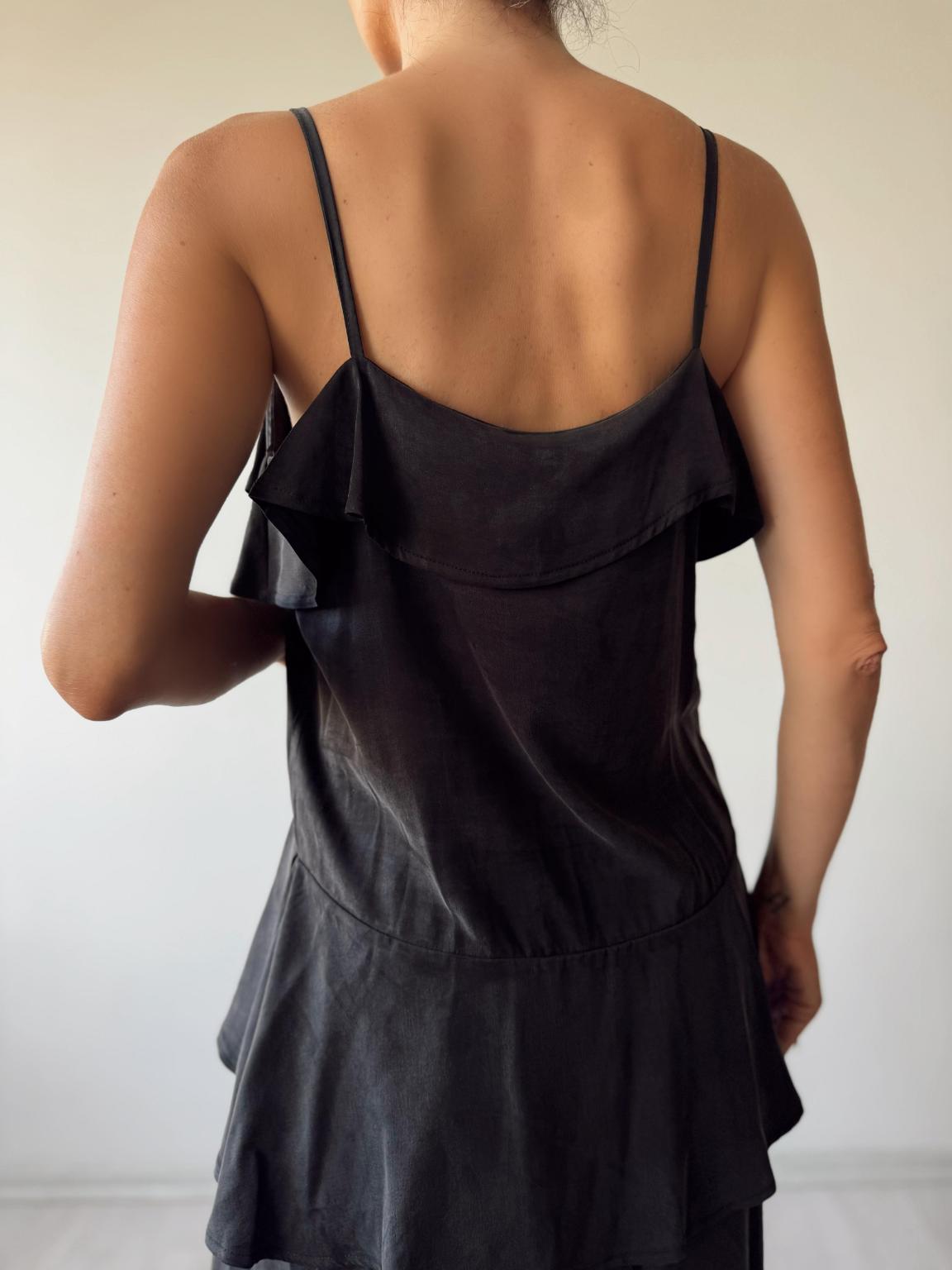 Liyosel taşlanmış kumaş ile tasarlanmış beli lastikli etek ucu fırfır detaylı, ince askılı etek ucu fırfır detaylı bluz takım