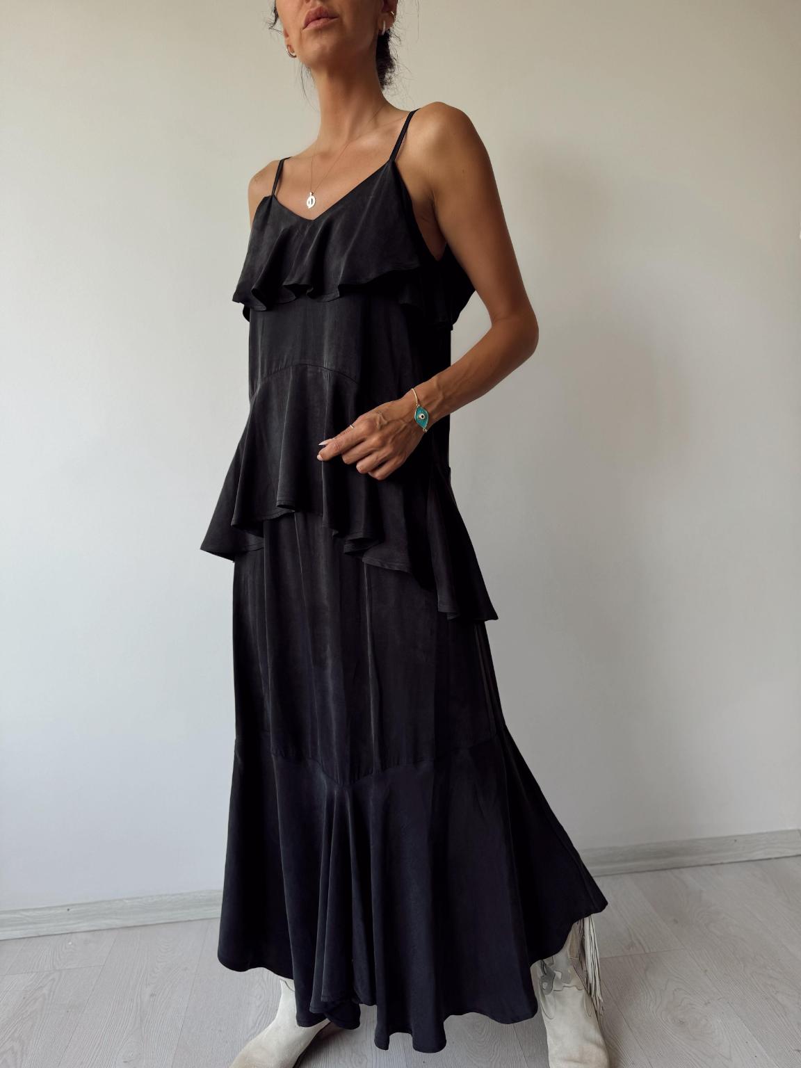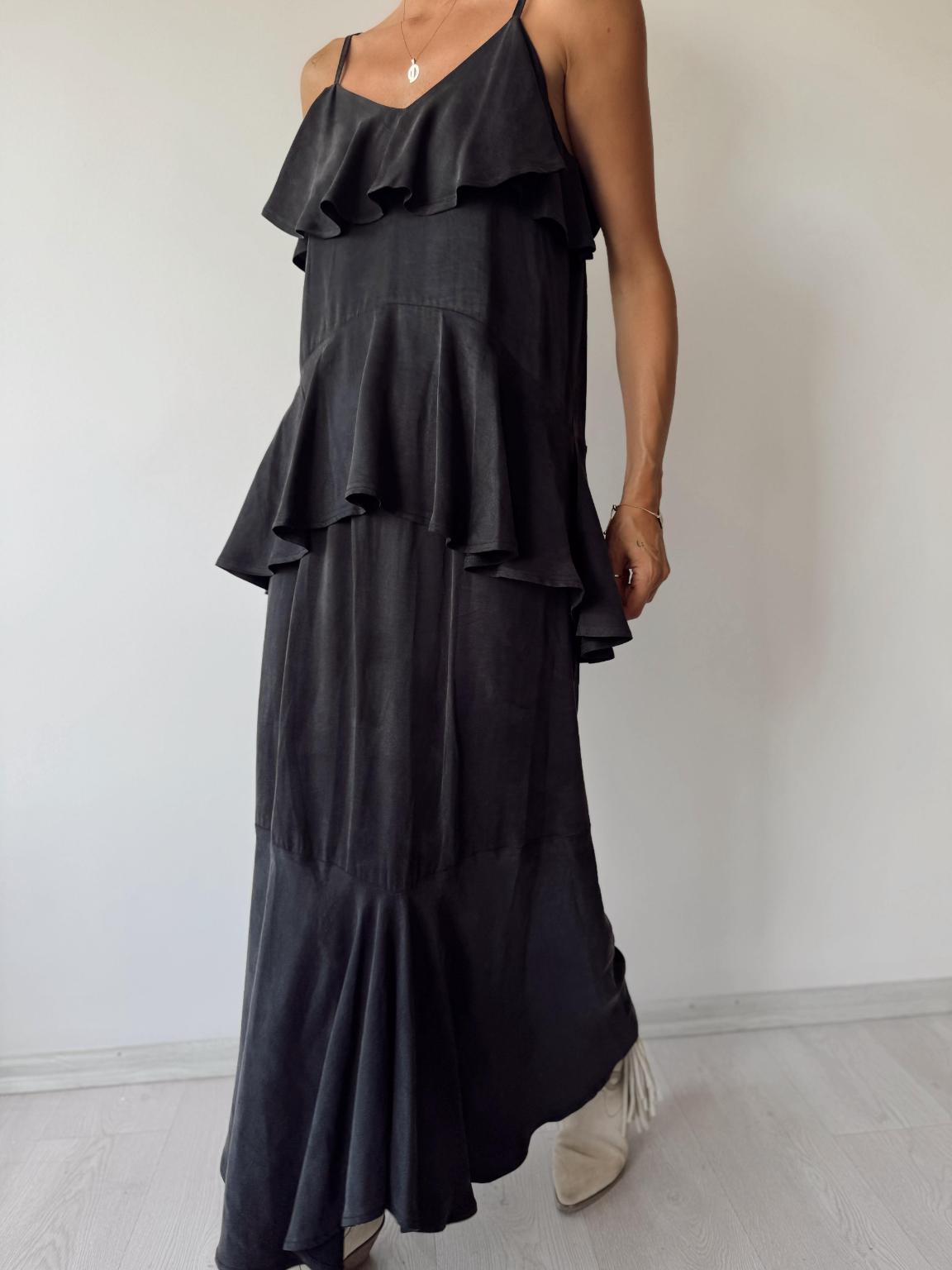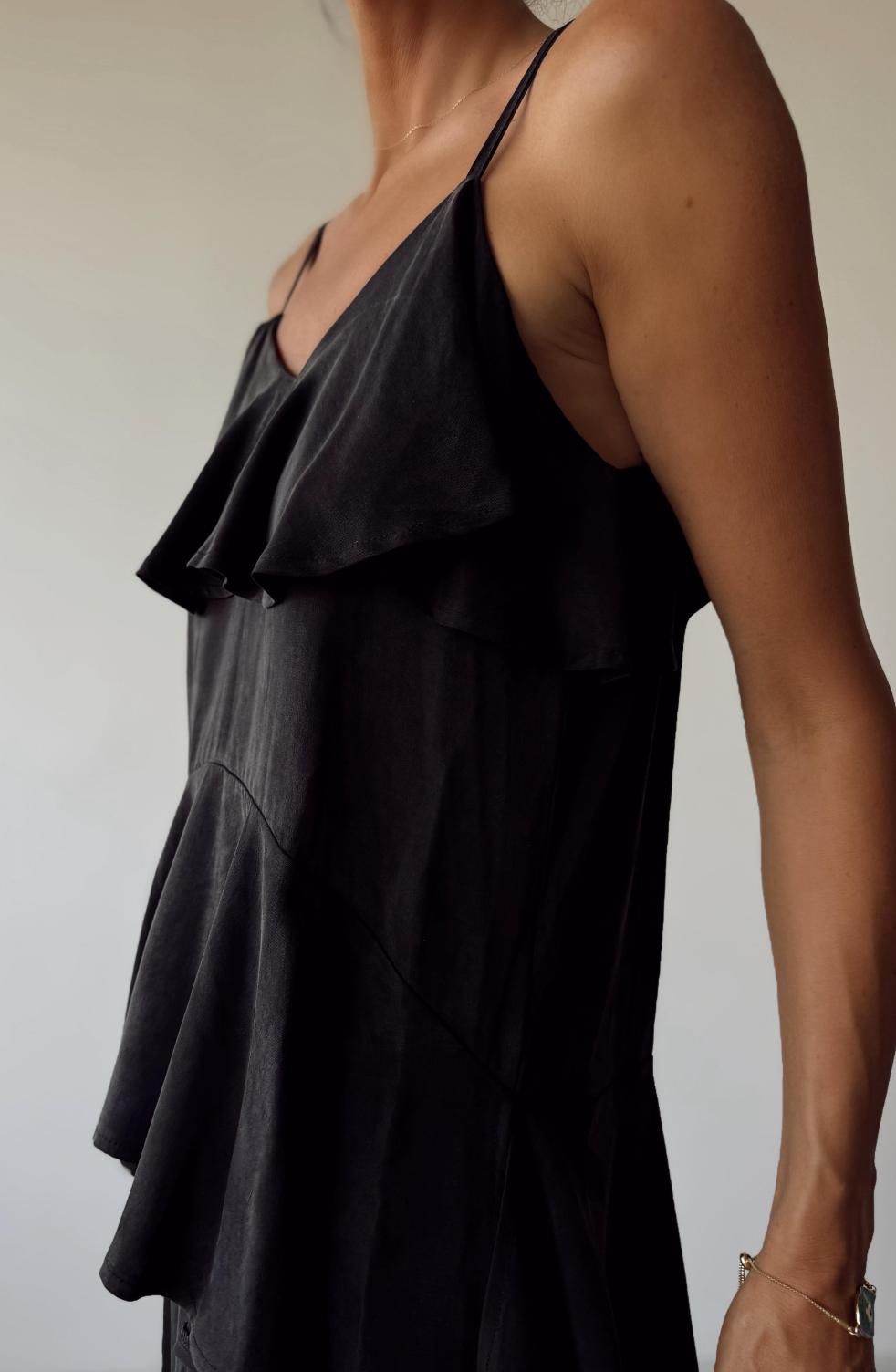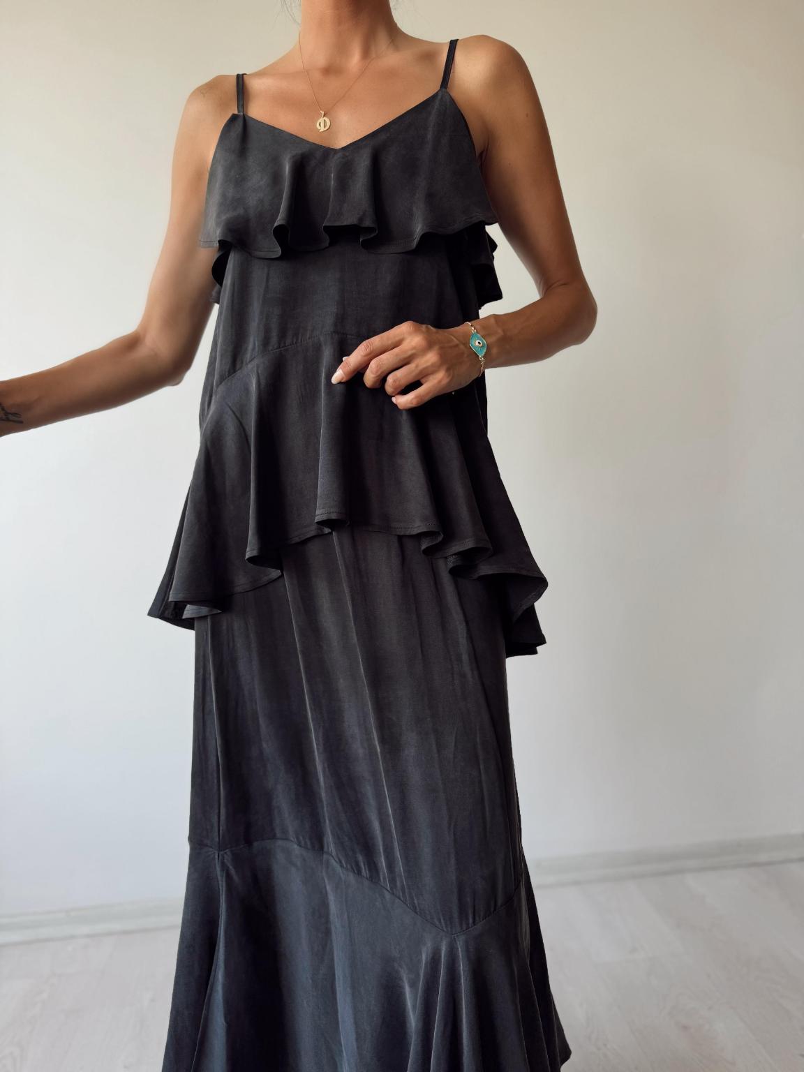 Liyosel taşlanmış kumaş ile tasarlanmış beli lastikli etek ucu fırfır detaylı, ince askılı etek ucu fırfır detaylı bluz takım