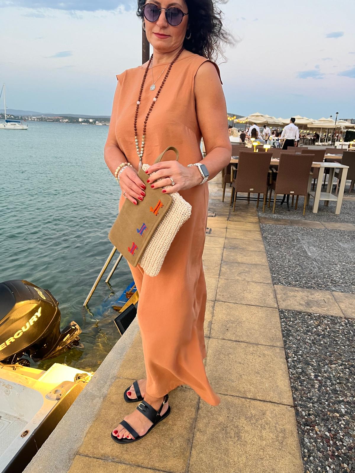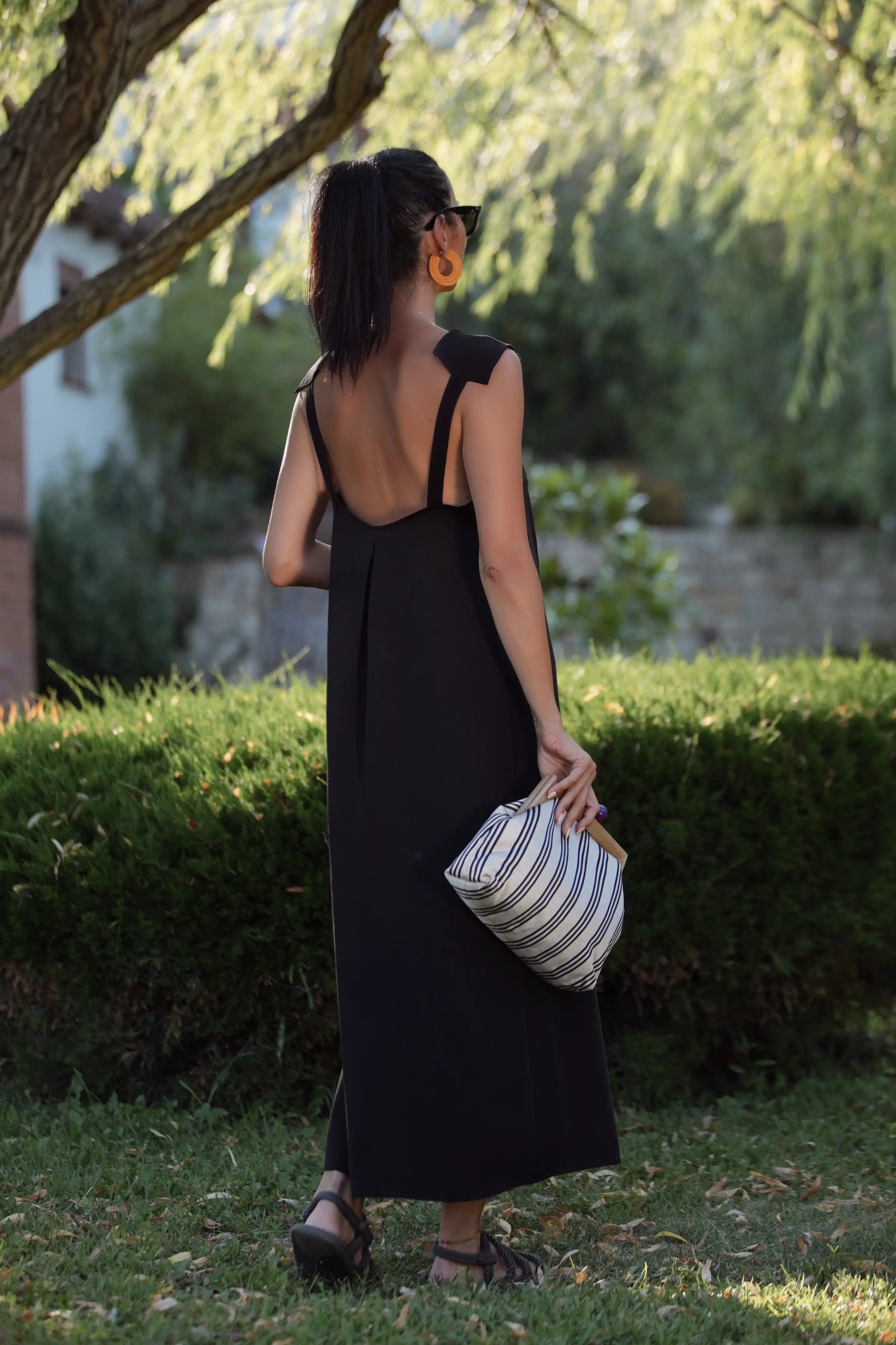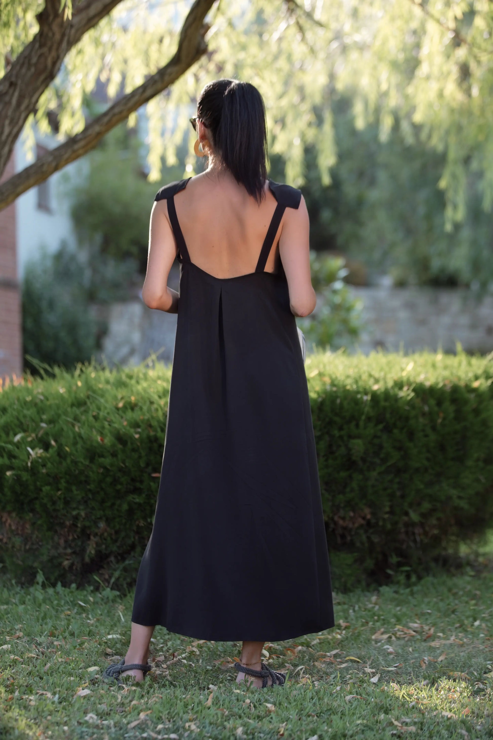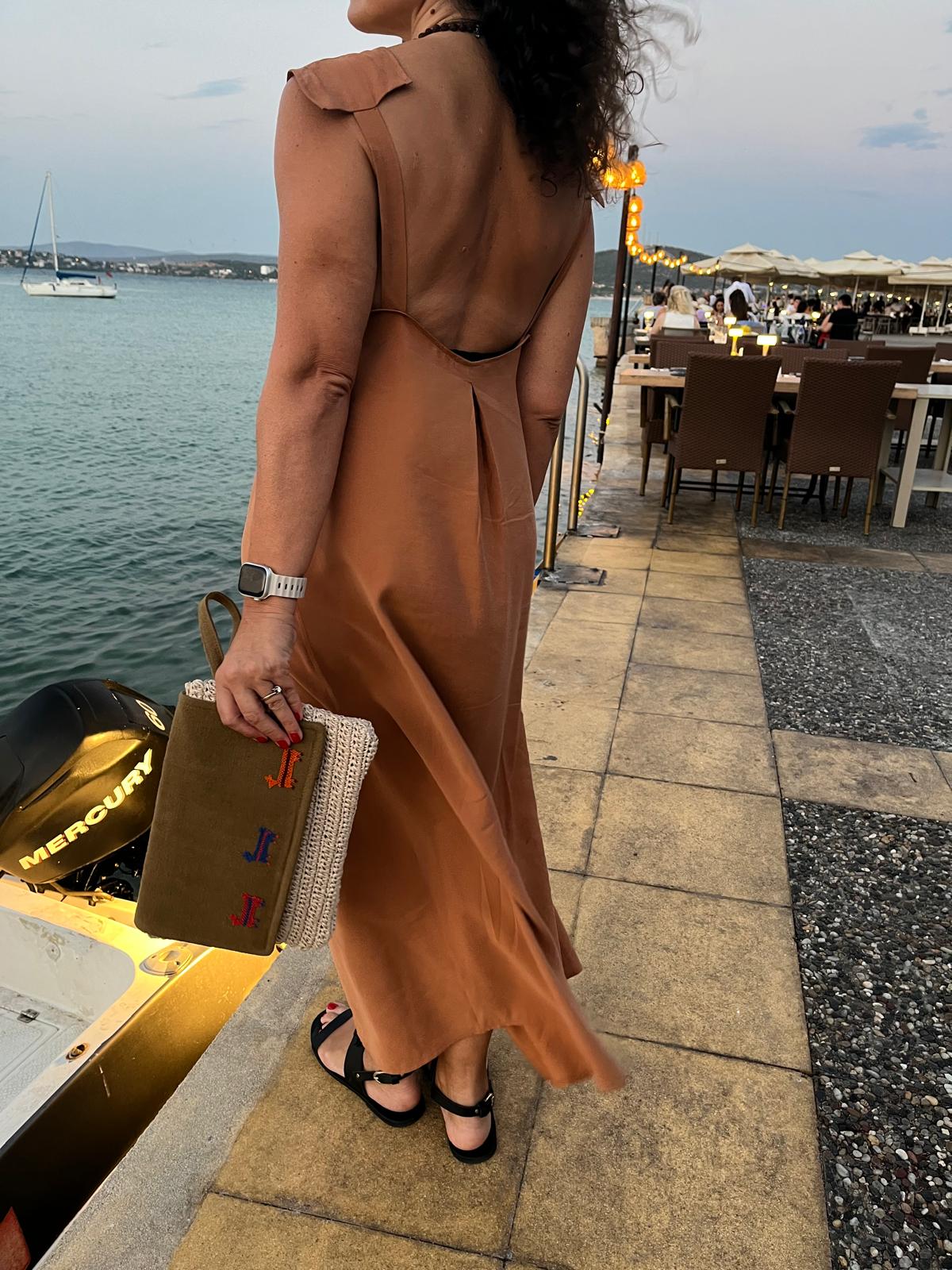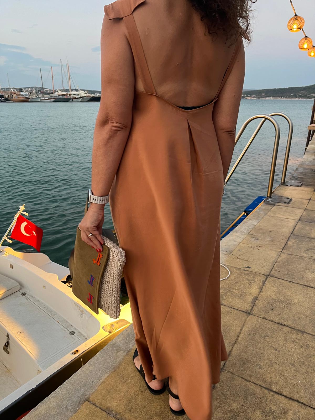 Derin sırt dekolteli, omuz detaylı uzun modal kumaştan elbise.