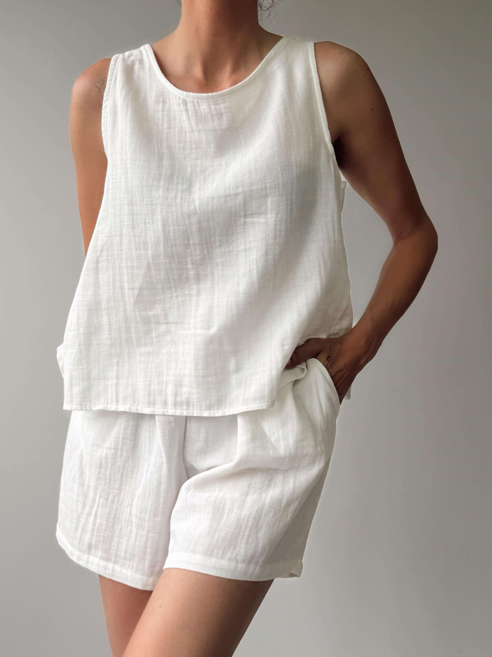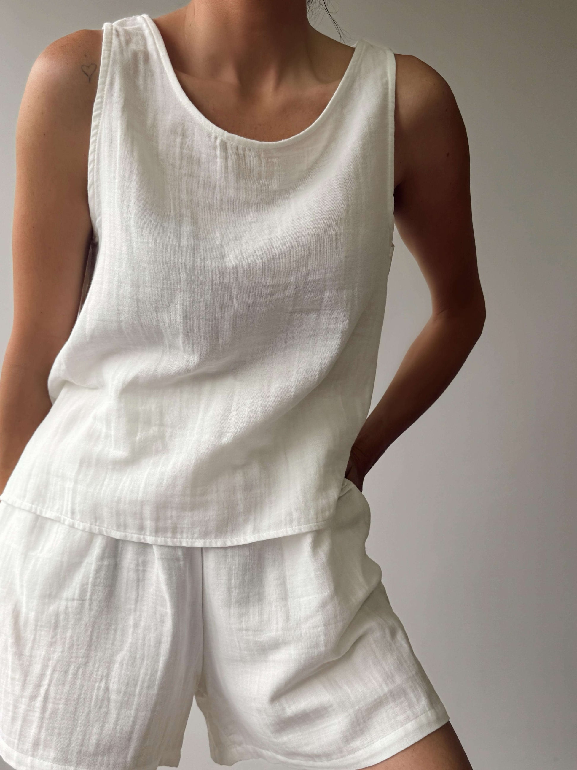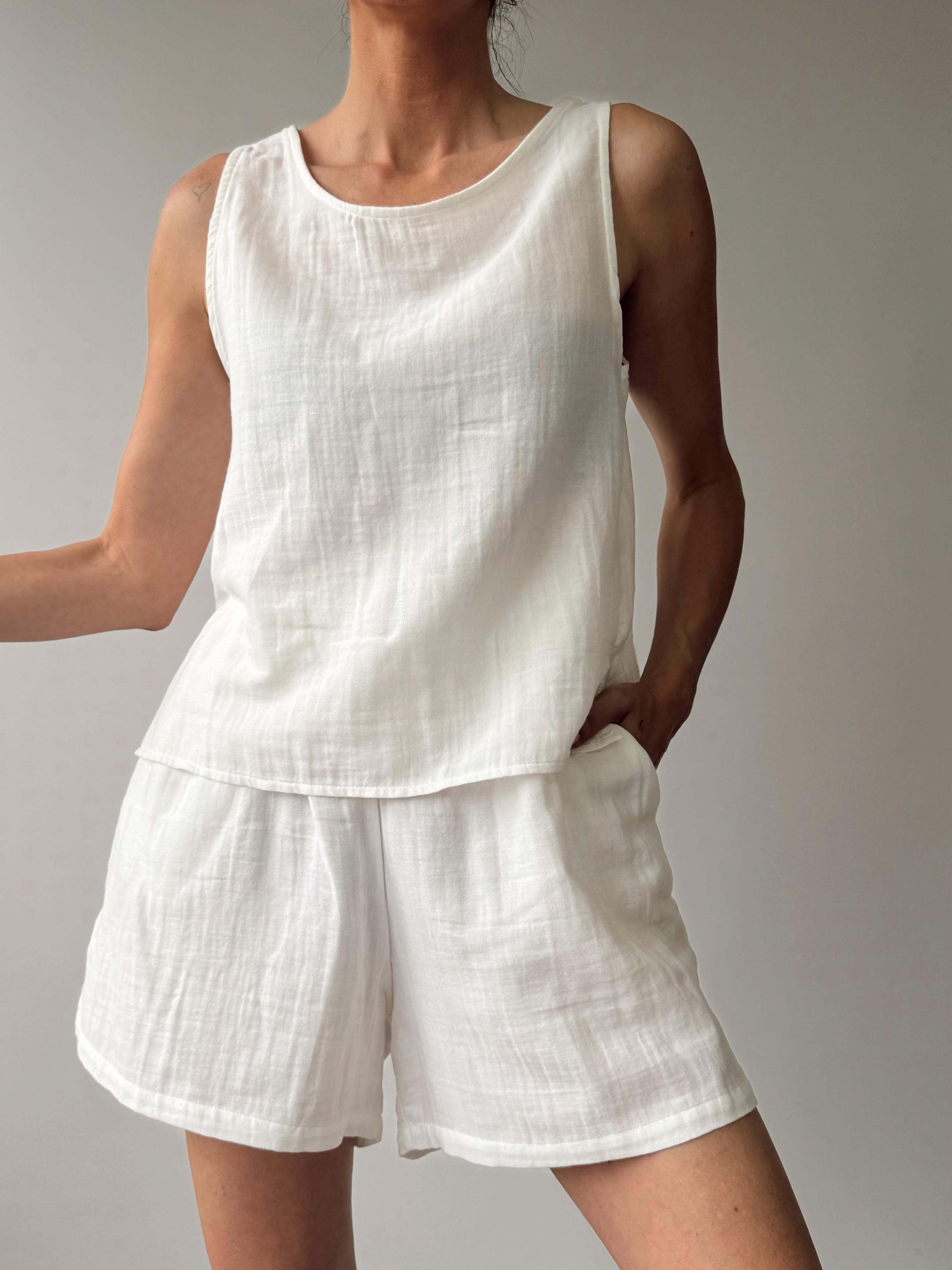 Beli lastikli rahat kesim şort ve arka detayı ip bağlamalı müslin bluz