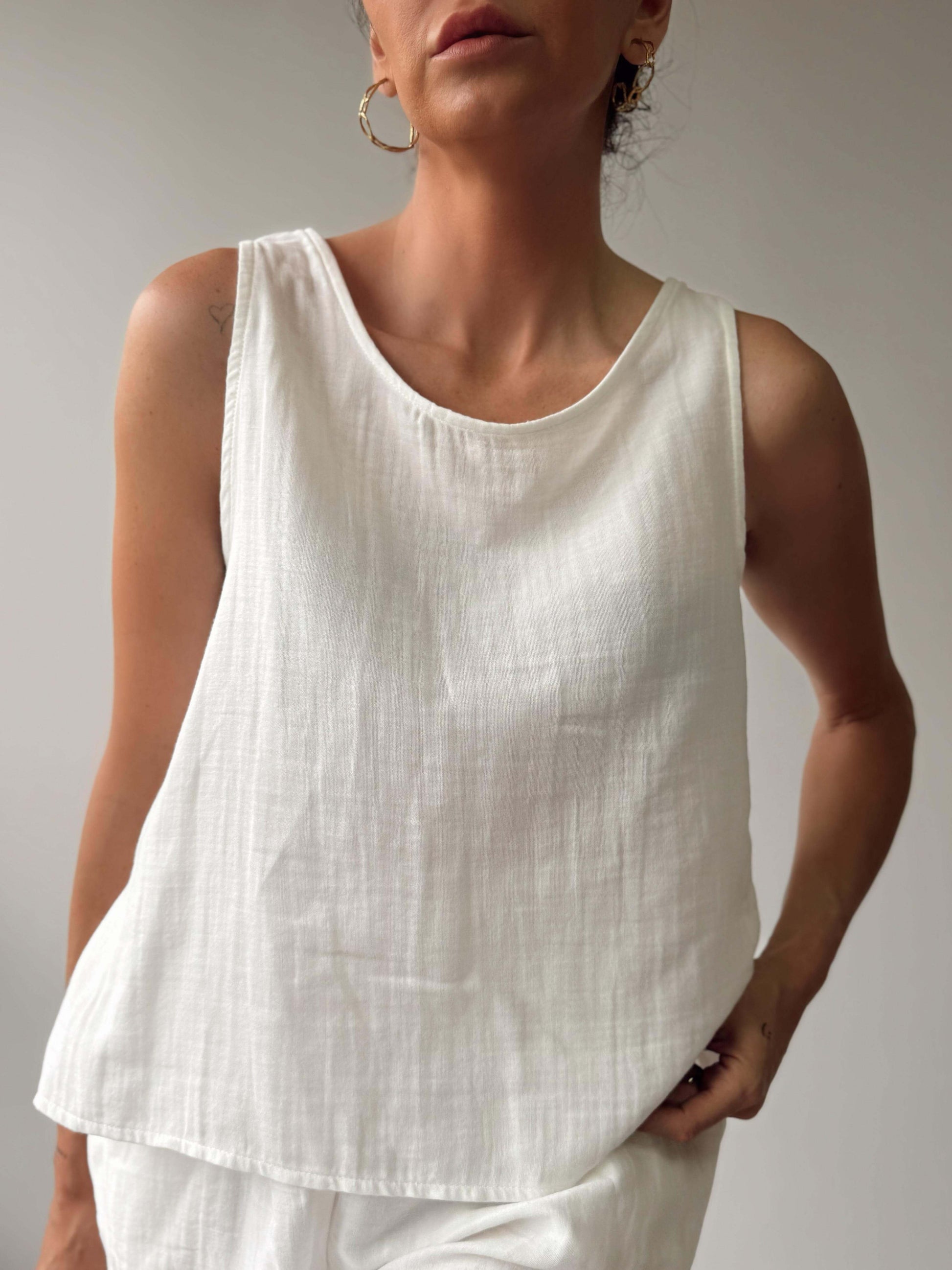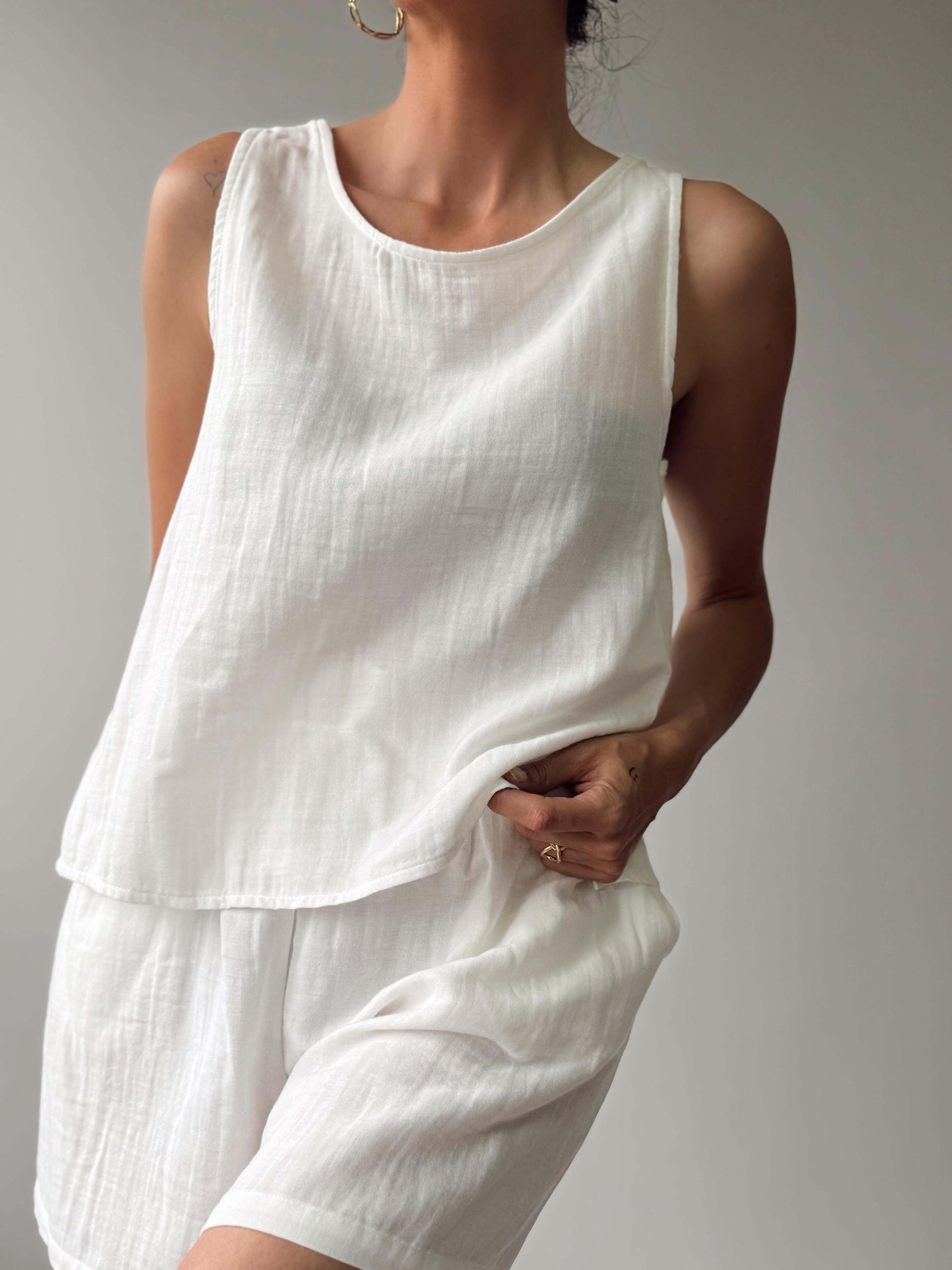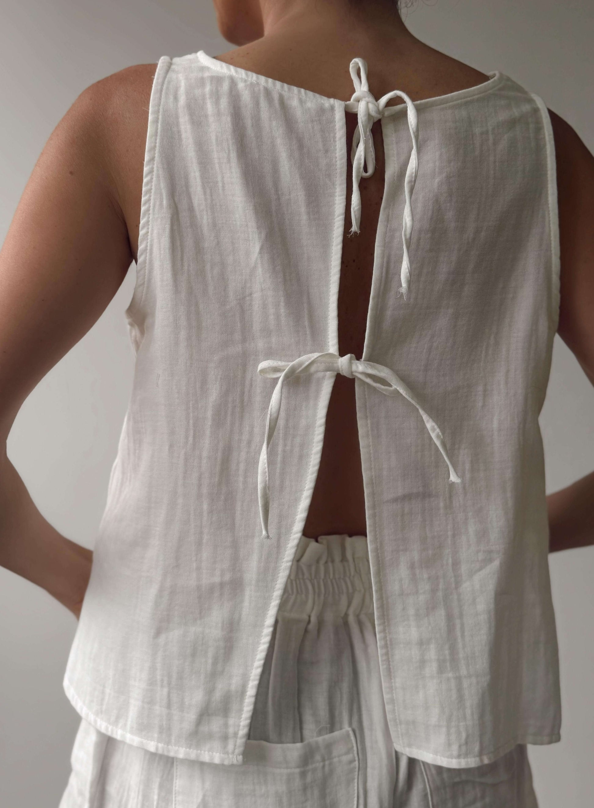 Beli lastikli rahat kesim şort ve arka detayı ip bağlamalı müslin bluz
