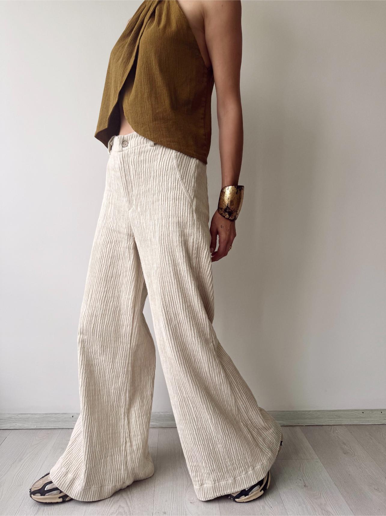Uzun geniş paça, rahat kesim, arka bel lastikli, tavas dokuma kumaş ile tasarlanmış pantolon