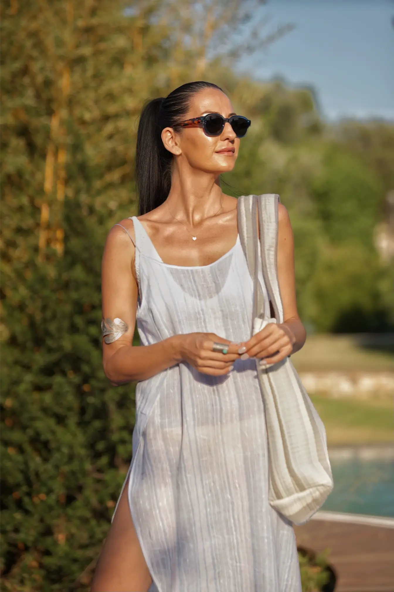 İnce askılı, ön ve arka kısmı V yaka, yan derin yırtmaçlı, bürümcük dokuma asimetrik elbise
