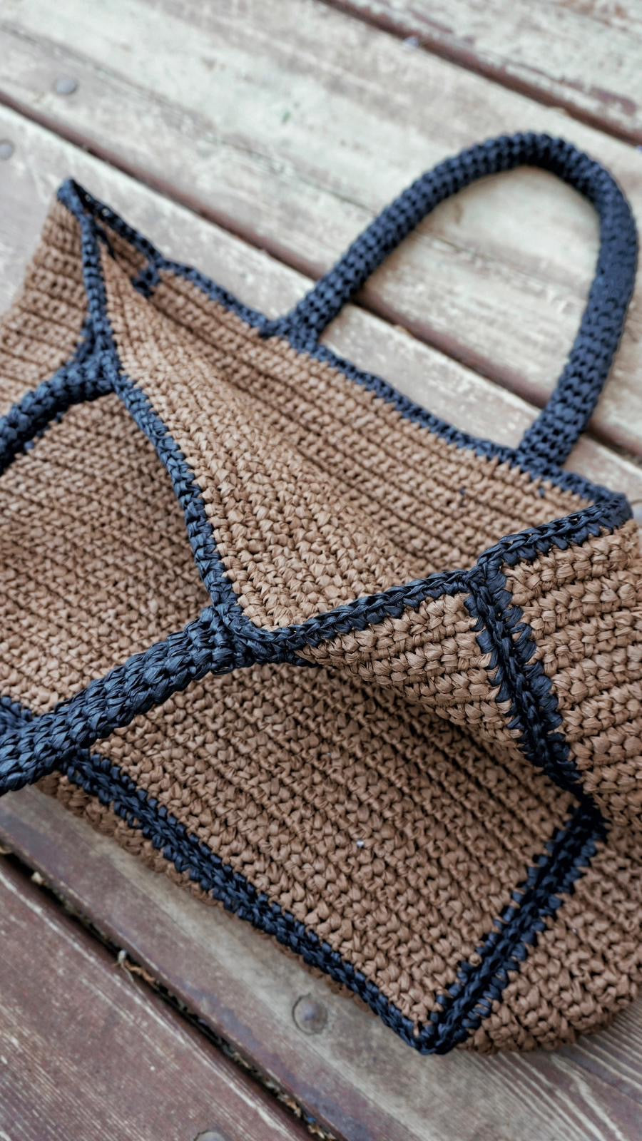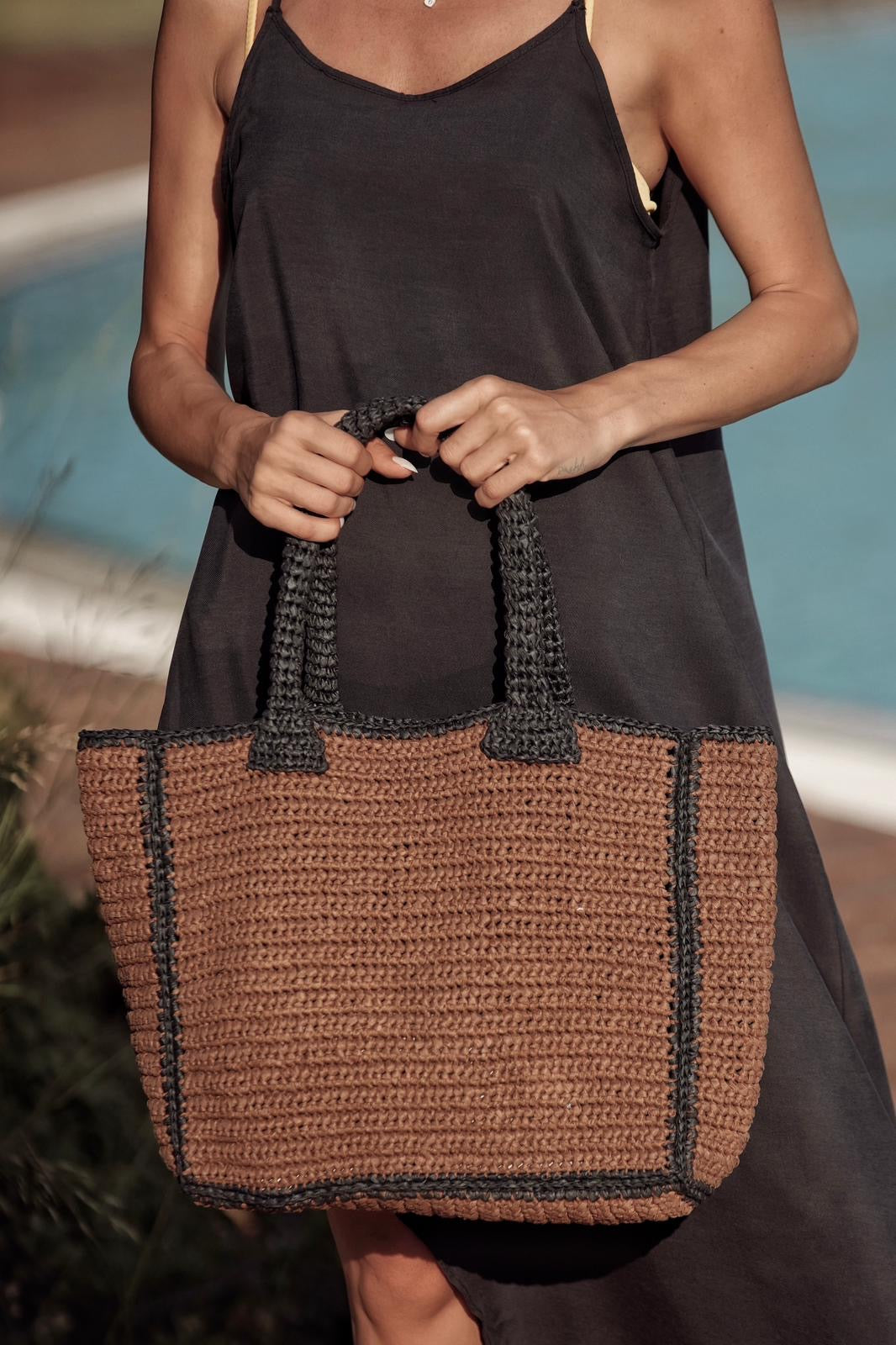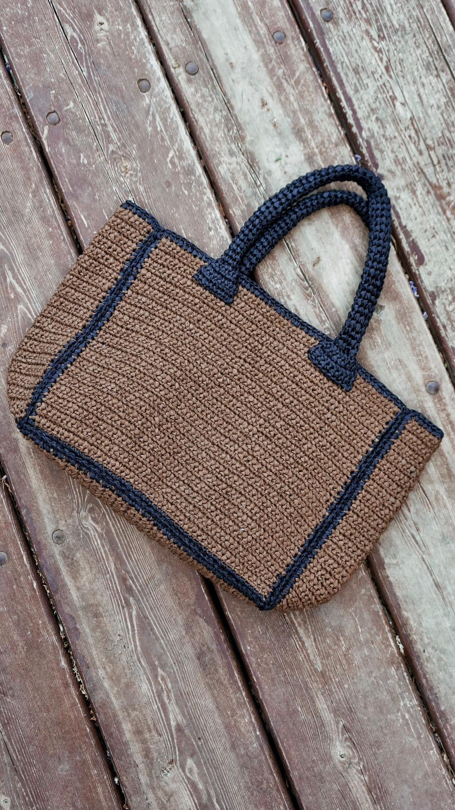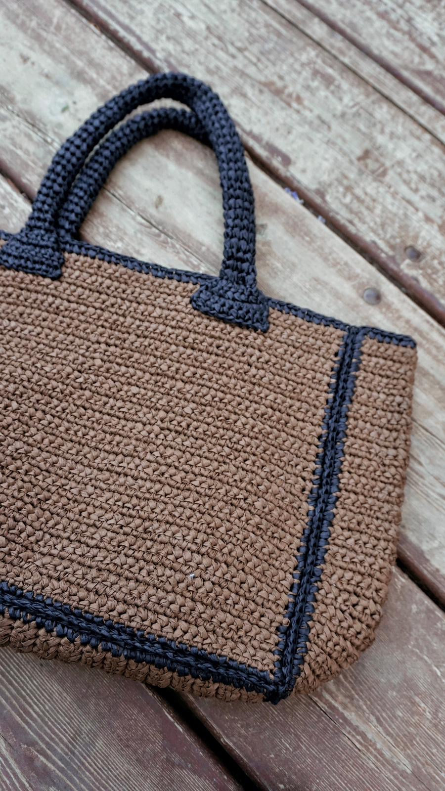 Kahve renk rafya ip ile elde örülmüş, kenar biyeleri ve sapı siyah rafya ip ve iç cep detaylı çanta